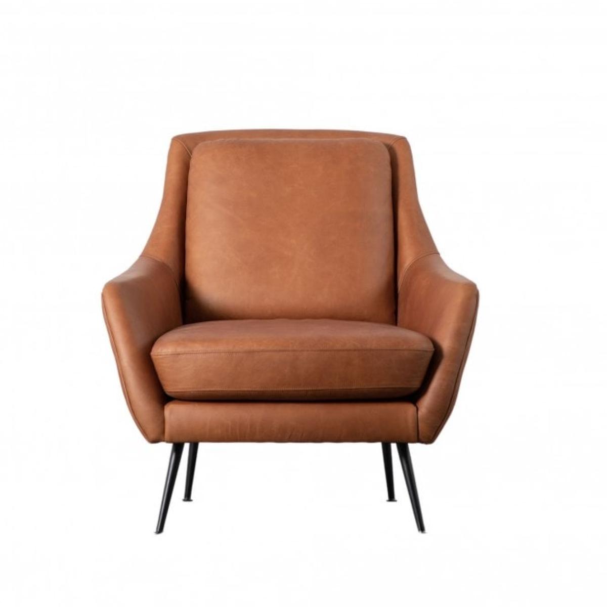 Brown leather armchair offering a retro feel, with a contemporary twist. The chair surround is fully upholstered with an upholstered fixed back cushion and loose seat cushion. Slim matt black metal legs complete the look. The Brompton is also available upholstered in grey linen. Material:Ash / Plywood. Colour: Brown.