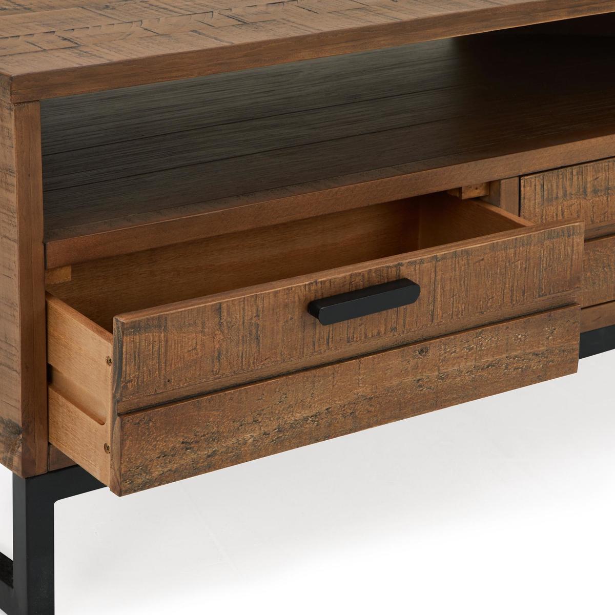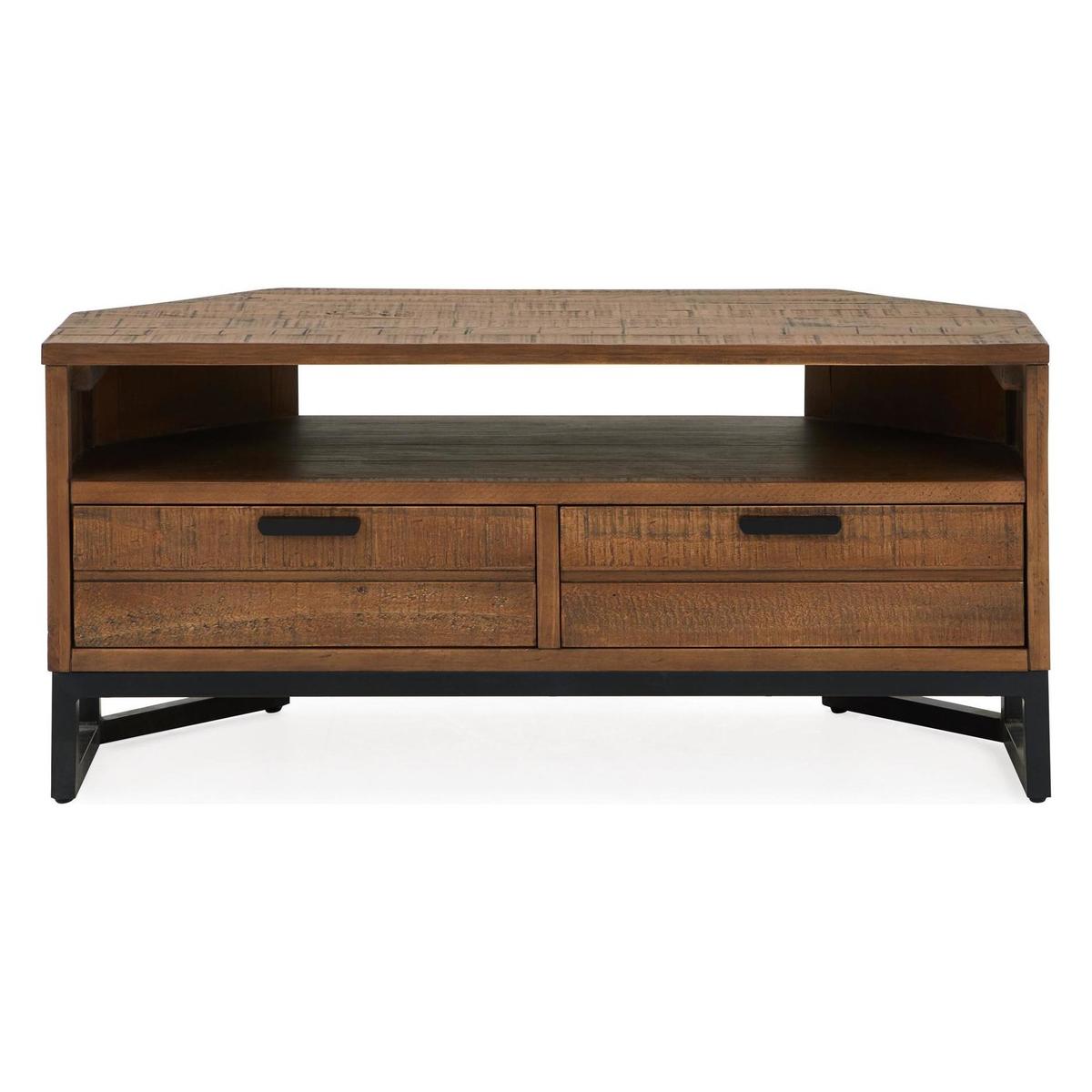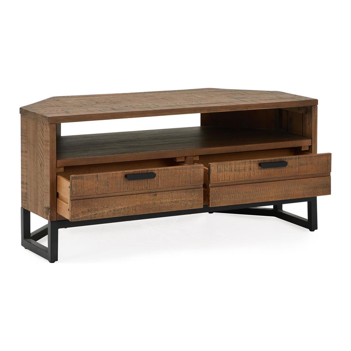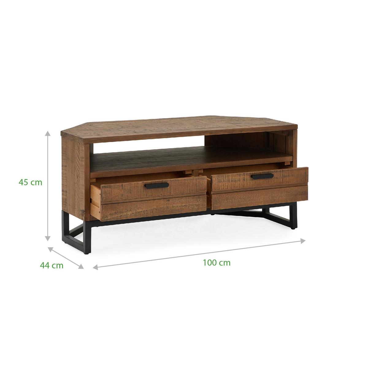 Dunelm Exclusive - Designed and Developed by Dunelm. Crafted from solid pine and pine veneer, the Jackson range boasts a mondern industrial look. The range features black metal legs and matching handles which add to the contemporary design. Complete with two spacious drawers with wooden runners and an open shelf perfect for consoles and media devices, the fully assembled Jackson corner TV stand would be a great addition to any living space.
