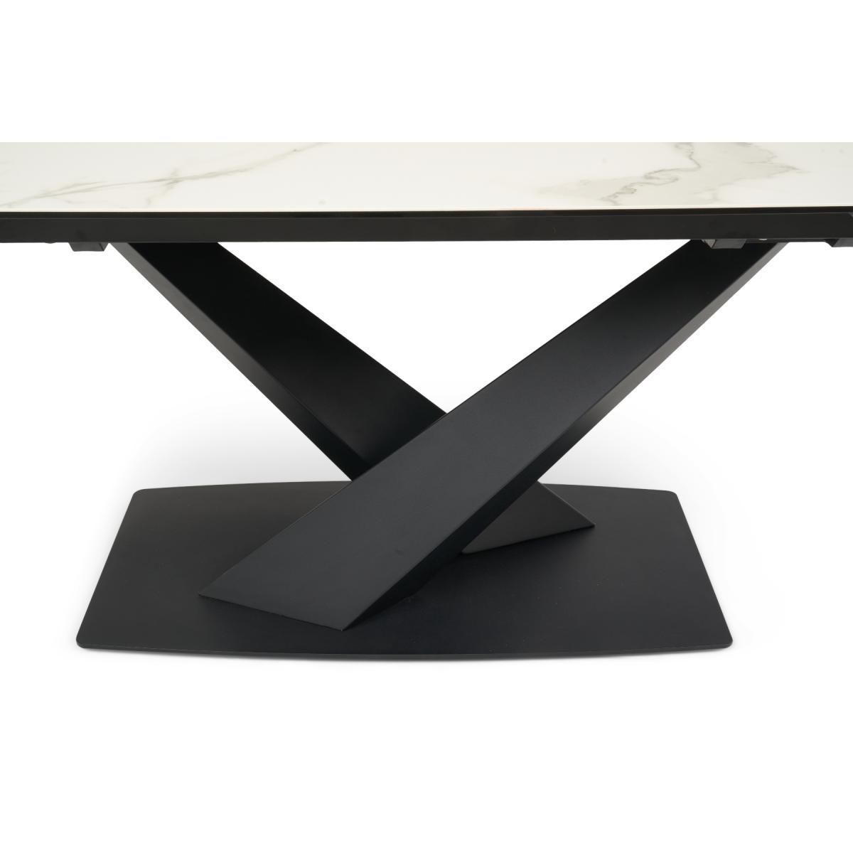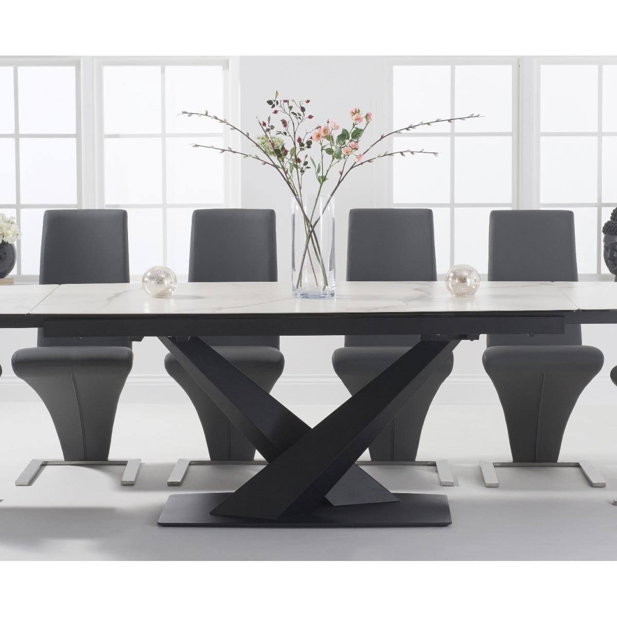 The Jacob 180cm Extending White Ceramic Table with Hampstead Z Chairs is a stylish and modern dining set. With a ceramic table top, the Jacob seats 8 and extends to seat 12 and is matched here with faux leather Hampstead Z Chairs. Striking dining set with white ceramic dining table Smooth 3mm white ceramic finish on glass table top Black metal legs in distinct crossed design. Seats 8 and extends via inbuilt feature to seat 12. Table extends at both ends. Wipe-clean for simple maintenance Faux leather Hampstead Z Chairs complete the look. Unique Z design with faux leather and brushed metal feet