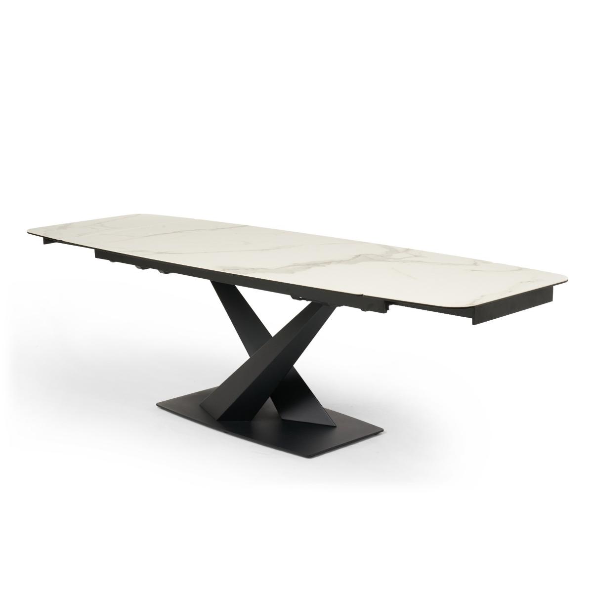 Featuring industrial styling, an ultra-modern ceramic top and the useful function of being able to extend, the 180cm mink Jacob table is perfect for modern living and adaptable to your space. Amp up the style factor by adding the Tarin chairs, as seen here. Stunning cross over design. Black metal base3mm ceramic finish on glass table top. Extends at both ends180cm table