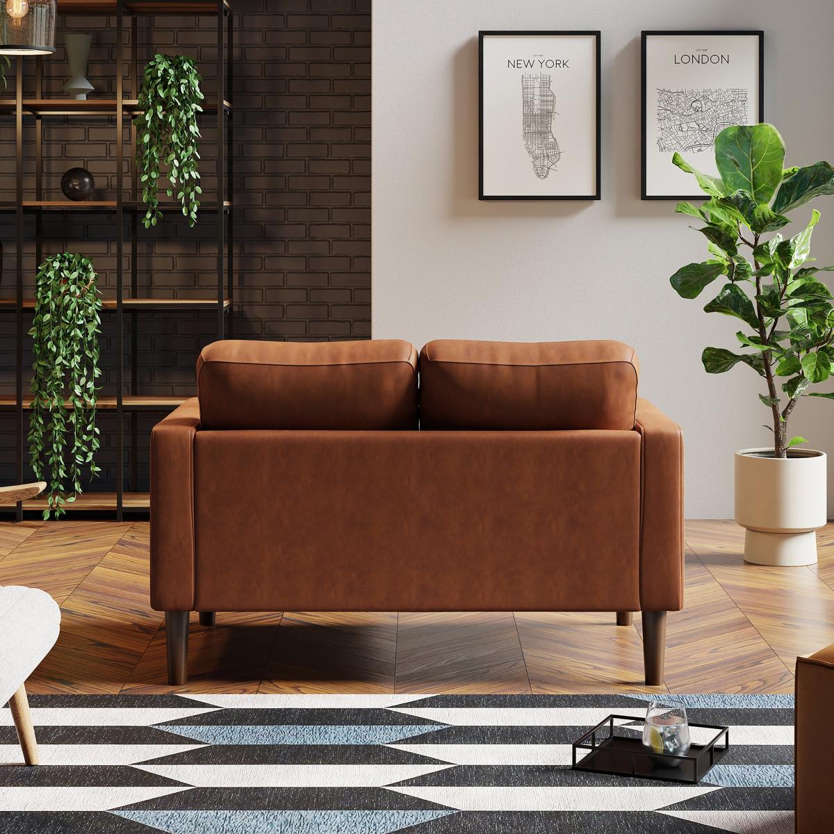 I love this small sofa for its clean lines and versatile faux leather finish, which makes it a practical choice for both contemporary and transitional interiors. The tan colour adds warmth and can easily be paired with neutral tones or bold accent colours for a layered look. It works particularly well in smaller living spaces, apartments, or as a statement piece in a larger room. To style it effectively, consider adding textured cushions in contrasting or complementary shades, and place it alongside sleek coffee tables or plants to create a cosy yet polished vibe. Its compact size and neutral tone make it adaptable, so don’t be afraid to experiment with different accessories to suit your space.
