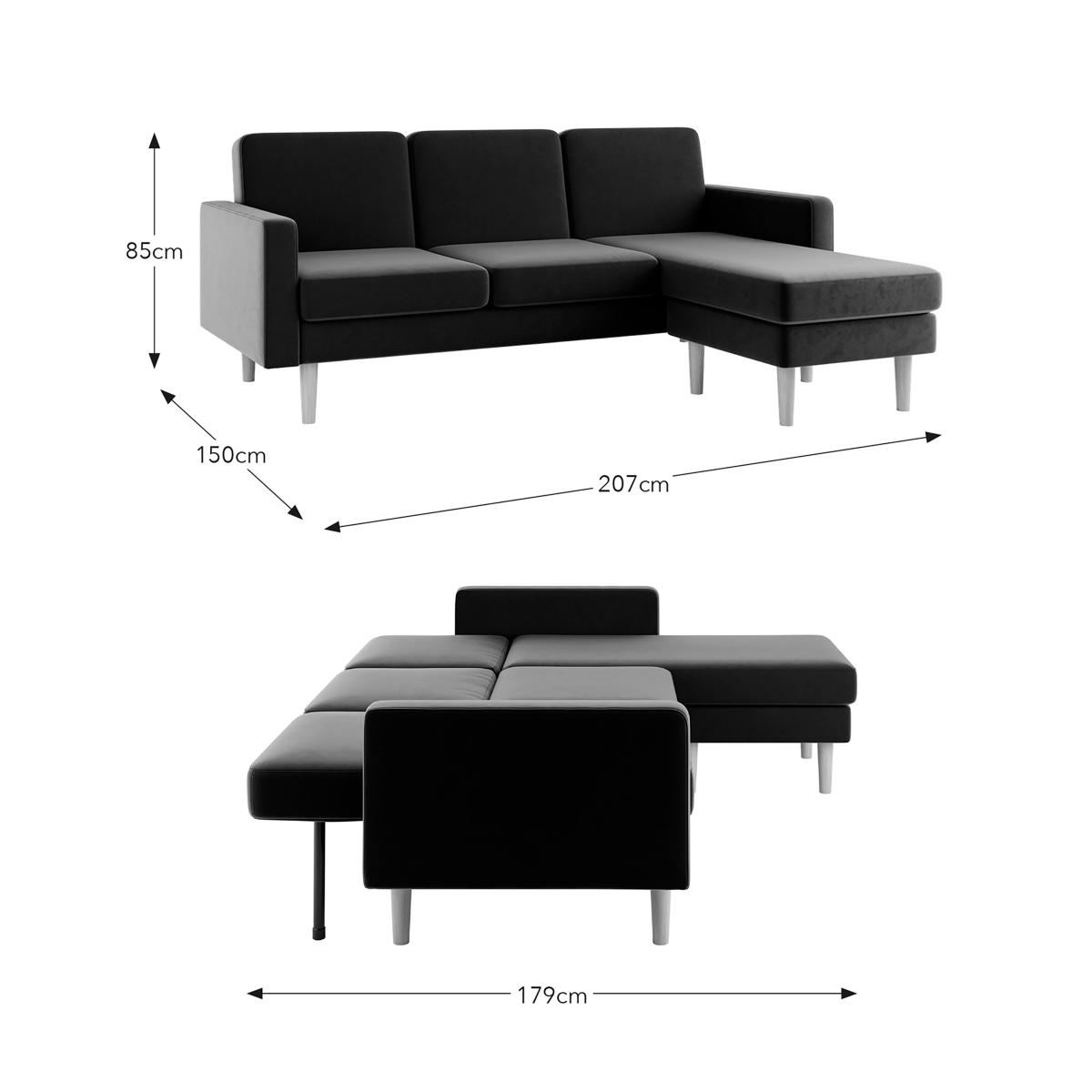 Crafted with sumptuous velvet upholstery, this corner sofabed exudes opulence and sophistication, instantly elevating the aesthetics of your living space. Whether you're hosting guests or simply looking for a comfortable seating option, this sofabed effortlessly transforms into a spacious sleeping area, ensuring your guests have a restful night's sleep. The rich, tactile quality of the velvet fabric not only adds visual allure but also creates a soft and inviting touch, making it a pleasure to lounge on. Its corner design maximizes seating space, making it perfect for large gatherings, while the pull-out bed mechanism ensures that it caters to your unexpected guest needs.