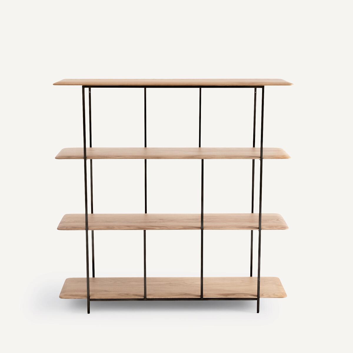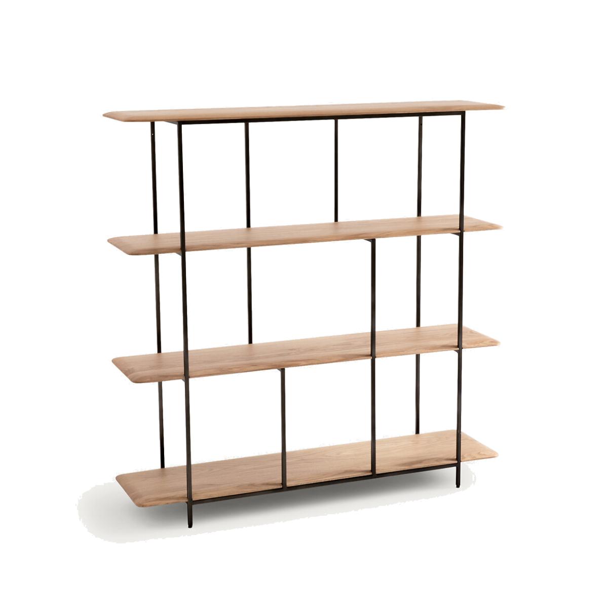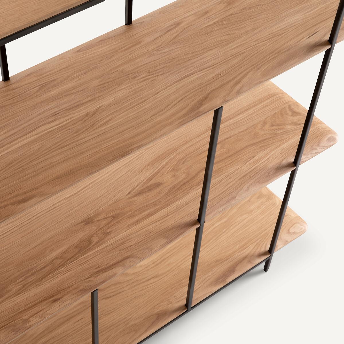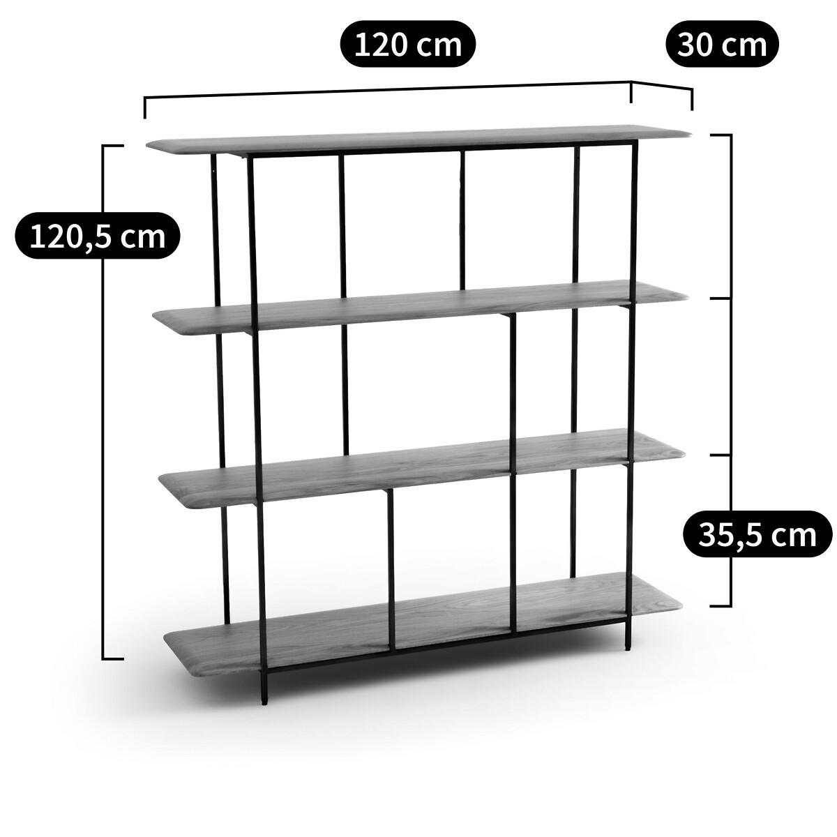 The Jacobson bookcase has a light and graphic line with slightly rounded shelves in the shape of a plane wing. Product Details • Metal structure with epoxy finish • 4 shelves in solid oak, polyurethane finish • Plane wing shaped shelves • Fixes to the wall • Adjustable feetDimensions. Total • Width: 120cm • Height: 120.5cm • Depth: 30cm. Usable dimensions • Space between each shelf: 35.5cm Delivery:Sold pre-assembled. Available for home delivery. Note! Please check that all access points are large enough to accommodate your delivery (doors, stairs, lifts). • WOOD FROM SUSTAINABLY MANAGED FORESTS. FSC® certified wood comes from forests that are environmentally, socially and economically well managed. Dimensions and weight of parcel • L126 x H130 x D37cm. 26kg