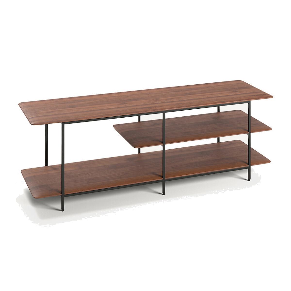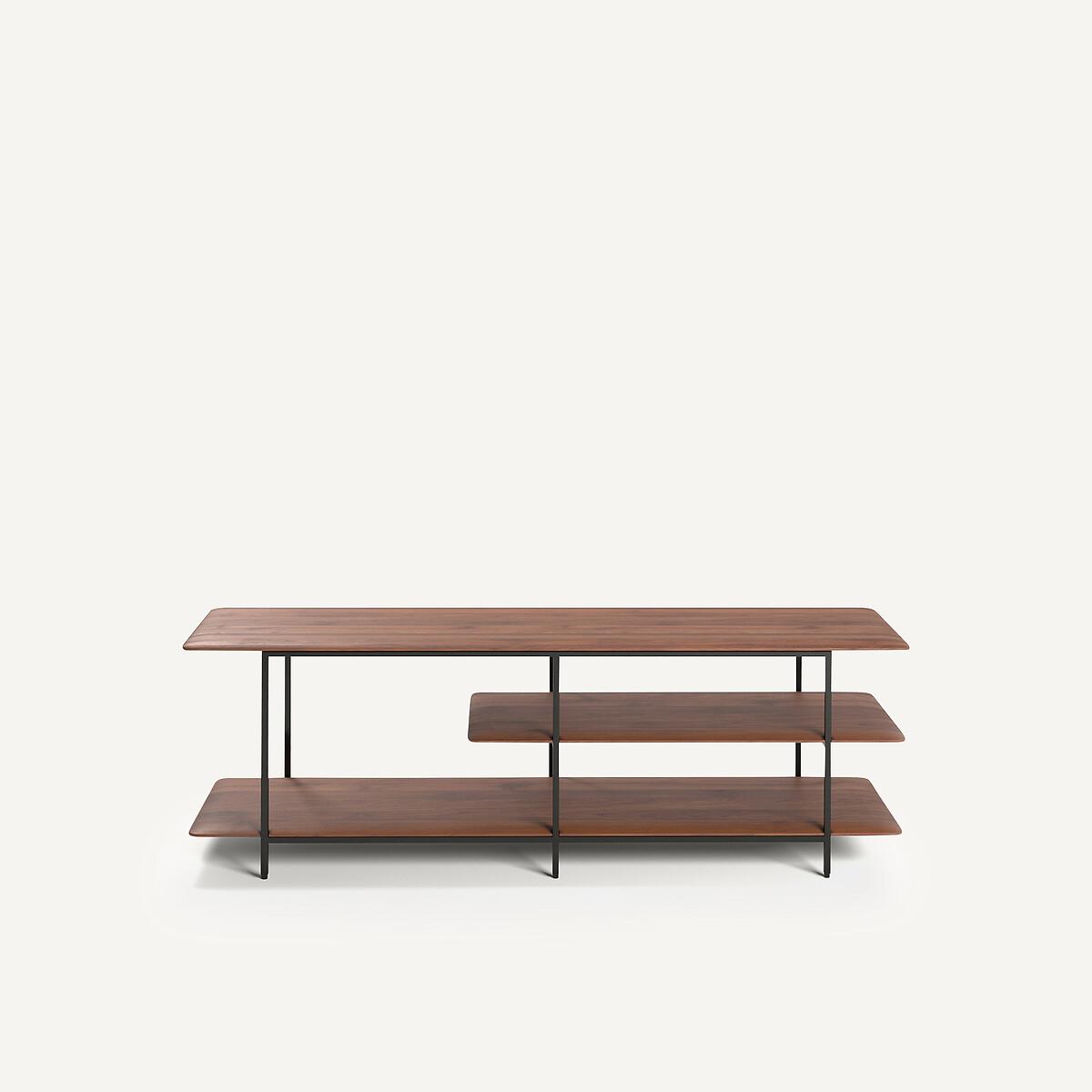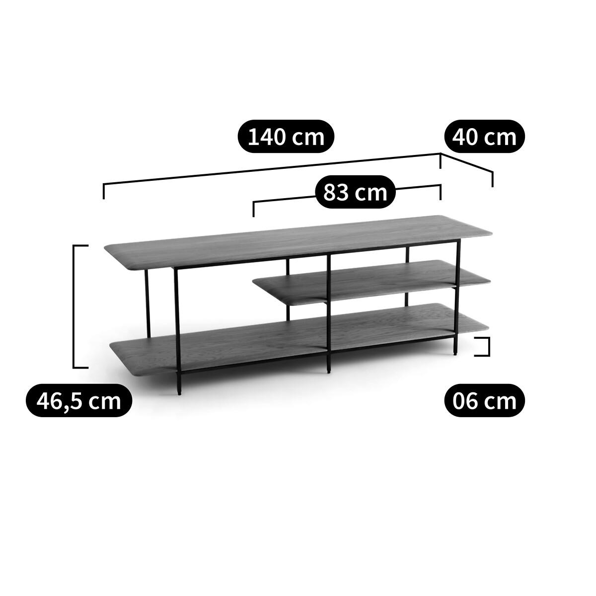 Jacobson TV/Hi. Fi stand. A light and graphic shape with softly rounded wing-shaped shelves. Product Details • Metal structure with epoxy finish • Shelves in solid walnut with polyurethane finish • Supplied ready assembled. Dimensions • L140 x H46 x D40cm • WOOD FROM SUSTAINABLY MANAGED FORESTS. FSC® certified wood comes from forests that are environmentally, socially and economically well managed. Dimensions and weight of parcel • L147 x H54 x D47cm • 22kg