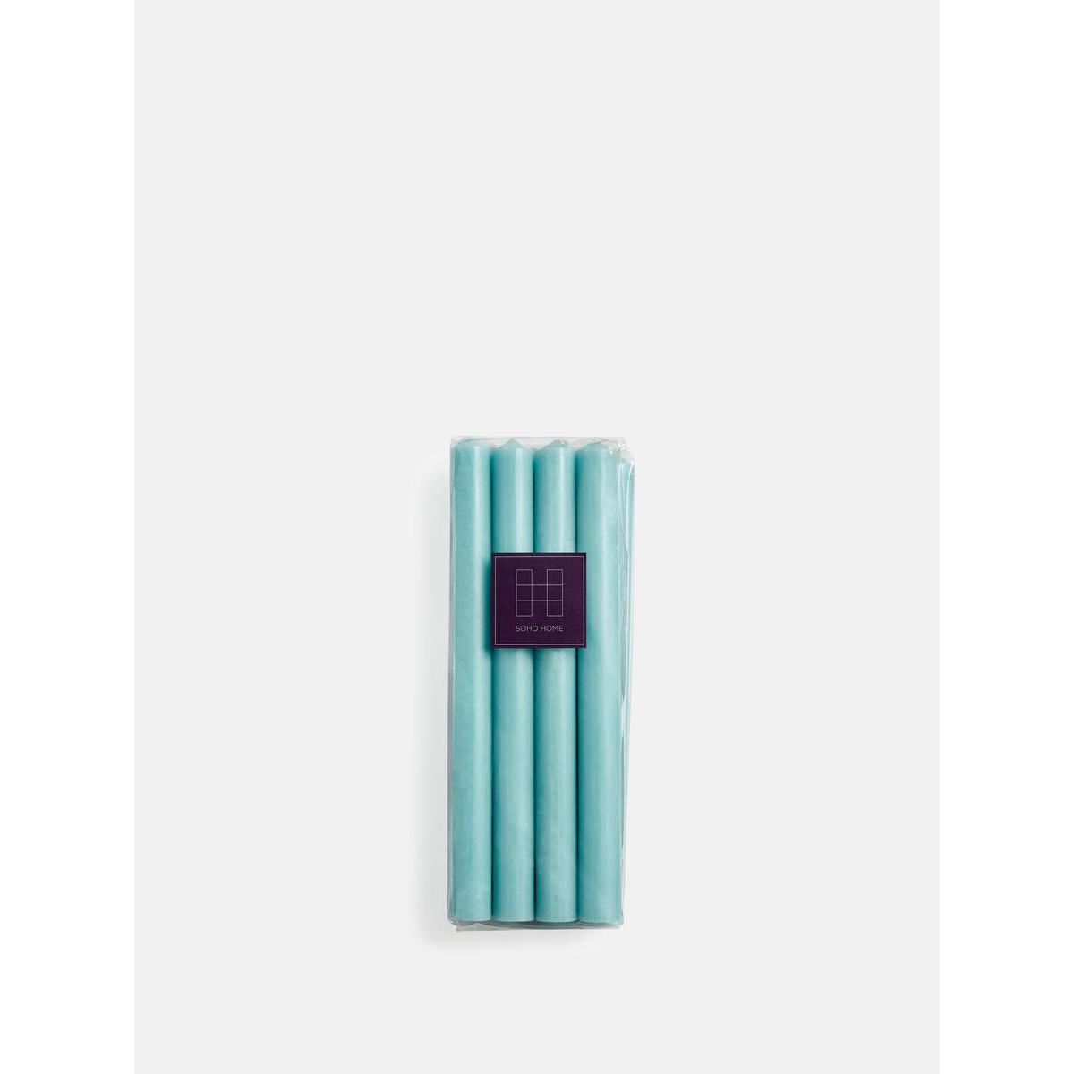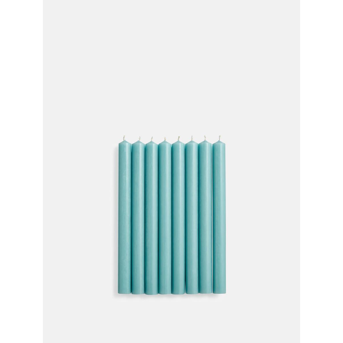 Set of eight tapered dinner candles in jade green. Made in England. Mineral wax is drip free and creates a soft light and minimalsmoke. 12 hour burn time. Use with our brass candlestick or five-arm candelabra.