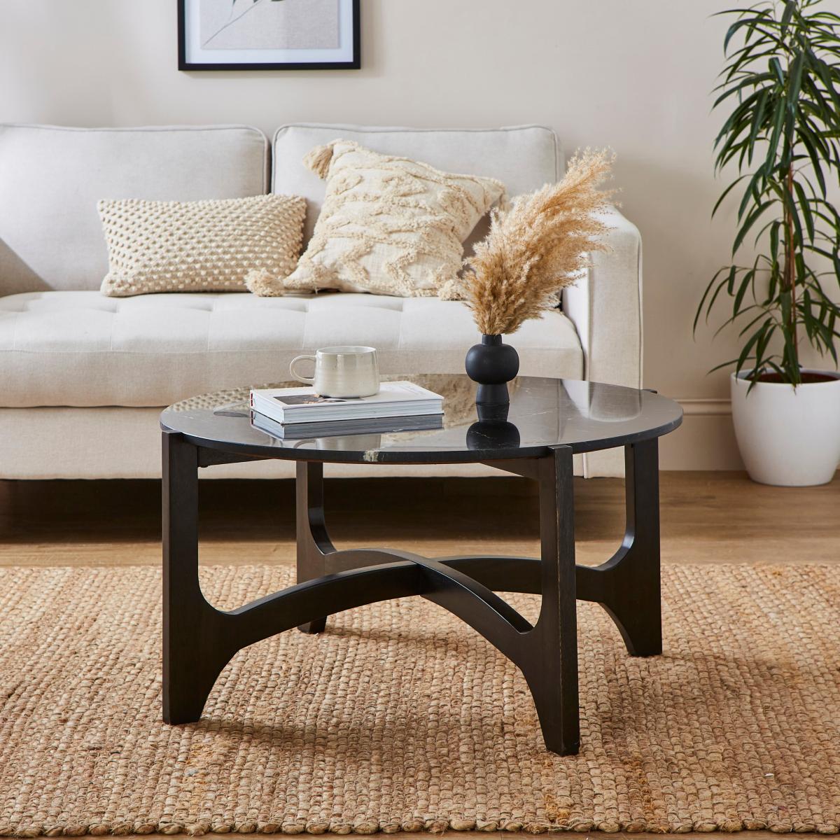 The Jae coffee table in marble black offers a sleek, contemporary touch that works well in both minimalist and modern interiors. I love its clean lines and striking dark finish, which instantly elevates a neutral colour palette. It pairs beautifully with natural textures, such as the woven rug in the image, and can serve as a versatile base for styling with accessories like candles, books, or small decorative objects. For practical tips, try contrasting it with lighter furniture to create visual interest, or position it centrally in a seating area to anchor the space while maintaining an airy feel. Its understated elegance makes it a reliable piece that complements a variety of décor styles without overpowering them.