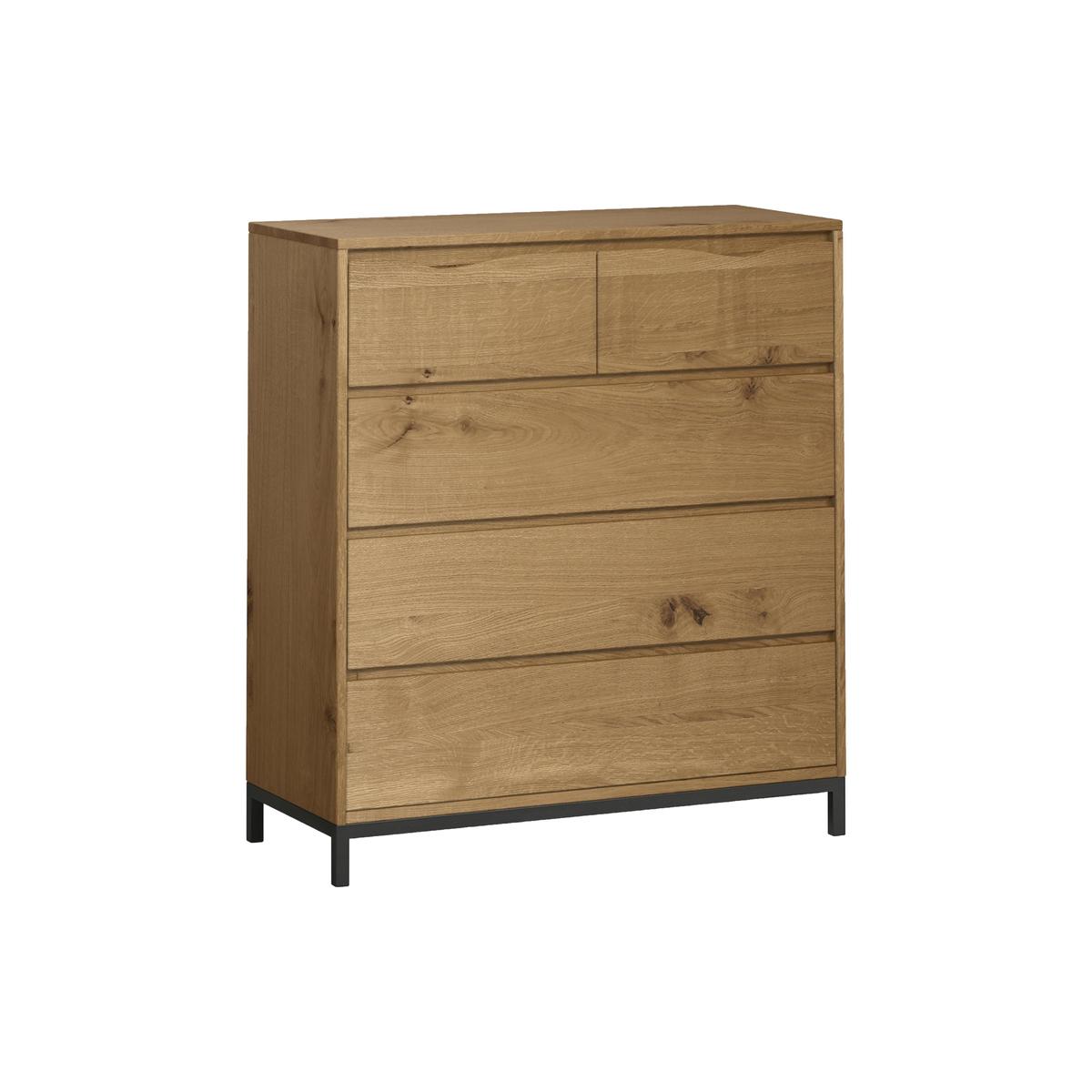Bold and distinctive industrial style with a rustic feel. The stunning live edge means that every piece is unique. Crafted from oak, oak veneer and black powder-coated steel. The fabulous Jagger 2+3 drawer chest has a unique and authentic difference that sets it apart from other bedroom chests of drawers – the top two drawers display the continuous live edge of the wood from which it has been crafted. It’s a stunning design feature that, along with giving this piece bold rustic style, ensures that each piece in the collection is absolutely unique. Crafted from oak and oak veneer with a stylish waxed finish and set on a sturdy black powder-coated steel base, this large chest of drawers delivers on storage as well as style. The upper two drawers are perfect for accessories and smaller items while the three lower drawers, deep and roomy, make tidy work of bedroom storage. Beautifully crafted, the Jagger 2+3 drawer chest is part of the Jagger bedroom furniture collection, and is one of several chests of drawers in the range. The collection also includes bedframes, wardrobes and bedside cabinets, all of which feature the signature Jagger live edge. Please note: Each one-of-a-kind Jagger piece features a sustainably harvested solid live edge. A live edge shows the original lines of the wood’s trunk in a very raw state with characterful colour variations, knots and silvery markings known as medullary rays. As these aesthetic features are not always practical, we fill them to create a smooth waxed surface that’s also easier to care for.