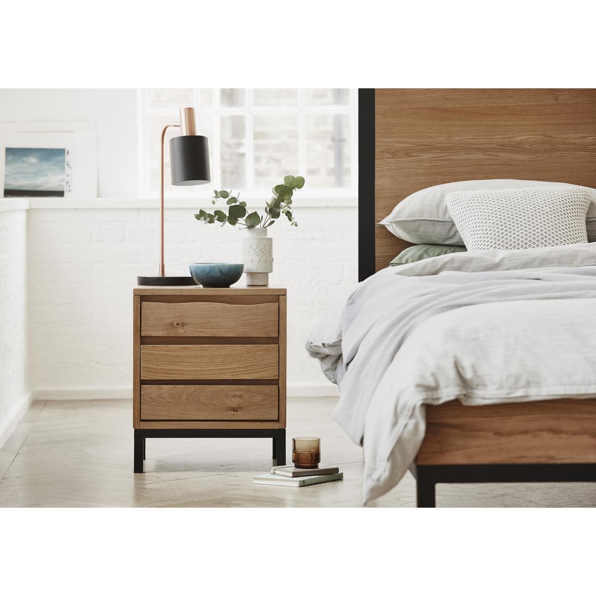 Bold and distinctive industrial style with a rustic feel. The stunning live edge means that every piece is unique. Crafted from oak, oak veneer and black powder-coated steel. The Jagger 3 drawer bedside table, like all the pieces in the Jagger bedroom furniture collection, features a live edge – the real edge of the wood from which it has been crafted, and a unique and distinctive feature. This three drawer bedside cabinet is made from oak and oak veneer with a smooth waxed finish and rests on a simple black powder-coated steel base. It’s the perfect partner to either of the Jagger bedframes but also, thanks to its three roomy drawers, provides roomy storage in its own right. The Jagger 3 drawer bedside table is part of the fabulous Jagger bedroom furniture collection which includes chests of drawers, two sizes of wardrobes and two bedframes. Every piece features the collection’s signature live edge, an aspect which ensures that no two pieces of Jagger bedroom furniture are alike. This bedside cabinet is compatible with the Jagger bedside phone charger, which turns its top into a smartphone charger. Call 0800 804 8879 to learn more. Please note: Each one-of-a-kind Jagger piece features a sustainably harvested solid live edge. A live edge shows the original lines of the wood’s trunk in a very raw state with characterful colour variations, knots and silvery markings known as medullary rays. As these aesthetic features are not always practical, we fill them to create a smooth waxed surface that’s also easier to care for.