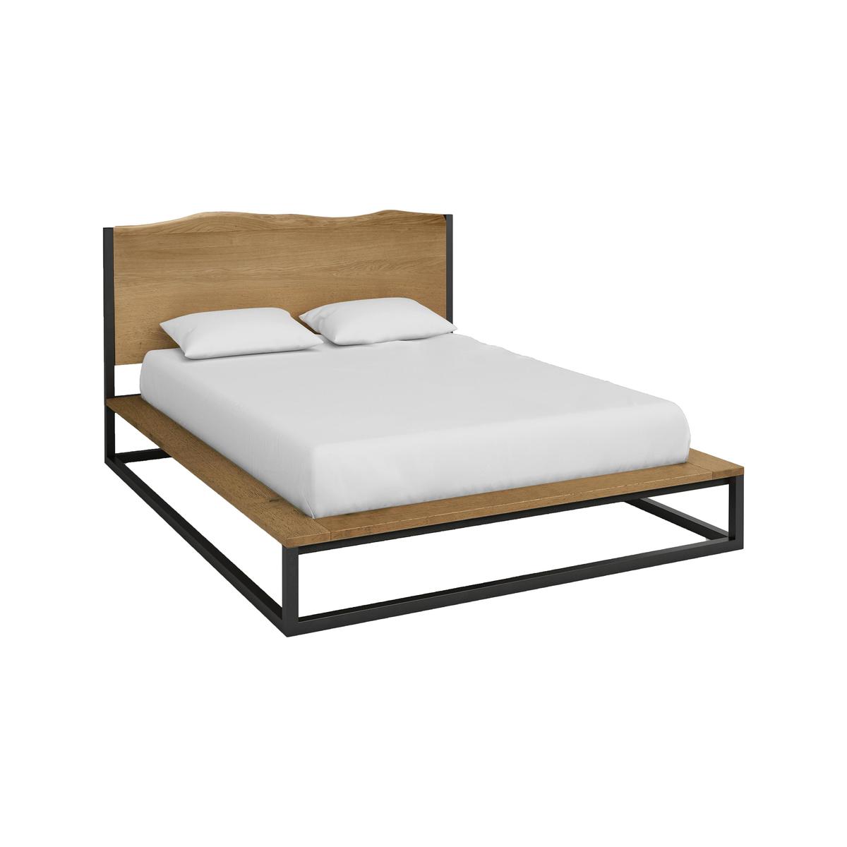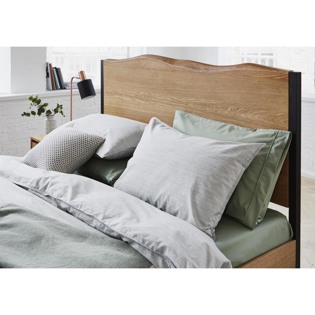 Bold and distinctive industrial style with a rustic feel. The stunning live edge means that every piece is unique. Crafted from oak, oak veneer and black powder-coated steel. The headboard of the industrial-style Jagger platform bed frame incorporates the stunning live edge of the real oak from which it is crafted. Beautiful, bold and with something of a zen-like quality, this eye-catching feature means that each Jagger platform bed frame is different from the next. Sleep in it and there’s no doubt that you’ll feel connected to nature thanks to the headboard’s organically curved edge that follows the natural structure of the wood, its beautiful wood grain and its gorgeous warm wood tone. Crafted from oak and oak veneer with a waxed finish, this platform bed features an open base and headboard edged in black powder-coated steel, so on trend. The wonderfully rustic Jagger platform bed frame is available in both double and king bed sizes and is suitable for any standard type of mattress. It’s part of the Jagger bedroom collection which offers equally stunning wardrobes, chests of drawers and bedside tables. The range also includes the Jagger bedframe, a more traditional version of this platform bedframe. Mattress available separately. Please note: Each one-of-a-kind Jagger piece features a sustainably harvested solid live edge. A live edge shows the original lines of the wood’s trunk in a very raw state with characterful colour variations, knots and silvery markings known as medullary rays. As these aesthetic features are not always practical, we fill them to create a smooth waxed surface that’s also easier to care for.