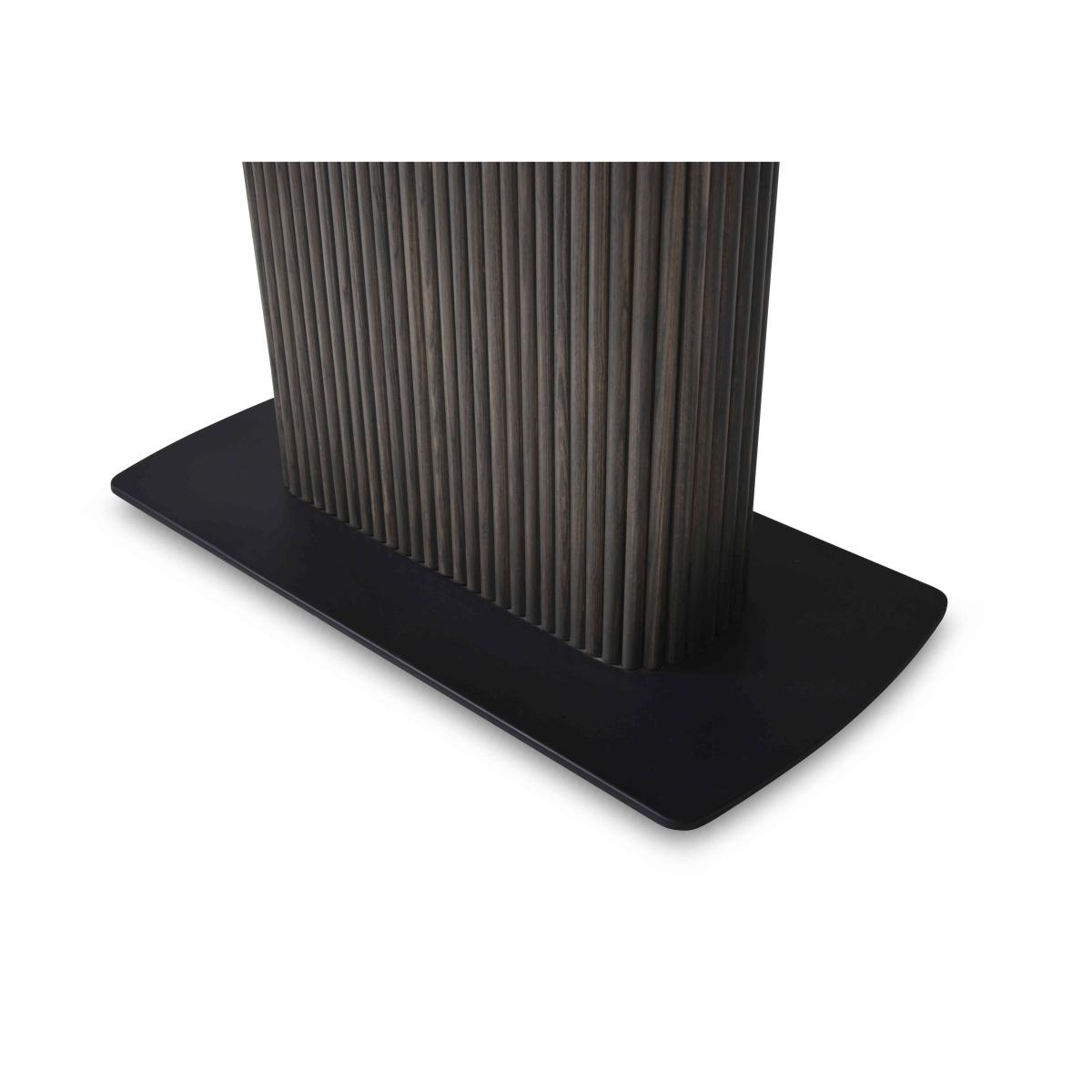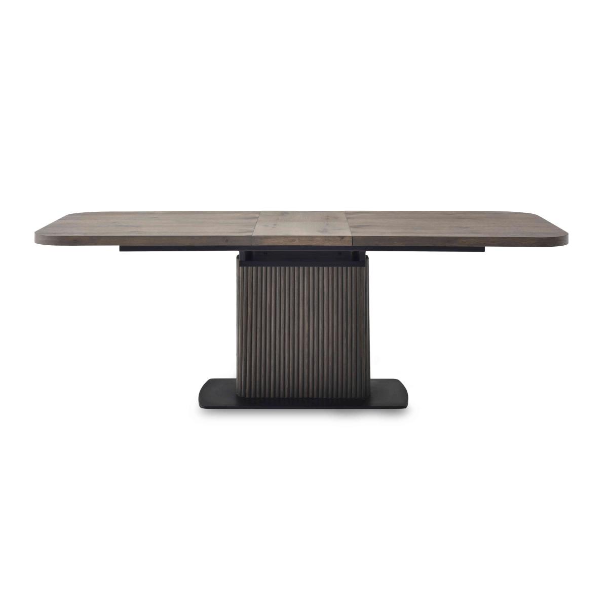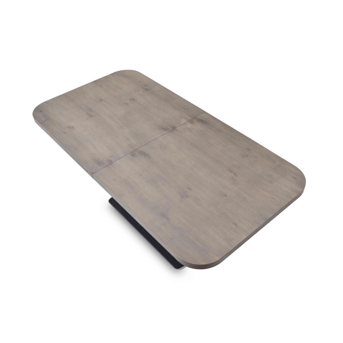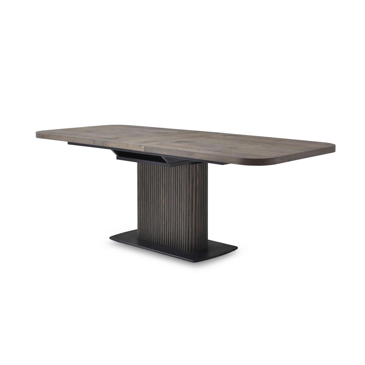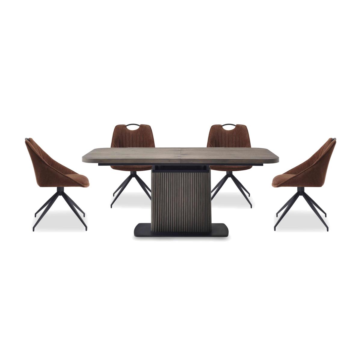 With its dark oak veneer finish, this large Jai dining set brings modern urban style to any dining space. This set includes four swivel dining chairs. Why you'll love it Modern urban dining set for relaxed and stylish dining spaces. With stylish rounded corners, this dining table is well-crafted, on-trend and great value. Characterful dark oak veneer top with an antiqued finish. Easy to use butterfly mechanism extends this table in seconds. When extended, the extra leaf perfectly matches the grain of the table top. Oak pedestal base with linear grooves sits on a black metal plinth. Hardwearing and versatile – this table suits both family and formal dining spaces. Dining set includes 4 elegant dining chairs with swivel bases. Integrated handles and matt black powder-coated legs. Beautiful fabric upholstery in a choice of colours. Handcrafted for Furniture Village. This dining set is part of our Jai range. What you need to know Dining chairs have metal frames and legs, foam seat cushioning. This large extending dining table seats 8 and extends to seat 10. Every piece of veneer or solid wood has unique and natural marks, knots and colour variation. Avoid placing in direct sunlight or close to a heat source. We recommend using coasters and placemats at all times.