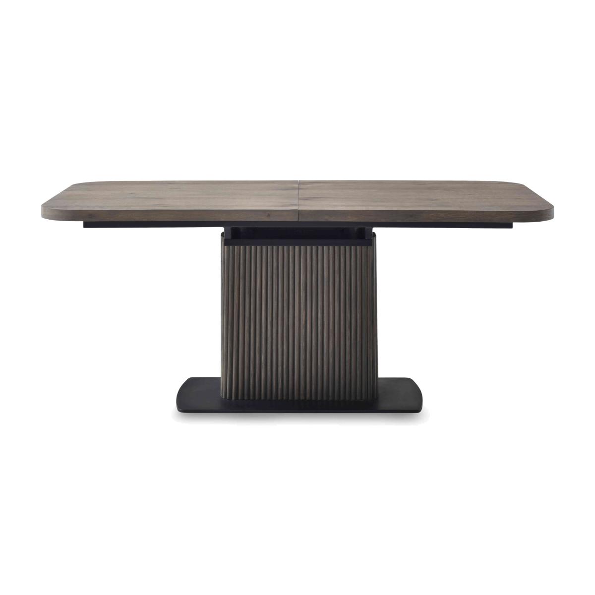 The coolest dining table around? With its antiqued dark oak veneer finish and bold pedestal base, our large Jai extending dining table is a top contender. Why you'll love it Modern urban style for relaxed dining spaces. With stylish rounded corners, this dining table is well-crafted, on-trend and great value. Characterful dark oak veneer top with an antiqued finish. Easy to use butterfly mechanism extends this table in seconds. When extended, the extra leaf perfectly matches the grain of the table top. Oak pedestal base with linear grooves sits on a black metal plinth. Hardwearing and versatile – this table suits both family and formal dining spaces. Seats up to 10. Handcrafted. A Furniture Village exclusive. This extending dining table is part of our Jai range. What you need to know This large extending dining table seats 8 and extends to seat 10. Every piece of veneer or solid wood has unique and natural marks, knots and colour variation. Avoid placing in direct sunlight or close to a heat source. We recommend using coasters and placemats at all times.