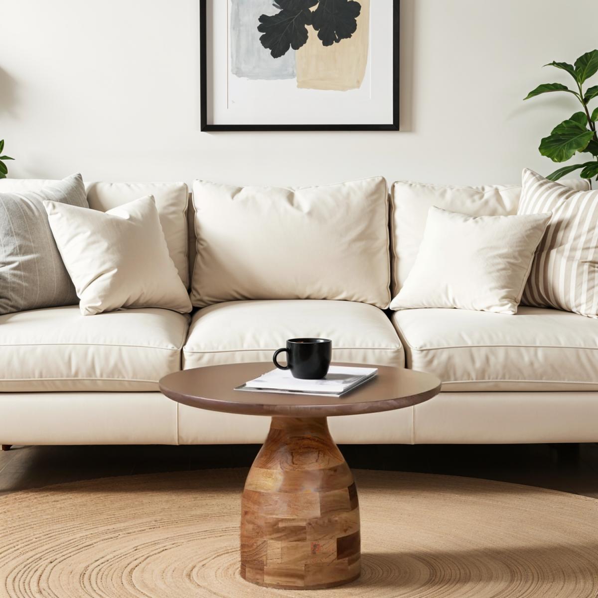 This round coffee table is a statement piece that effortlessly blends modern aesthetics with a touch of rustic charm. Its unique design with a round top and sculpted base creates a visually appealing silhouette. Crafted from natural acacia wood, this piece adds a touch of warmth and texture to your living space.