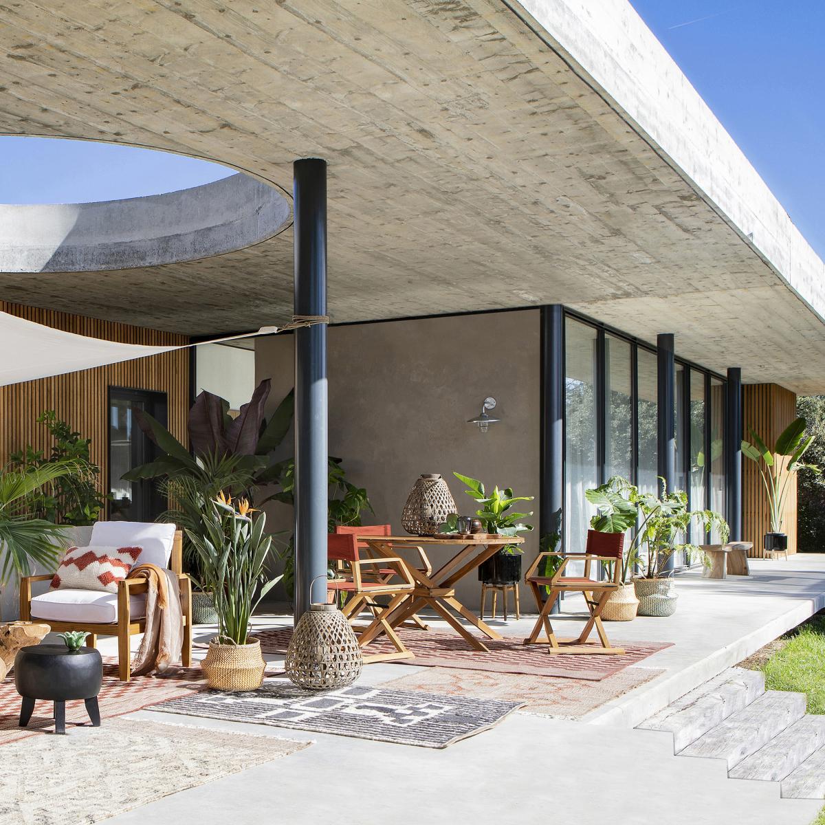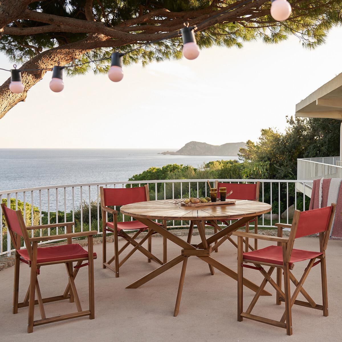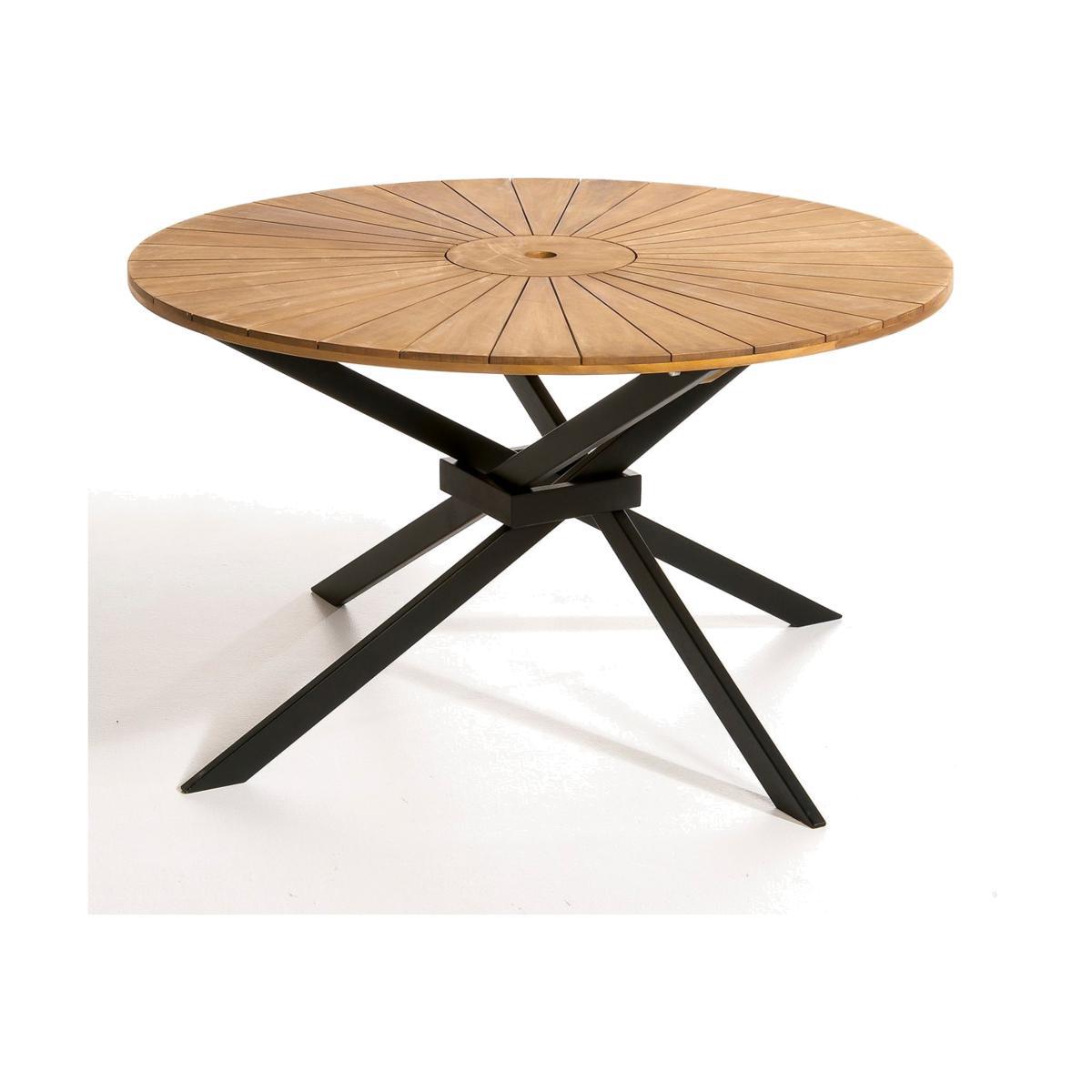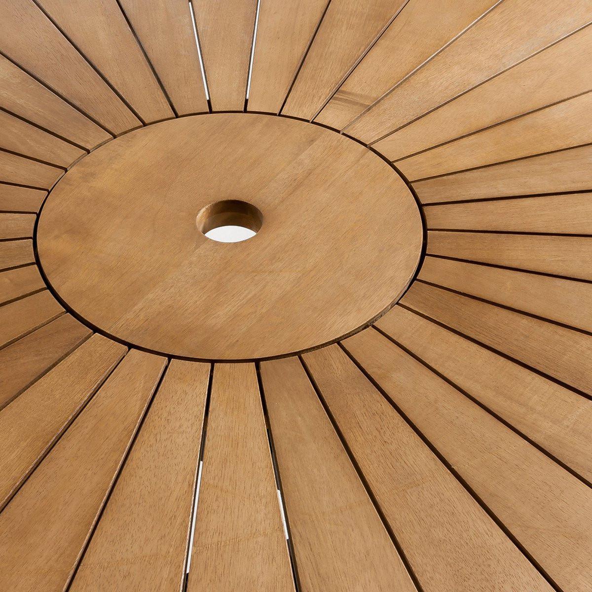 Jakta garden table. An outdoor table that will brighten up your patio in all weathers. Crafted from naturally hardy acacia wood. Product Details:. Acacia. Two-tone version: Teak-stained tabletop, matt black base. Natural version: tabletop and base in teak-stained wood. Ready to assemble, instructions supplied. Care advice :. In case of staining, clean immediately with water and, if necessary, with mild detergent. Since wood is a living material, cracks may appear over time. They do not affect the quality of the product. To maintain your acacia garden furniture, you can either let it age naturally, to take on a beautiful silvery grey colour, or treat it (see instructions included with packaging). To prevent decay of the base, avoid direct contact with wet ground. During winter: Do not cover your furniture. Store in a well-ventilated room, preferably one without central heating. Dimensions:. Diameter 130 x H75cm. Dimensions and package weight :. L134 x H8.5 x D132.5cm, 22kg. Home delivery :Your table will be delivered to your door ! Note ! Please check that all access points are large enough to accommodate your delivery (doors, stairs, lifts).