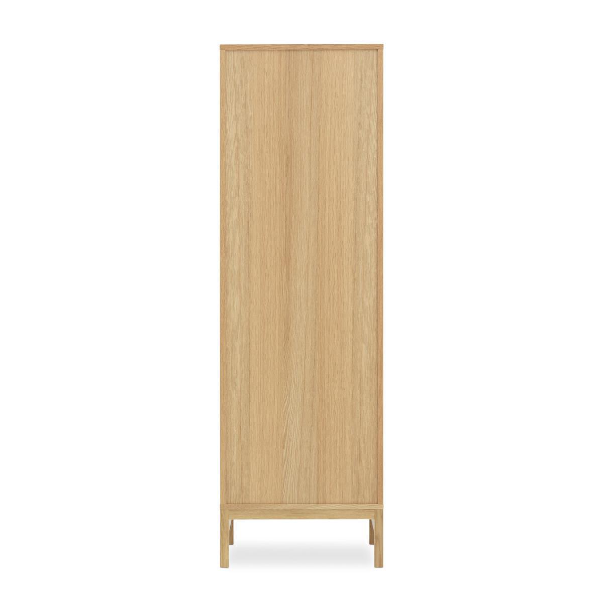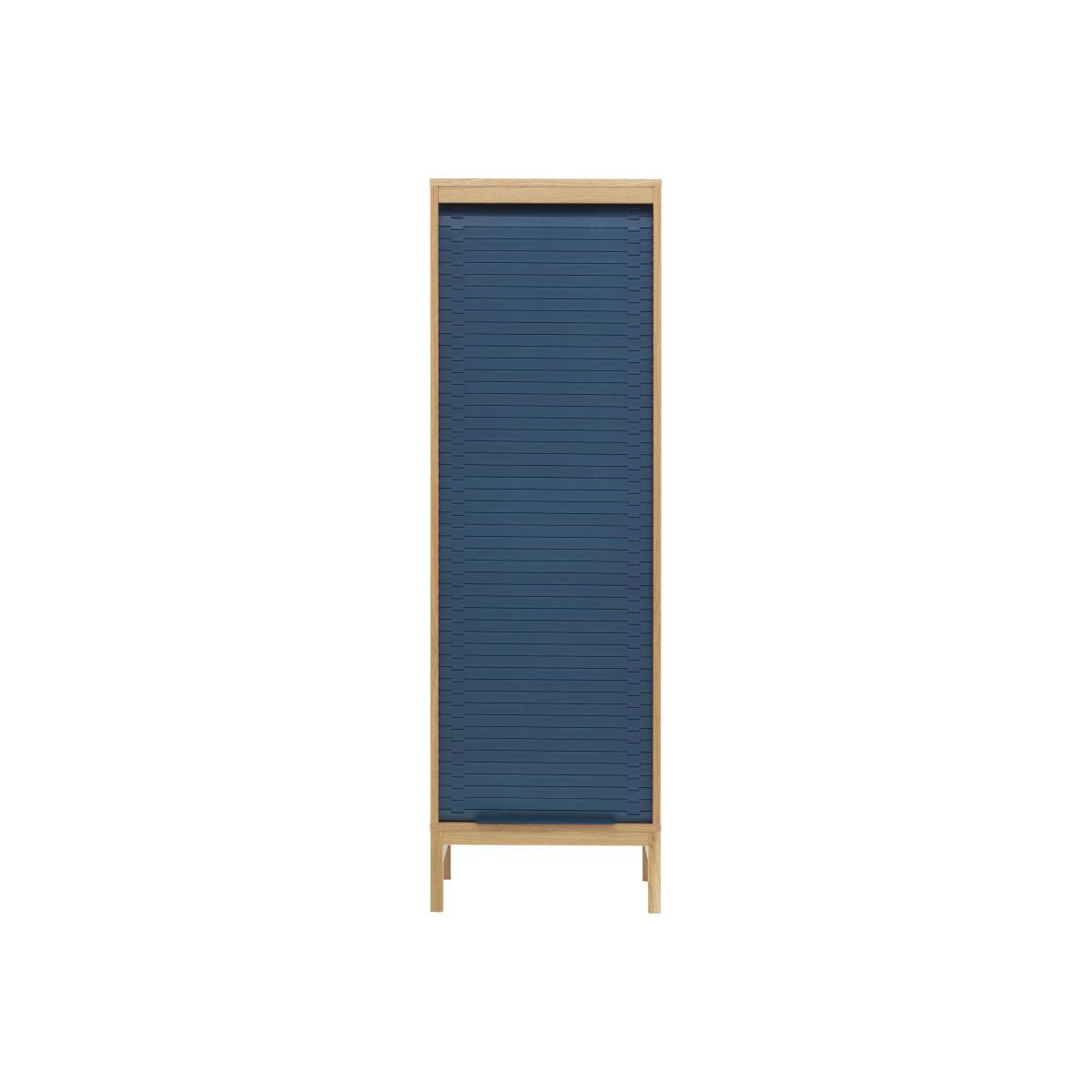 Simon Legald delivers up a new cheerful, contemporary version of the classic curtain cabinet. Like the old writing desks or industrial filing cabinet furniture, this chiffonier comes with a coloured plastic curtain door. The multitude of articulated slats form a repetitive pattern that’s geometric and highly graphic. To create this curtain door, the Danish designer had several sources of inspiration: the links of watch straps, the furniture of the 50s and even the travelators in airports! The door slides flexibly in its entirety up and down to give access to 100% of the furniture’s contents. The curtain is mounted on a fully concealed runner. Reminiscent of the raw aesthetics of the industrial world, the slatted curtain is brought fully up to date using trendy colours and their combination with natural wood. The mixture of materials is really appealing: the coloured curtain forms a wonderful contrast with the light oak. You’ll love the modern urban style of this storage unit that can be used anywhere in the house: it can take binders and supplies in an office, plates and glasses in the kitchen, books in the living room or beauty products in the bathroom.