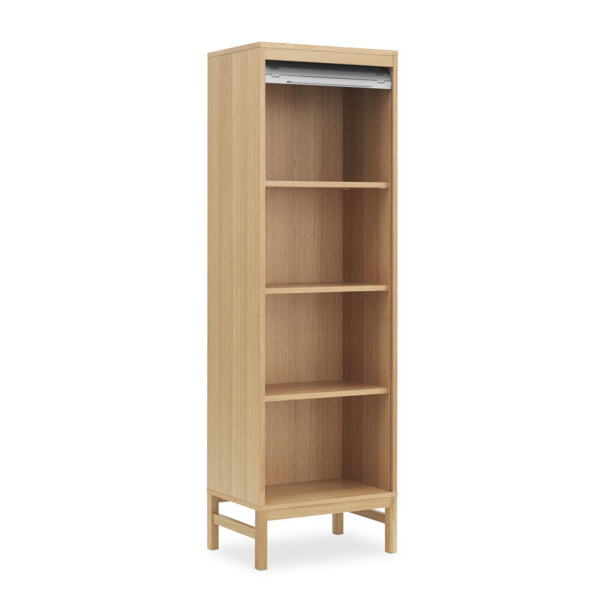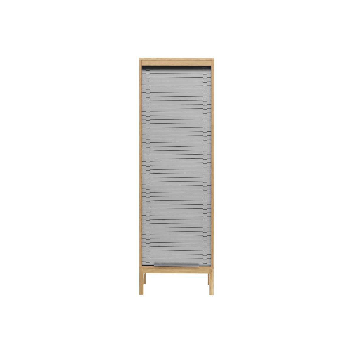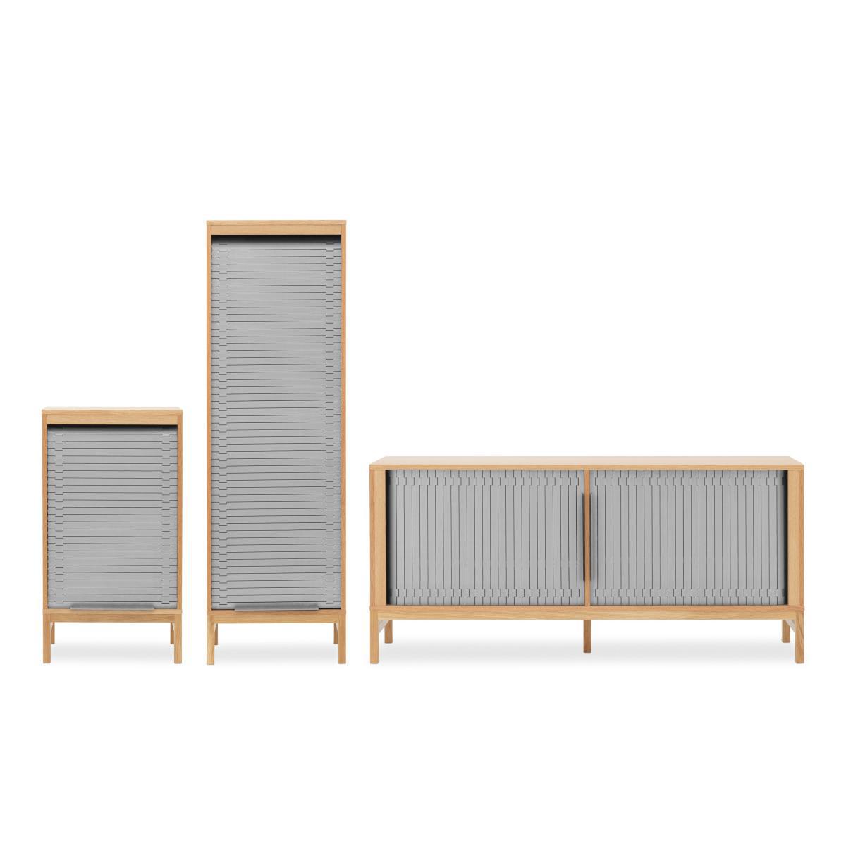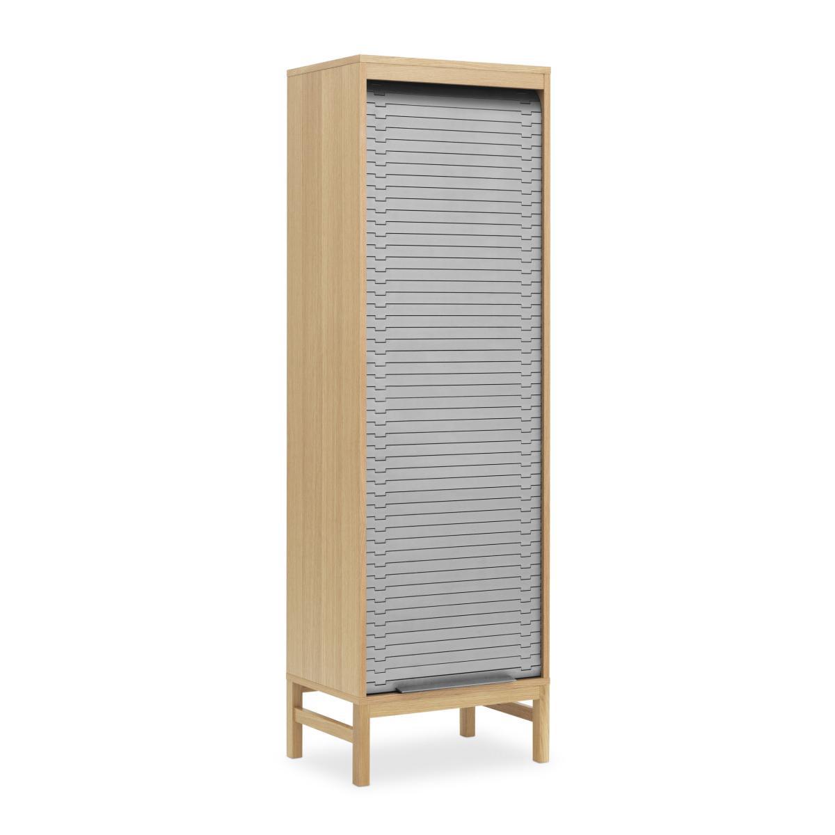 Simon Legald delivers up a new cheerful, contemporary version of the classic curtain cabinet. Like the old writing desks or industrial filing cabinet furniture, this chiffonier comes with a coloured plastic curtain door. The multitude of articulated slats form a repetitive pattern that’s geometric and highly graphic. To create this curtain door, the Danish designer had several sources of inspiration: the links of watch straps, the furniture of the 50s and even the travelators in airports! The door slides flexibly in its entirety up and down to give access to 100% of the furniture’s contents. The curtain is mounted on a fully concealed runner. Reminiscent of the raw aesthetics of the industrial world, the slatted curtain is brought fully up to date using trendy colours and their combination with natural wood. The mixture of materials is really appealing: the coloured curtain forms a wonderful contrast with the light oak. You’ll love the modern urban style of this storage unit that can be used anywhere in the house: it can take binders and supplies in an office, plates and glasses in the kitchen, books in the living room or beauty products in the bathroom.