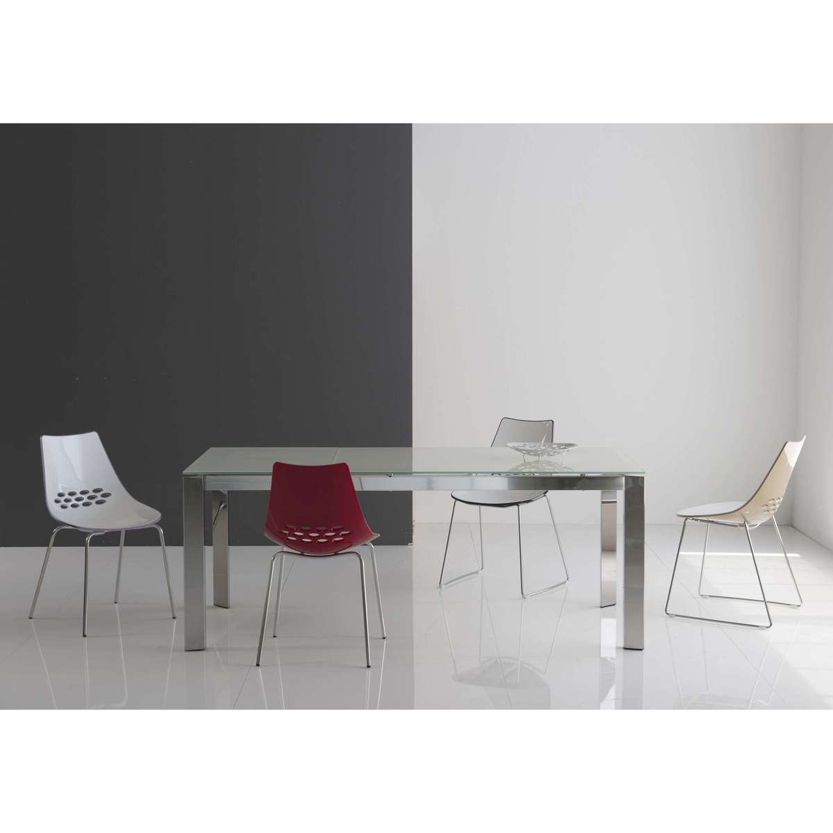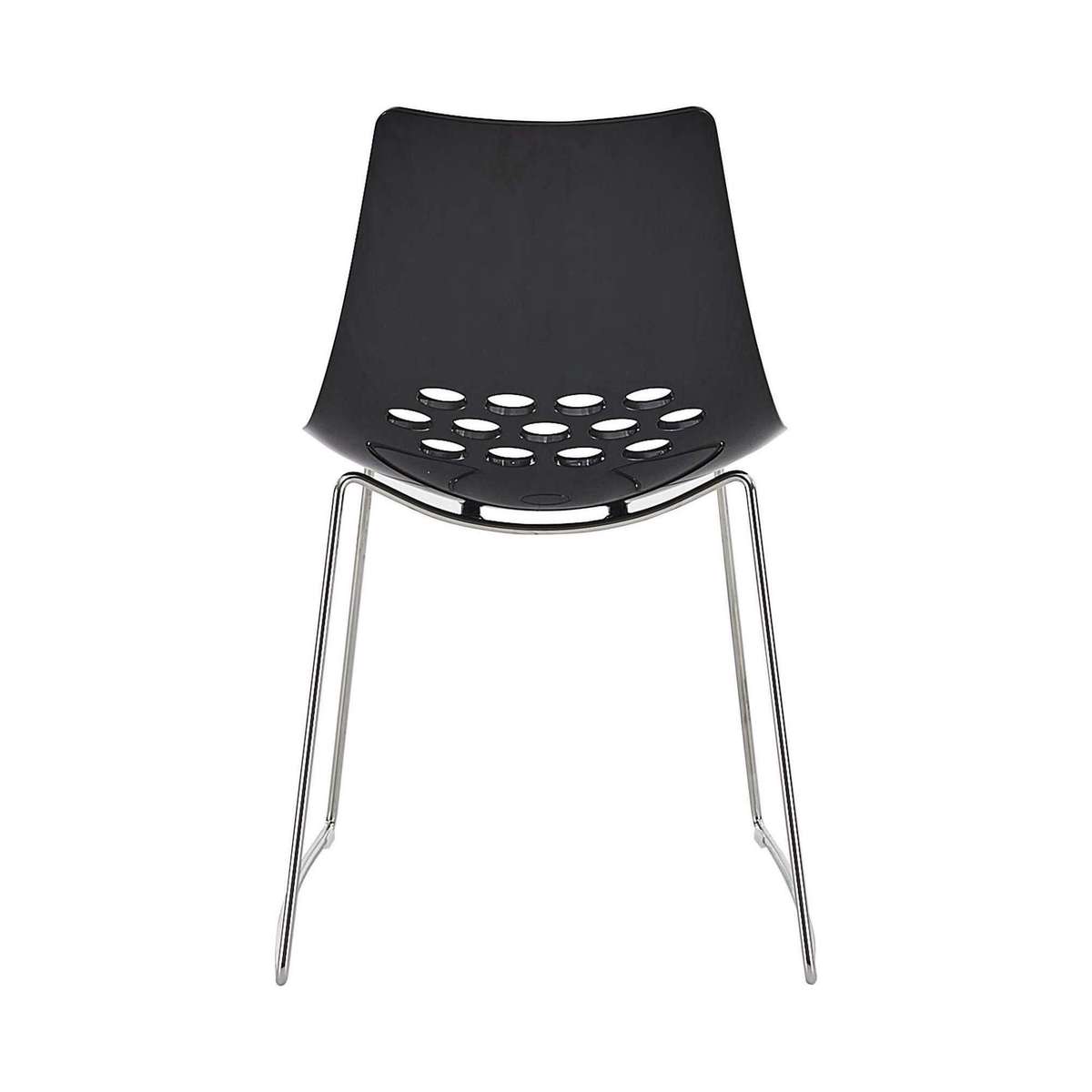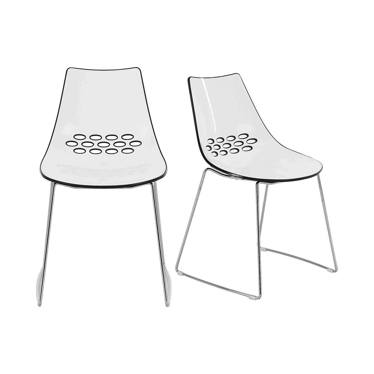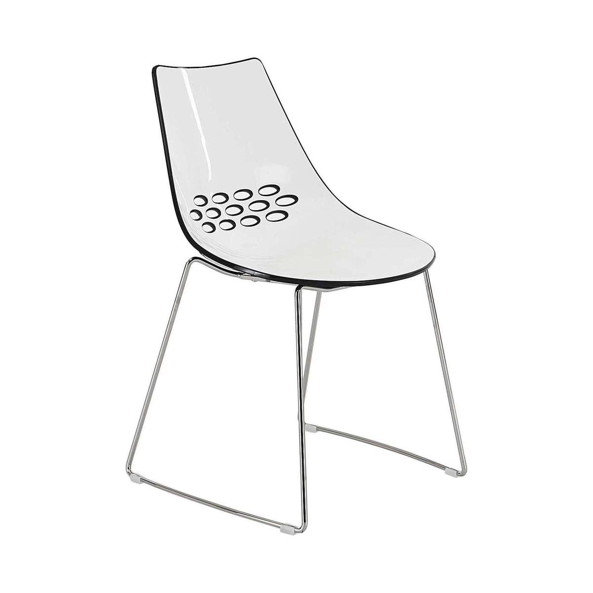 Ultra-modern high gloss dining chairs from Calligaris;High-tech double coloured layered plastic shells;Sleigh legs in a choice of finishes including chrome;Stylish cut out detailing on the chair back;Footpads to protect the floor;White inner shells with red, black, transparent or nougat backs;Part of the Private Label collection from Calligaris