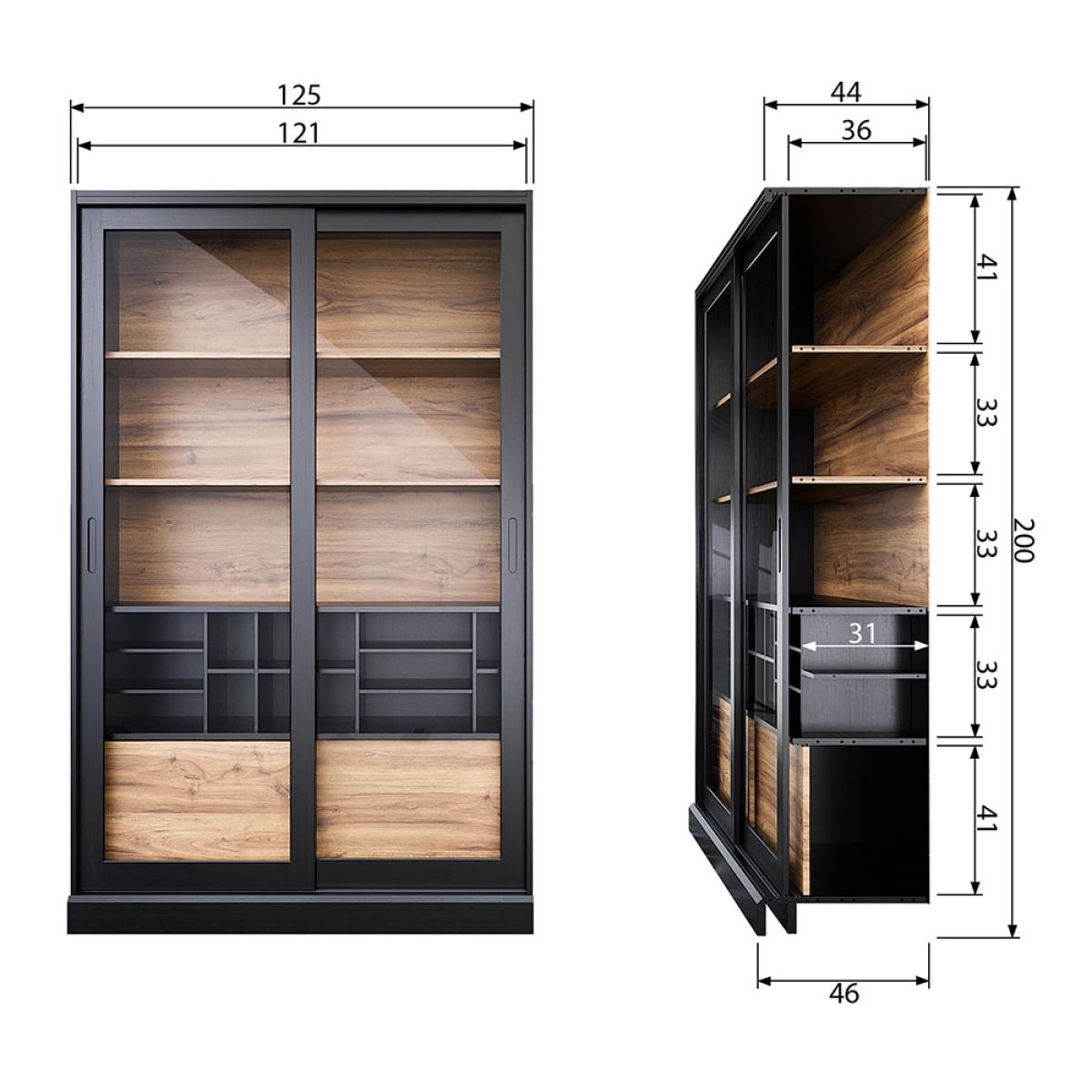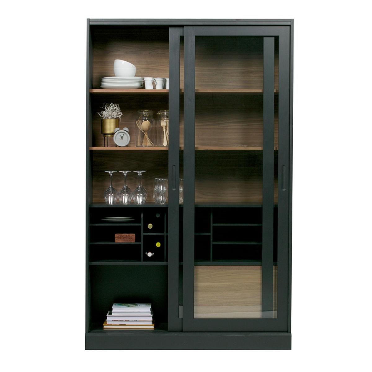 It's safe to say the James Cabinet from Woood is a storage giant! Standing 200cm tall and 125cm wide, this gorgeous piece of furniture offers up plenty of space. Manufactured from pine with a matte black finish and natural oak details, this classic cabinet has been given a modern revamp. With two large doors sliding to reveal an abundance of storage, keeping everything neat and tidy will be one easy task. Three large shelves for tableware, compartments for wine and glasses and cabinets at the bottom with solid sliding doors to hide the clutter, perfect!.