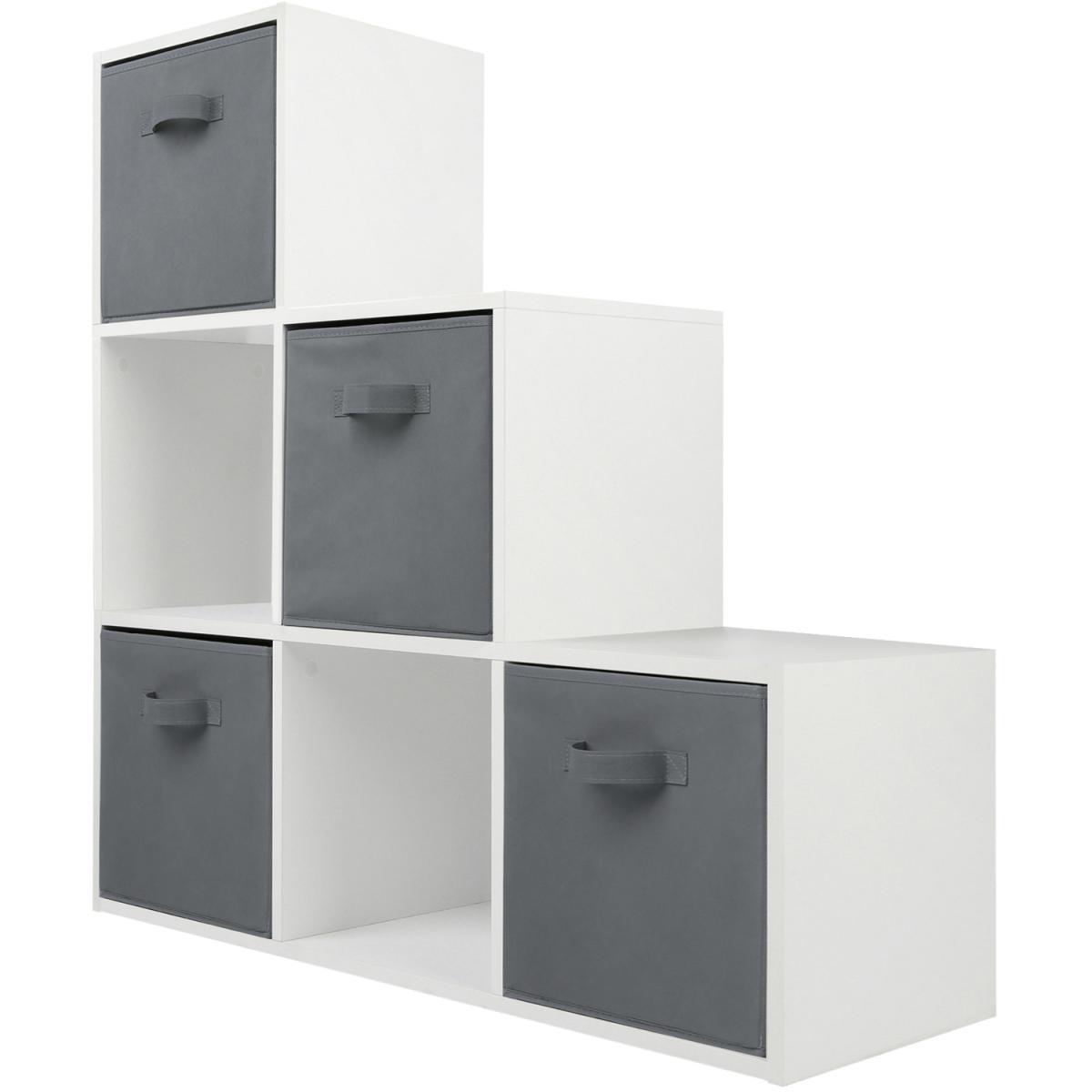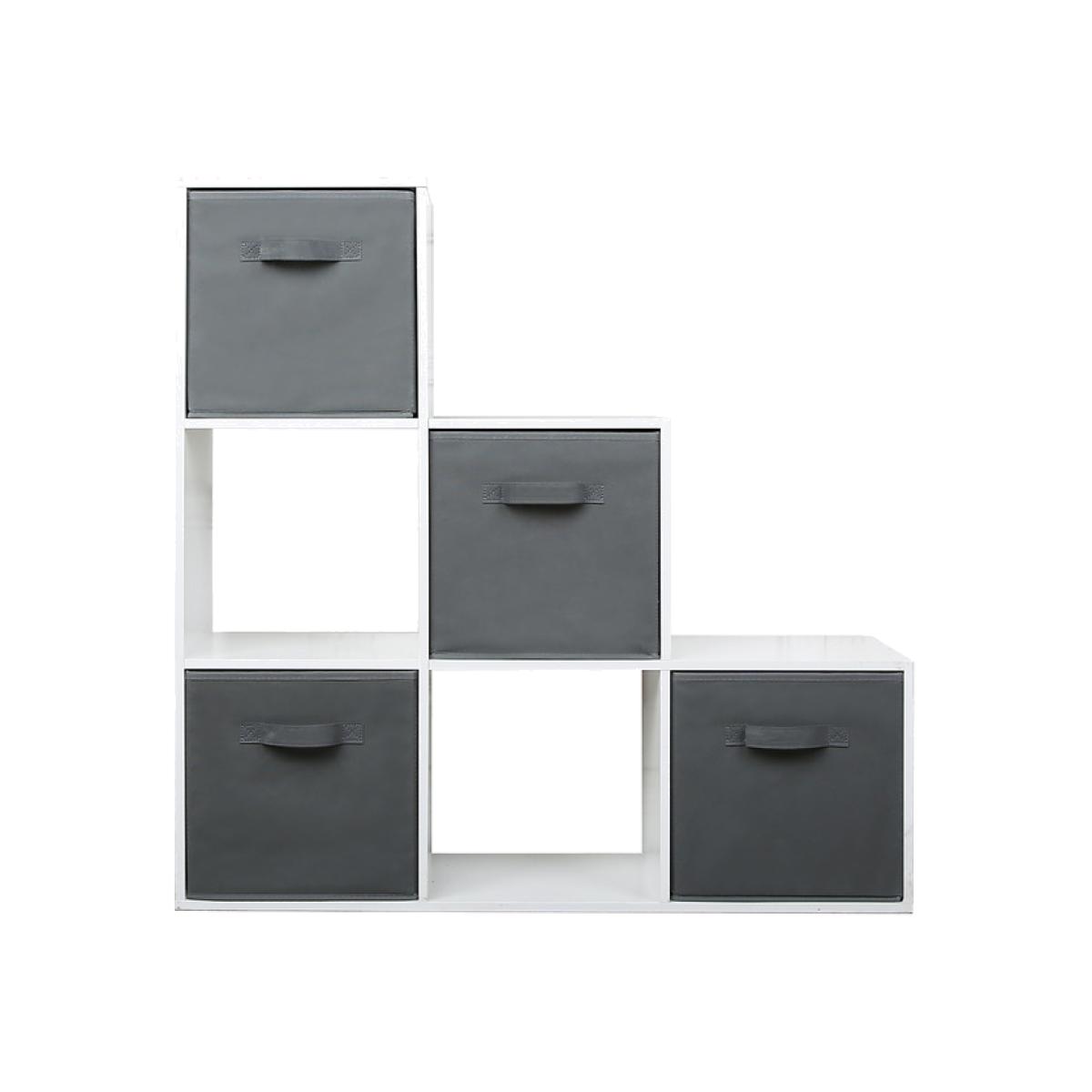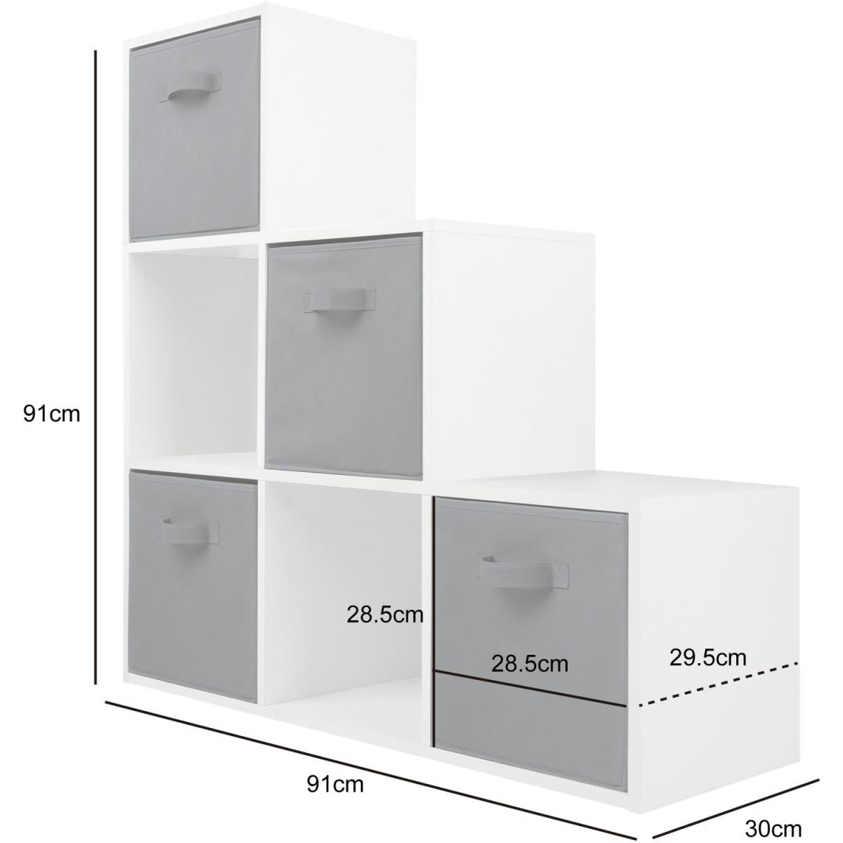 The 6 box staircase shelf is perfect for keeping the house tidy and organised. This bookcase features four grey fabric storage boxes and can be placed under stairs or any other awkward angle in the house. A ladder design makes the Cube Storage Unit perfect for small spaces like hallways and landing. This ladder-style bookcase features six cube compartments that form horizontally descending steps for more aesthetic appeal and efficient use. If you're looking to optimise your living space, organise your possessions, and add some modern style to your storage methods, this staircase shelf built-in cubes is a fantastic option. It is exceptionally crafted interior furniture that is fabulous and functional. Made of high-quality materials, it is the ultimate unit of storage efficiency. This simple bookcase with its baskets will help make an amazing difference towards achieving your tidy home goals. You can stash away books, kids' toys, or anything that doesn't have its own designated space. Being an 6-cube bookcase, it has enough room to contain as many items as possible.