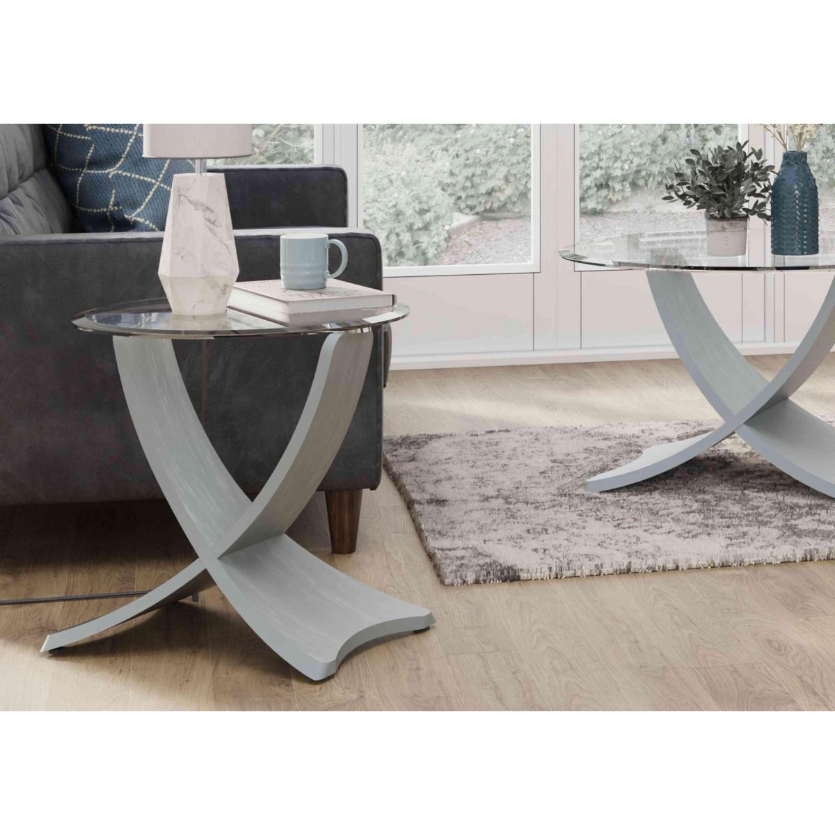 Here’s a side table that really makes a statement. With its circular bevelled glass top and bentwood legs finished in a stylish grey, it’s both creatively designed and well crafted. Why you'll love it Striking glass side table with swooping bentwood legs. Oak veneer legs have an on-trend grey finish. Authentically crafted – the wood veneer is steamed and then shaped. Circular top is made of toughened glass and has bevelled edges. A Furniture Village online exclusive. This side table is part of the Jane range. What you need to know Delivered to you flat-packed. Assembly required. No two pieces of veneer are the same. You may see variations in colour and woodgrain. Small scratches may be seen on the glass top and are a result of the polishing process. Tempered glass is heavy. Please take care when moving this table. Avoid placing in direct sunlight or close to a heat source. Wipe clean with a damp cloth, and dry with a soft duster. Do not use abrasive cleaning products. We recommend using coasters or placemats at all times. Browse the Jane range for a selection of coffee tables and lamp tables.