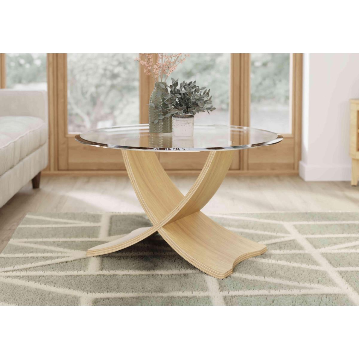 Looking for a glass coffee table with a difference? The Jane oak coffee table has a circular bevelled glass top and beautiful bentwood legs made with real oak veneer. Why you'll love it Striking glass coffee table with swooping bentwood legs. Distinctive interlocking oak veneer legs. Authentically crafted – the wood veneer is steamed and then shaped. Circular top is made of toughened glass and has bevelled edges. A Furniture Village online exclusive. This coffee table is part of the Jane range. What you need to know Delivered to you flat-packed. Assembly required. No two pieces of veneer are the same. You may see variations in colour and woodgrain. Small scratches may be seen on the glass top and are a result of the polishing process. Tempered glass is heavy. Please take care when moving this table. Avoid placing in direct sunlight or close to a heat source. Wipe clean with a damp cloth, and dry with a soft duster. Do not use abrasive cleaning products. We recommend using coasters or placemats at all times. Browse the Jane range for a selection of coffee tables and lamp tables.