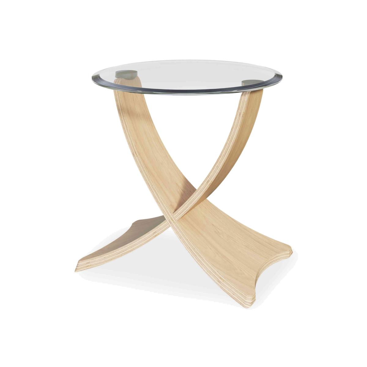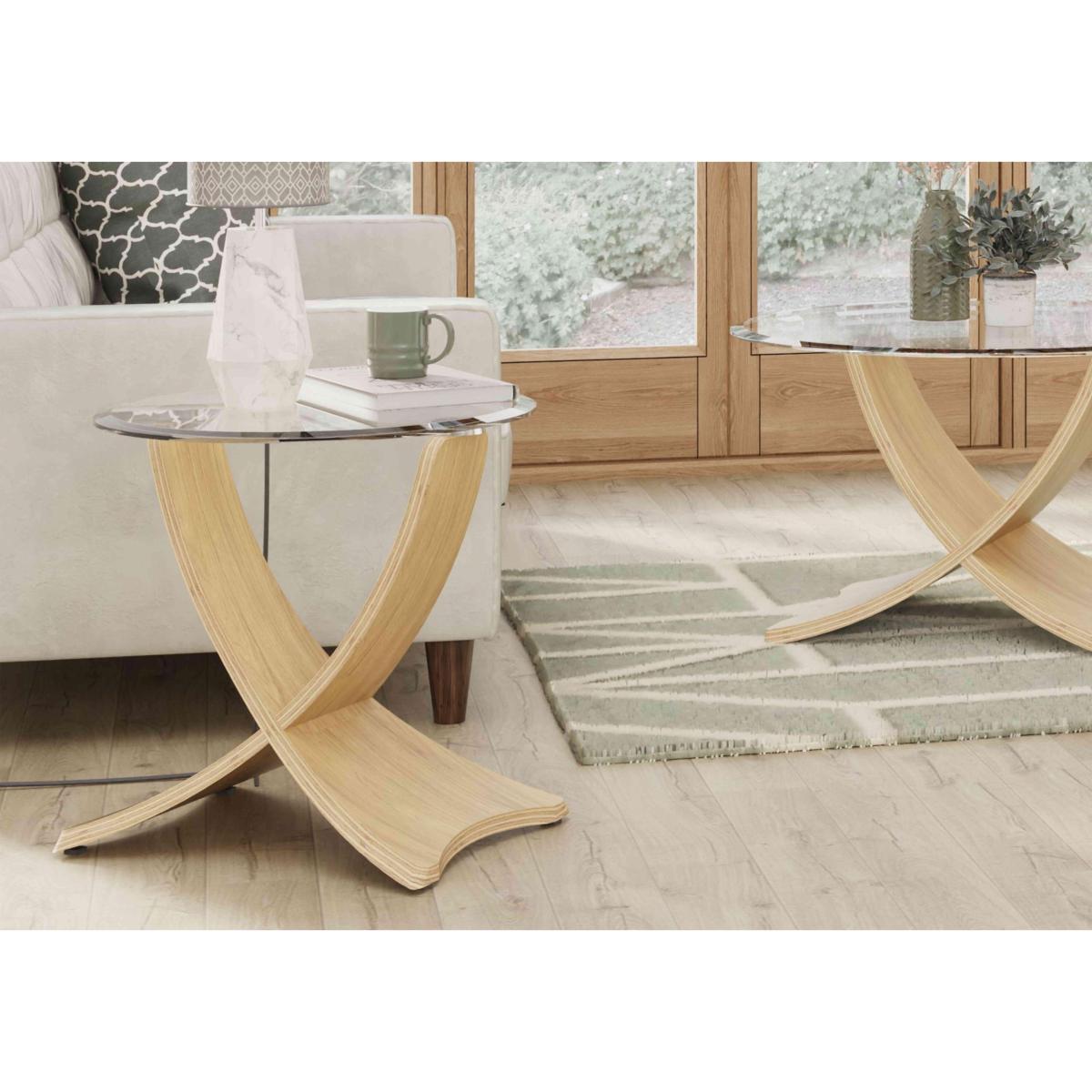 With its sweeping bentwood oak legs and circular glass top, this side table is the perfect way to lift a living room corner and makes a great lamp table too. Why you'll love it Striking glass side table with swooping bentwood legs. Distinctive interlocking oak veneer legs. Authentically crafted – the wood veneer is steamed and then shaped. Circular top is made of toughened glass and has bevelled edges. A Furniture Village online exclusive. This side table is part of the Jane range. What you need to know Delivered to you flat-packed. Assembly required. No two pieces of veneer are the same. You may see variations in colour and woodgrain. Small scratches may be seen on the glass top and are a result of the polishing process. Tempered glass is heavy. Please take care when moving this table. Avoid placing in direct sunlight or close to a heat source. Wipe clean with a damp cloth, and dry with a soft duster. Do not use abrasive cleaning products. We recommend using coasters or placemats at all times. Browse the Jane range for a selection of coffee tables and lamp tables.