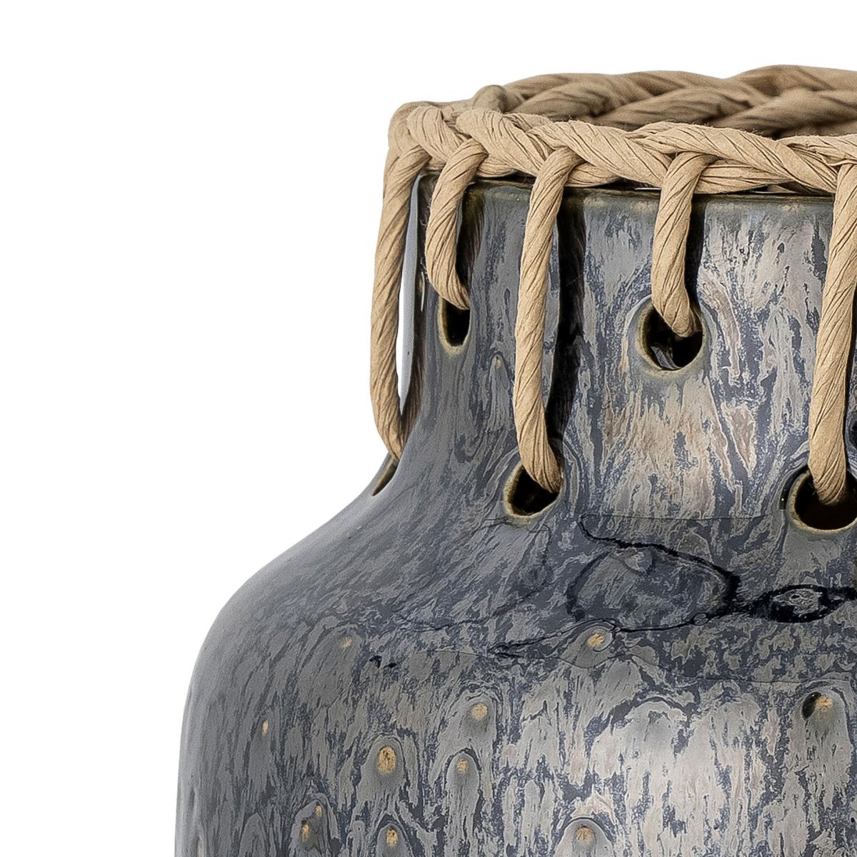 This vase offers a gorgeous yet surprising combination of materials, creating a hybrid style that is authentic, ethnic and modern all at once. The ceramic and its reactive enamelling create a black surface with irregular, metallic tones. The top of the vase is decorated with hand-woven natural rattan - a stunningly elegant detail. The vase is enamelled on the inside. PLEASE NOTE. Given the nature of the reactive hand-enamelling technique used, there may be slight variations in the colour of this piece.