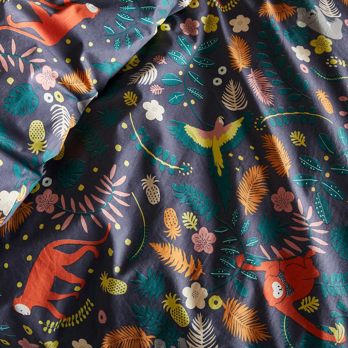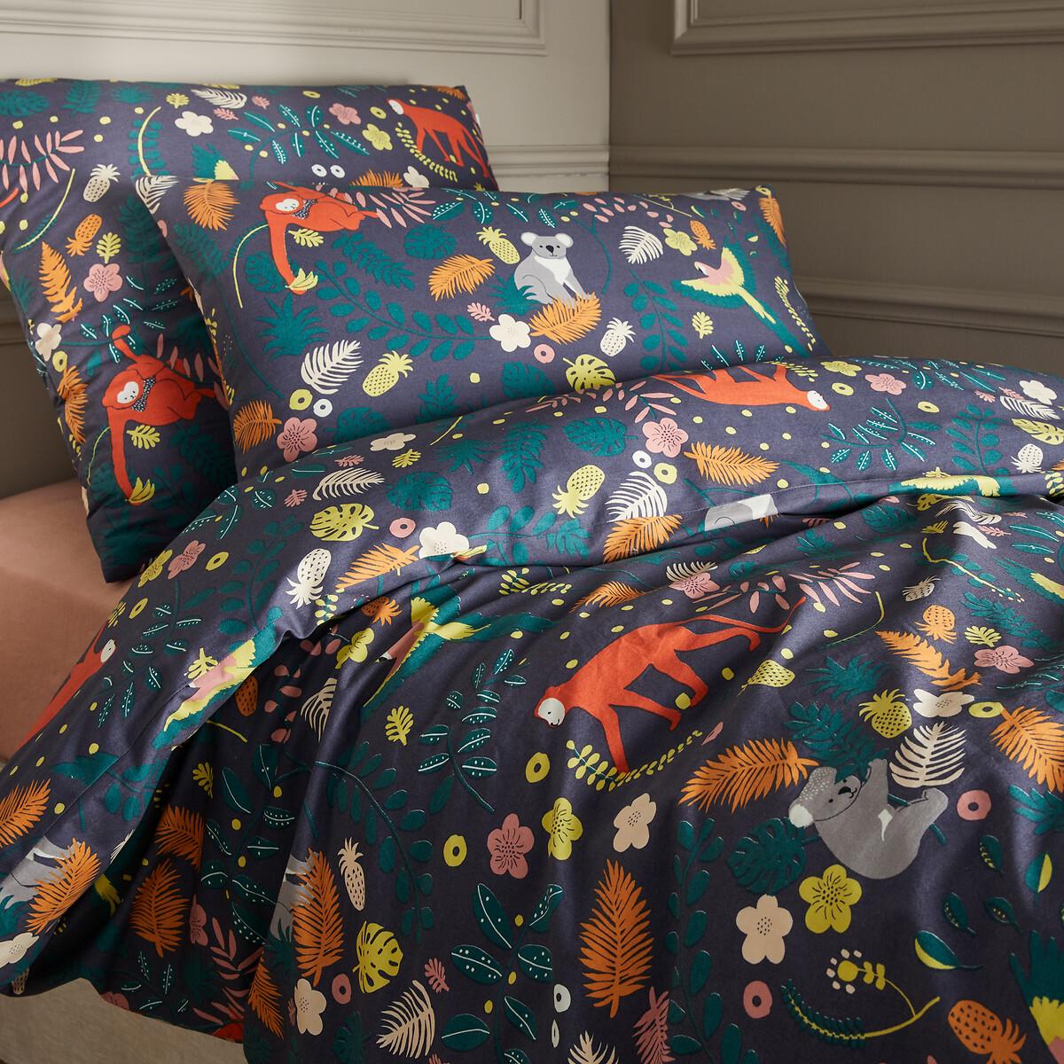 Jangal duvet cover. Ornately decorated with a jungle print featuring cute koala bears, cheeky monkeys and colourful parrots against a deep blue background, it's a recipe for sweet dreams. Product Details • 100% cotton • Organic cotton • 200 Thread Count: a common indicator for measuring the quality of fabric is the number of threads per cm². Different sensations are made possible thanks to the weaving and the number of threads present. Indeed, an optimal number of threads makes the bed linen particularly soft. • Straight buttoned hem Care Advice Follow our care tips to maintain the quality of your laundry • Machine washable at 60°C • By washing your laundry at 40°C instead of 60°C, you limit energy consumption • Tumble dry at low temperature • Iron at average temperature • Do not dry clean. Dimensions • 140 x 190cm: Single • 140 x 190cm: Double • Cotton from organic farming. Organic farming does not use any chemicals, pesticides, insecticides or GMOs. Produced with minimal impact on biodiversity. • OEKO-TEX® Standard 100. Standard 100 certification by OEKO-TEX® tests textile products for harmful substances via an independent, international label.
