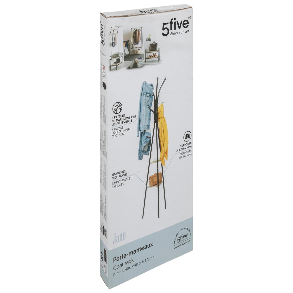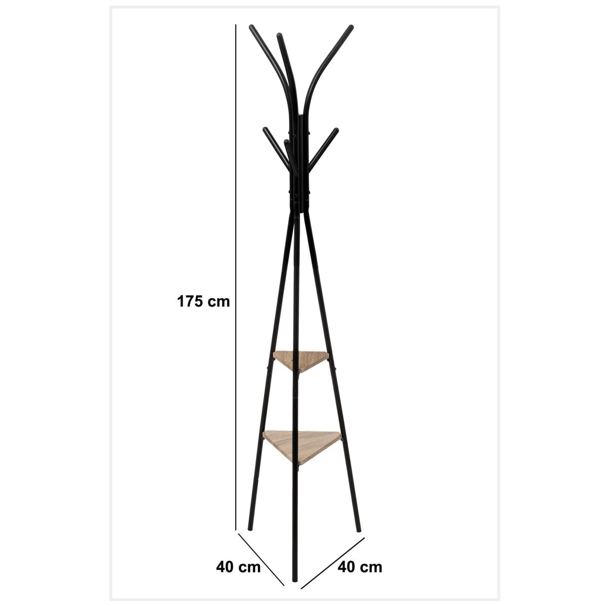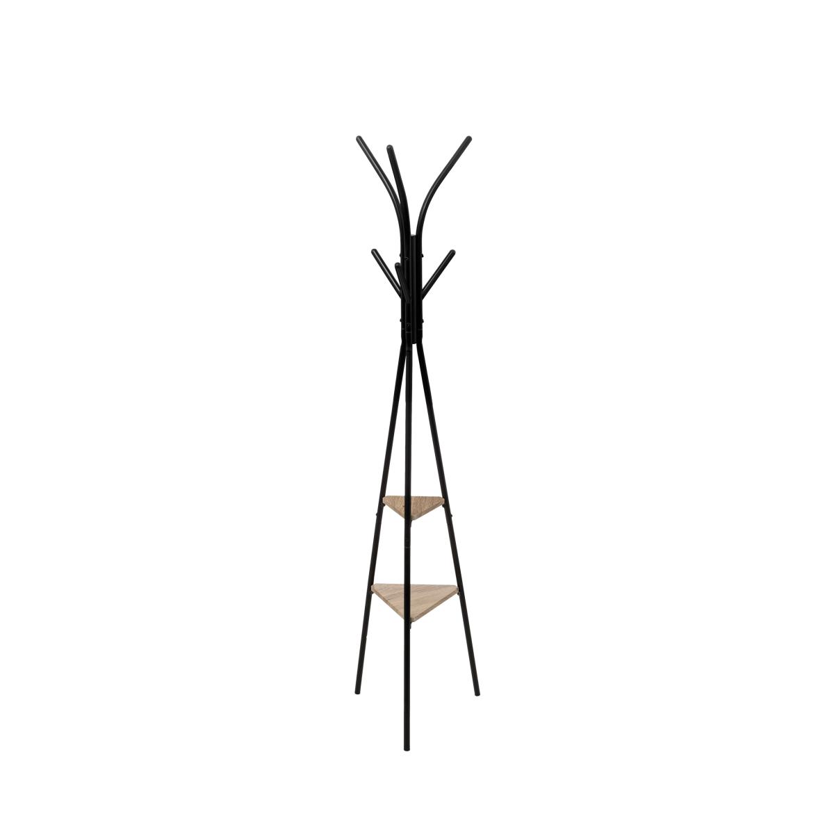 * Perfect for hanging coats* Includes 6 hanging hooks* Features 2 shelves* Metal frame Meet your new hallway hero, the Jano 6 Hook Coat Stand with Shelves! With a modern tripod design that blends sleek black metal and warm wood, this coat stand offers six hooks for coats and two handy shelves for shoes or bags. Style and function in one neat package!