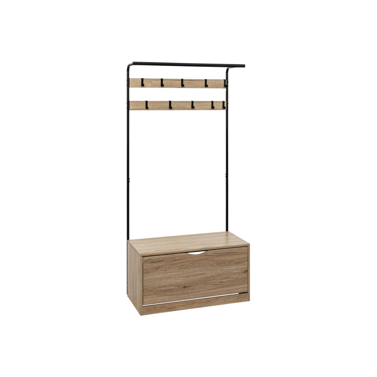 * Compact design* Includes 10 coat hooks* Features a storage cupboard Elevate your hallway with the Jano Hall Stand with Shoe Storage! This compact design offers 10 coat hooks and a handy cupboard for extra storage. The contrasting black metal and wood design adds a modern touch, while adjustable feet ensure a perfect fit on any floor.