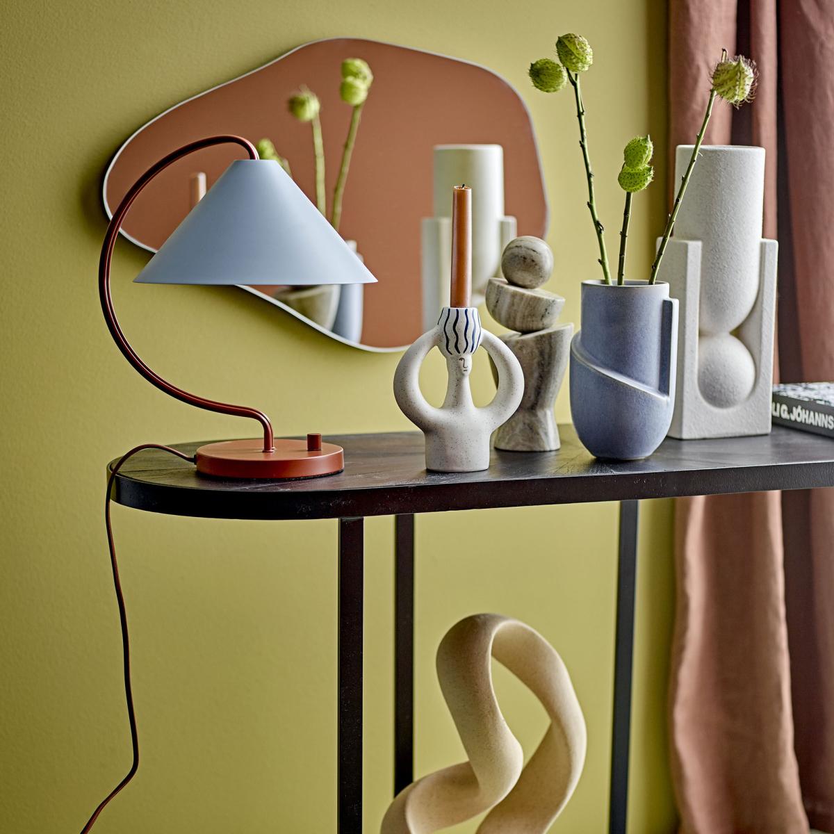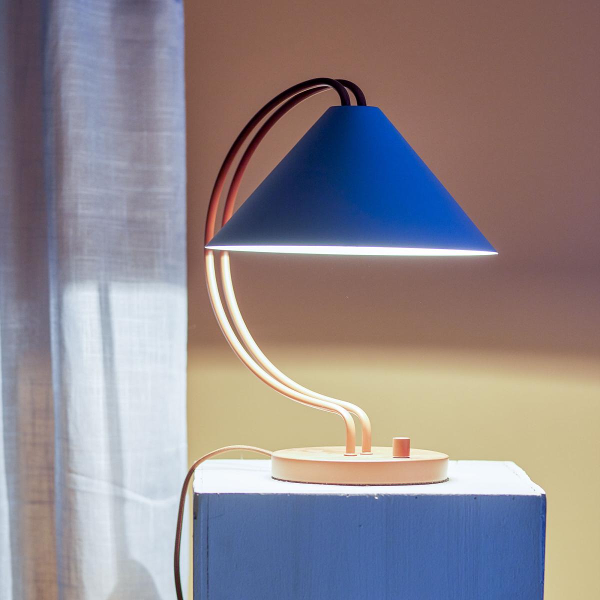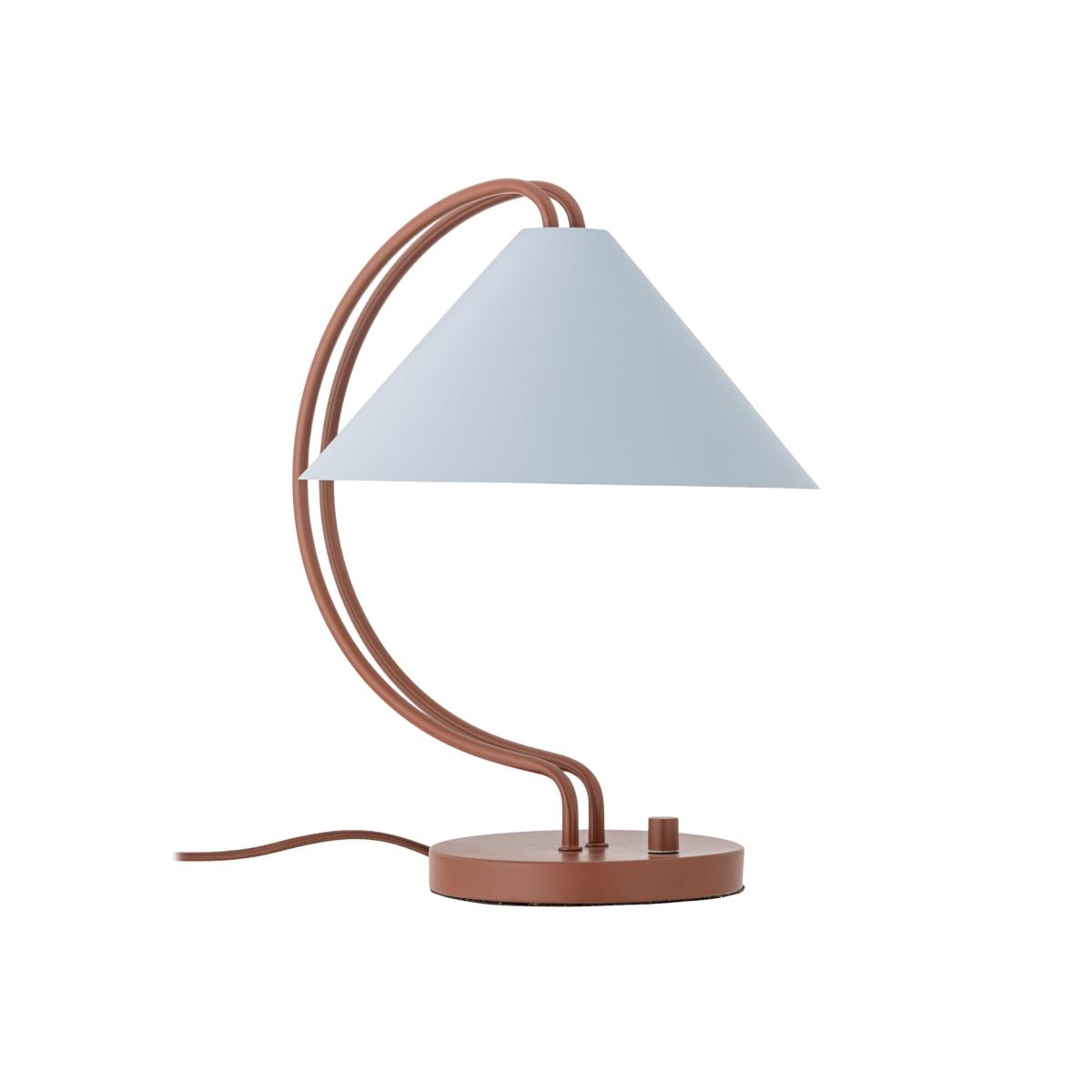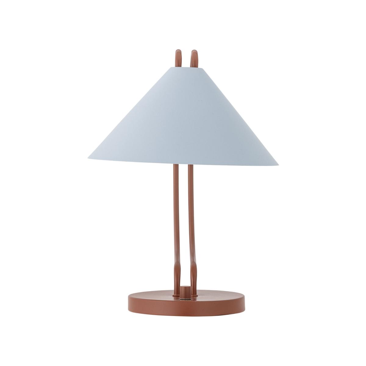 Modern, graphic and cheerful, the Janya table lamp offers a beautiful combination of contemporary colors. It combines a reddish-brown structure with a light blue fabric lampshade. Place it on a side table or nightstand to add color and cozy lighting to any room.