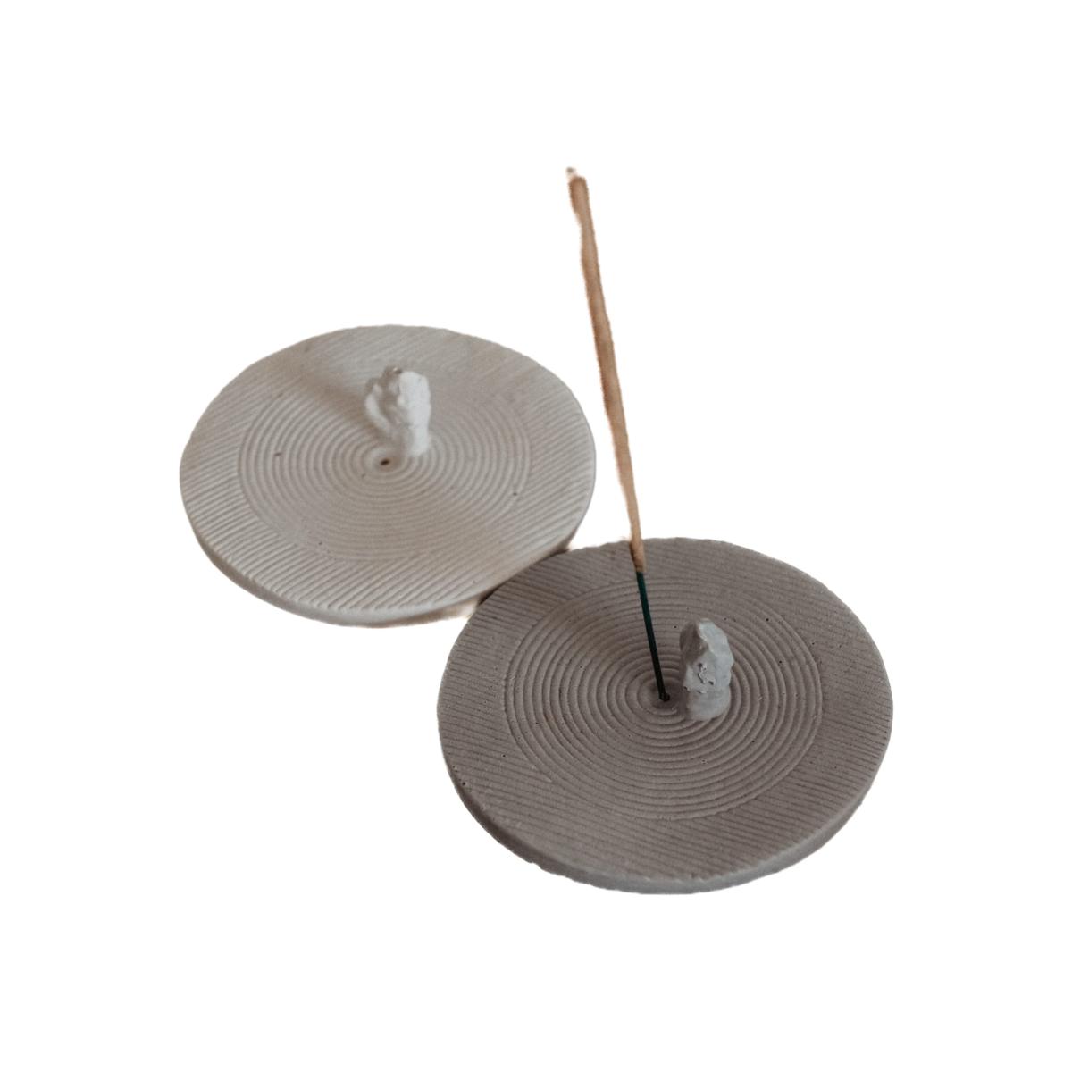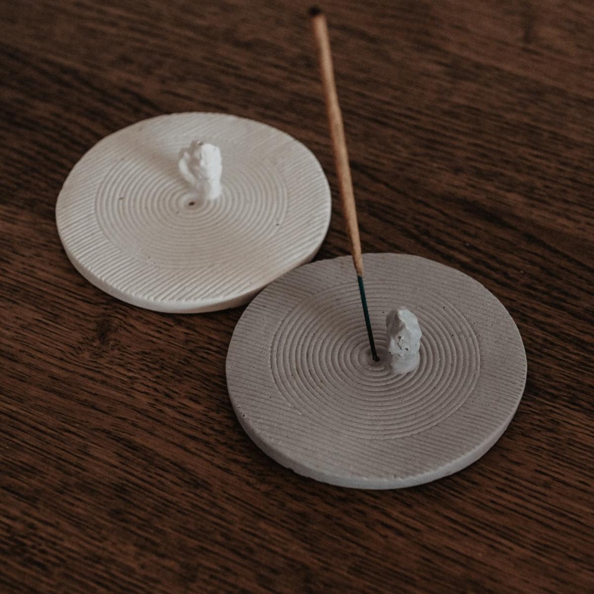An elegant incense holder inspired by the Japanese stone gardens. Dimensions : 10 cm x 2,5 cm Hand poured in our studio in South Of Spain Small imperfections like bubbles or color difference may appear.