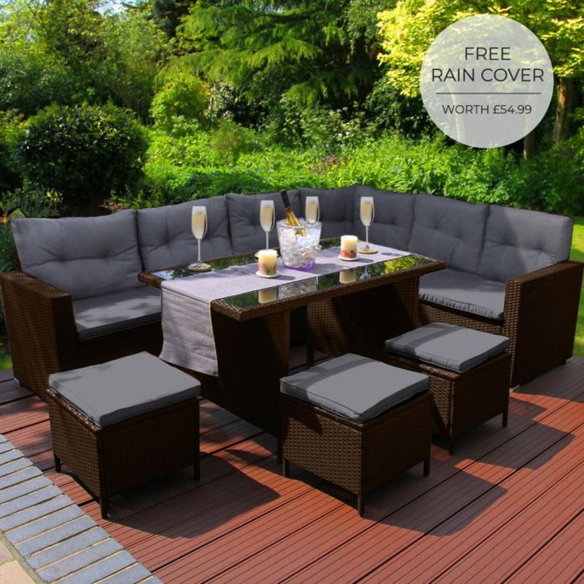 Experience luxury in its finest form with our range of beautiful rattan garden furniture brought to you by Jardi. Designed for maximum style and comfort, this exquisite dining set has beautiful back cushions, seats up to 9 people and is sure to be the perfect centrepiece for any garden party or dining al fresco. Transform your garden into a private paradise and be the envy of all your friends with this premium seating area. The easy-to-assemble flat-pack furniture enables you to relax outside with a drink in little to no time.
