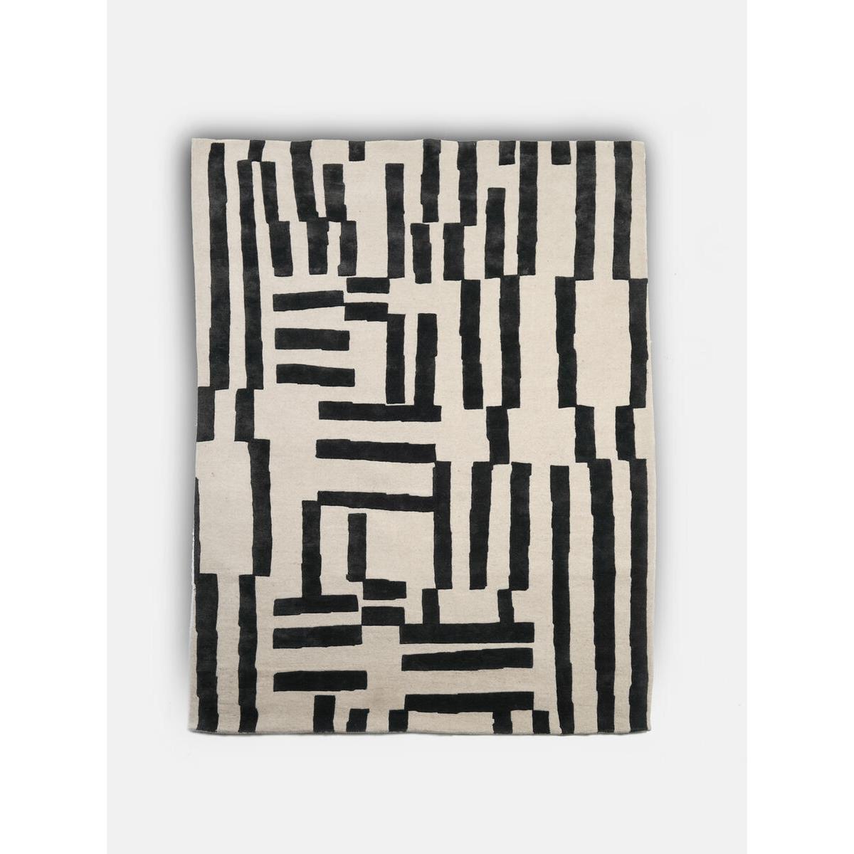 This wool-blend rug is intricately hand-tufted by Indianartisans in a graphic geometric pattern inspired by the Modernistrugs at White City House. It has a contrasting high and low pile tocreate an interesting texture, making the pattern really pop. Hand-tufted neutral and black wool blend. Variegated high and low pile creates three-dimensionaltexture. Made in India. Inspired by White City House.