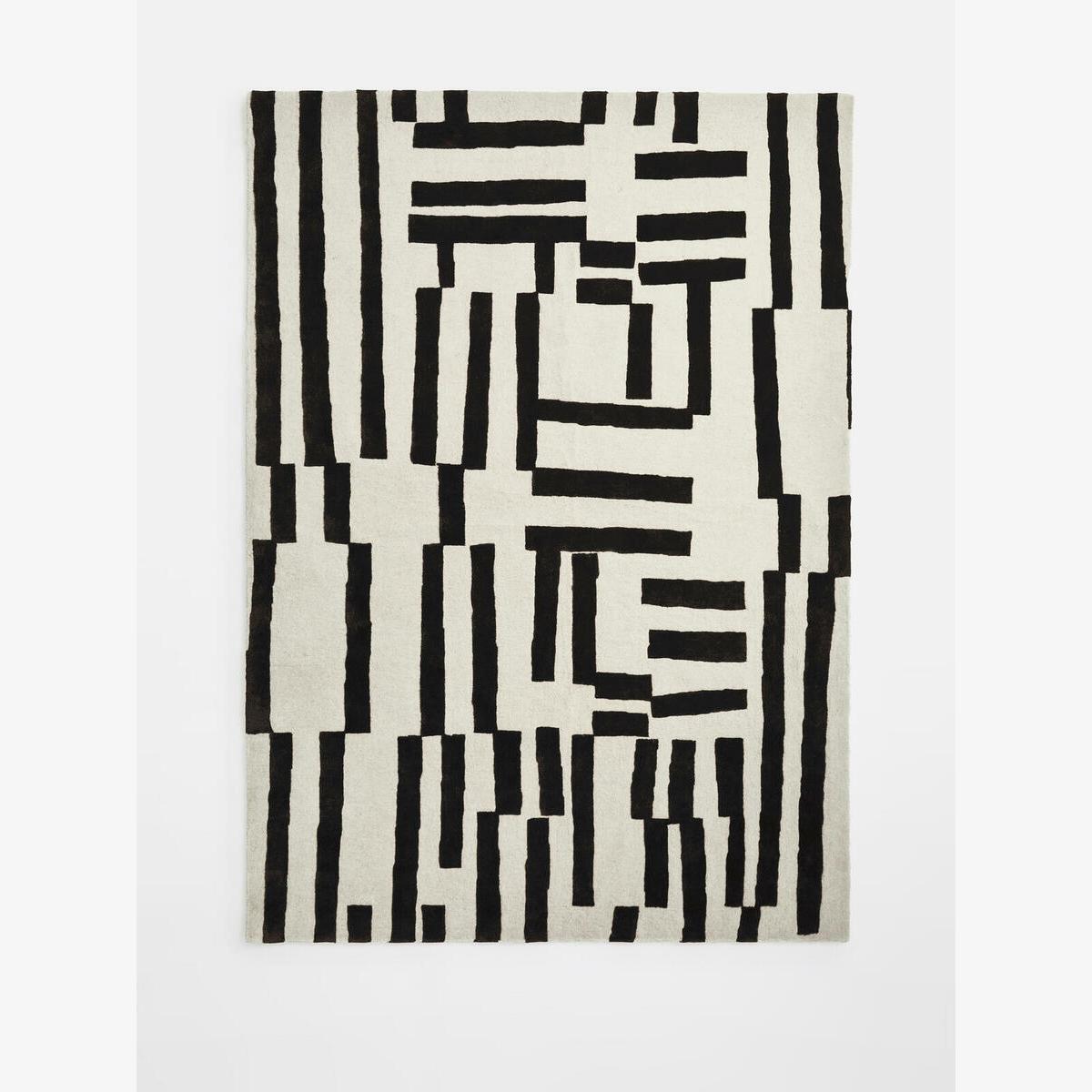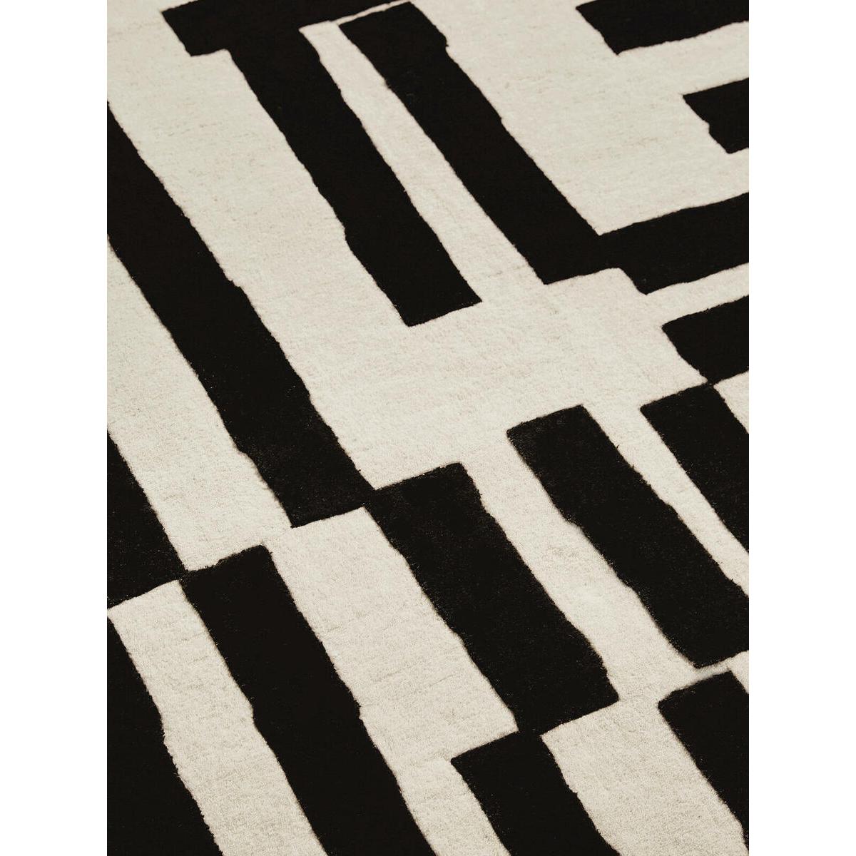 This wool-blend rug is intricately hand-tufted by Indian artisans in a graphic geometric pattern inspired by the Modernist rugs at White City House. It has a contrasting high and low pile to create an interesting texture, making the pattern really pop. • Hand-tufted neutral and black wool blend • Variegated high and low pile creates three-dimensional texture • Made in India • Inspired by White City House