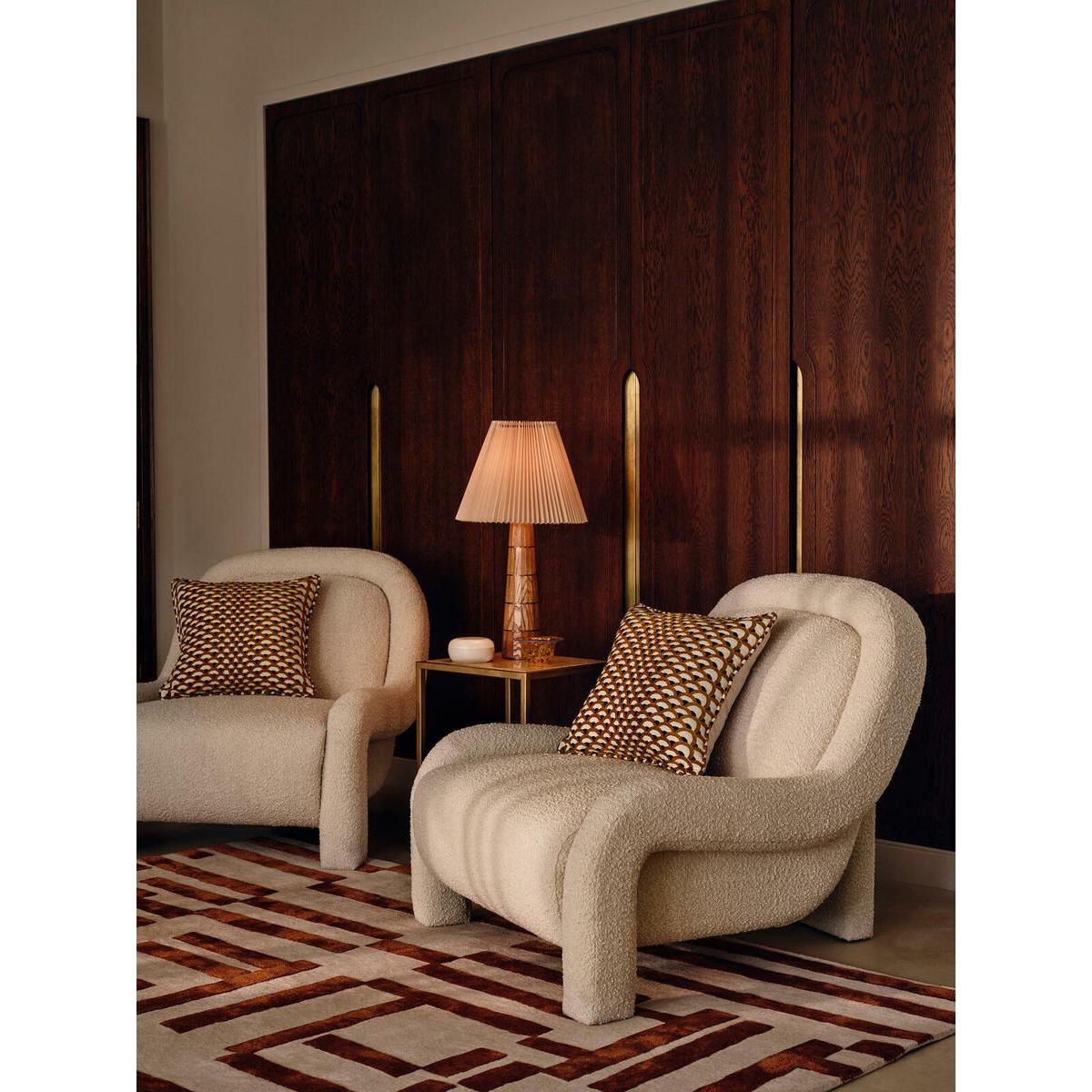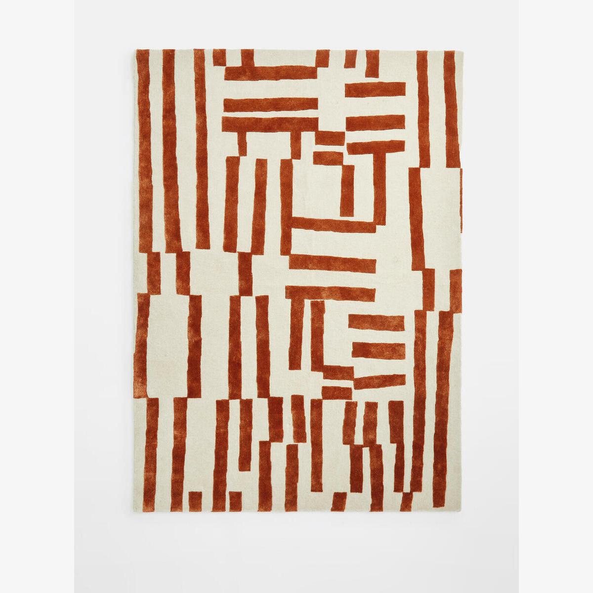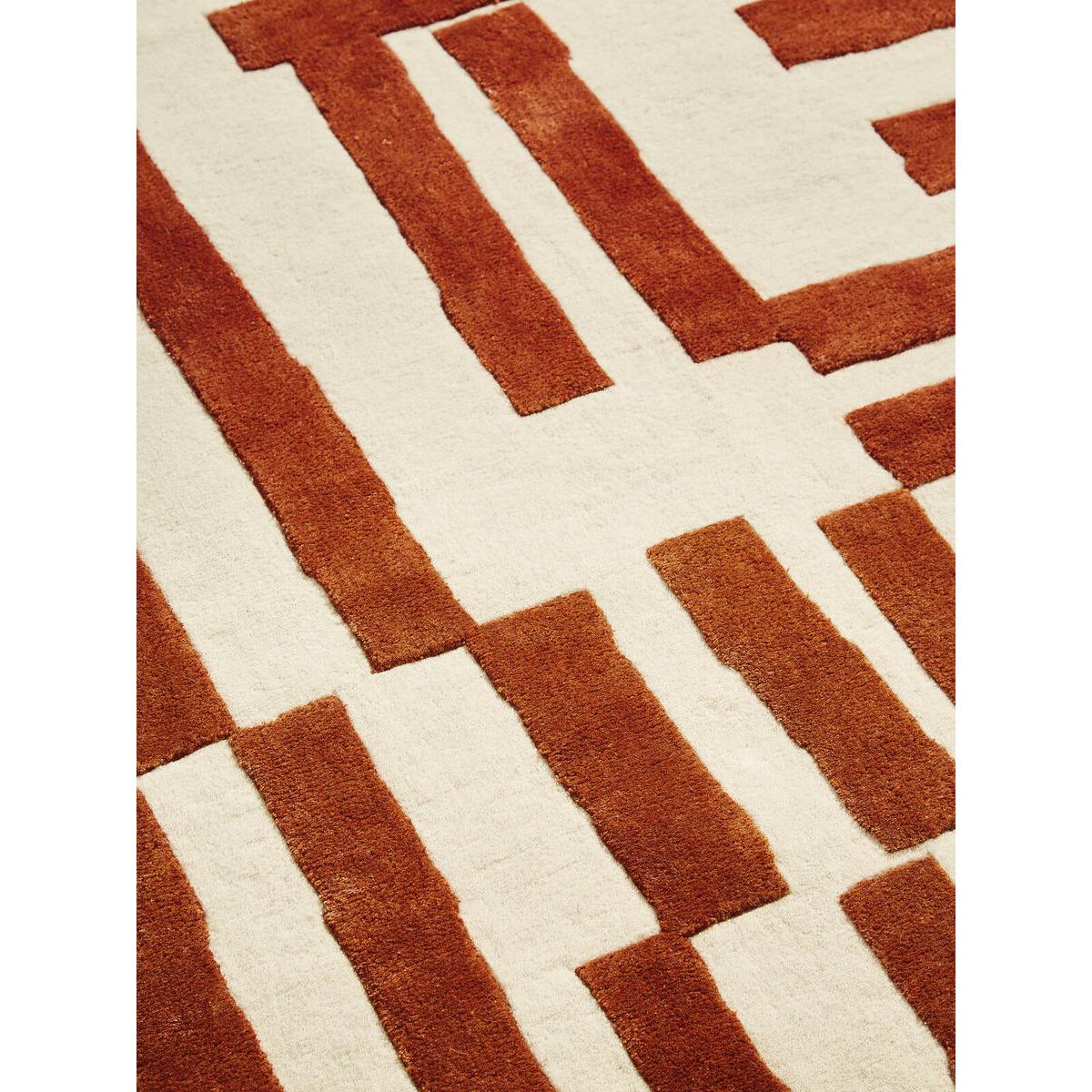This wool-blend rug is hand-tufted in Indian by skilled artisans. It has a graphic geometric pattern that is inspired by the rugs at White City House, with a contrasting high and low pile to create depth, and an texture that makes the pattern stand out. Place it underfoot in an office, or living room to anchor a space. • Hand-tufted rug • Rust colourway • Variegated high and low pile creates three-dimensional texture • Made in India • Designed in-house • Inspired by White City House