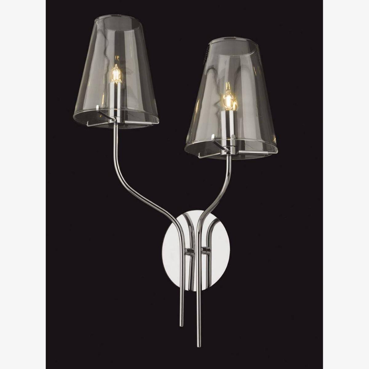 Stunning clear glass shades immediately draw the eye to the Jasmine 2-Light Chrome and Glass Indoor Wall Light. Its modern sleek style is ideal for a living area or entryway to add sparkling light and dramatic interest. It has slender chrome arms and pretty glass shades that are perfectly suited to decorative bulbs.
