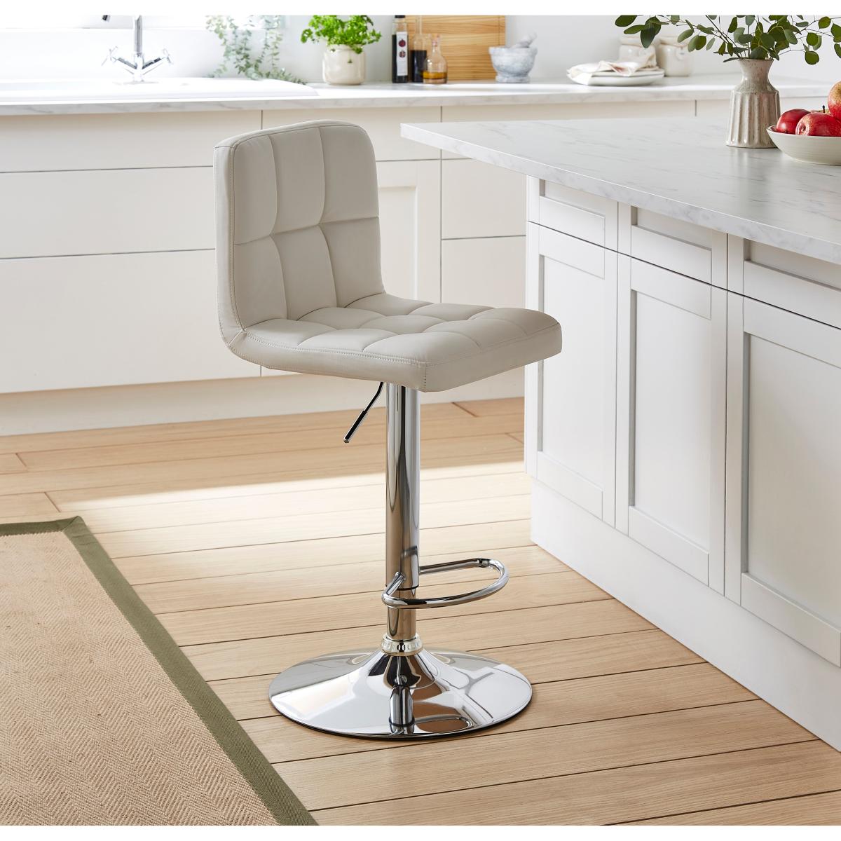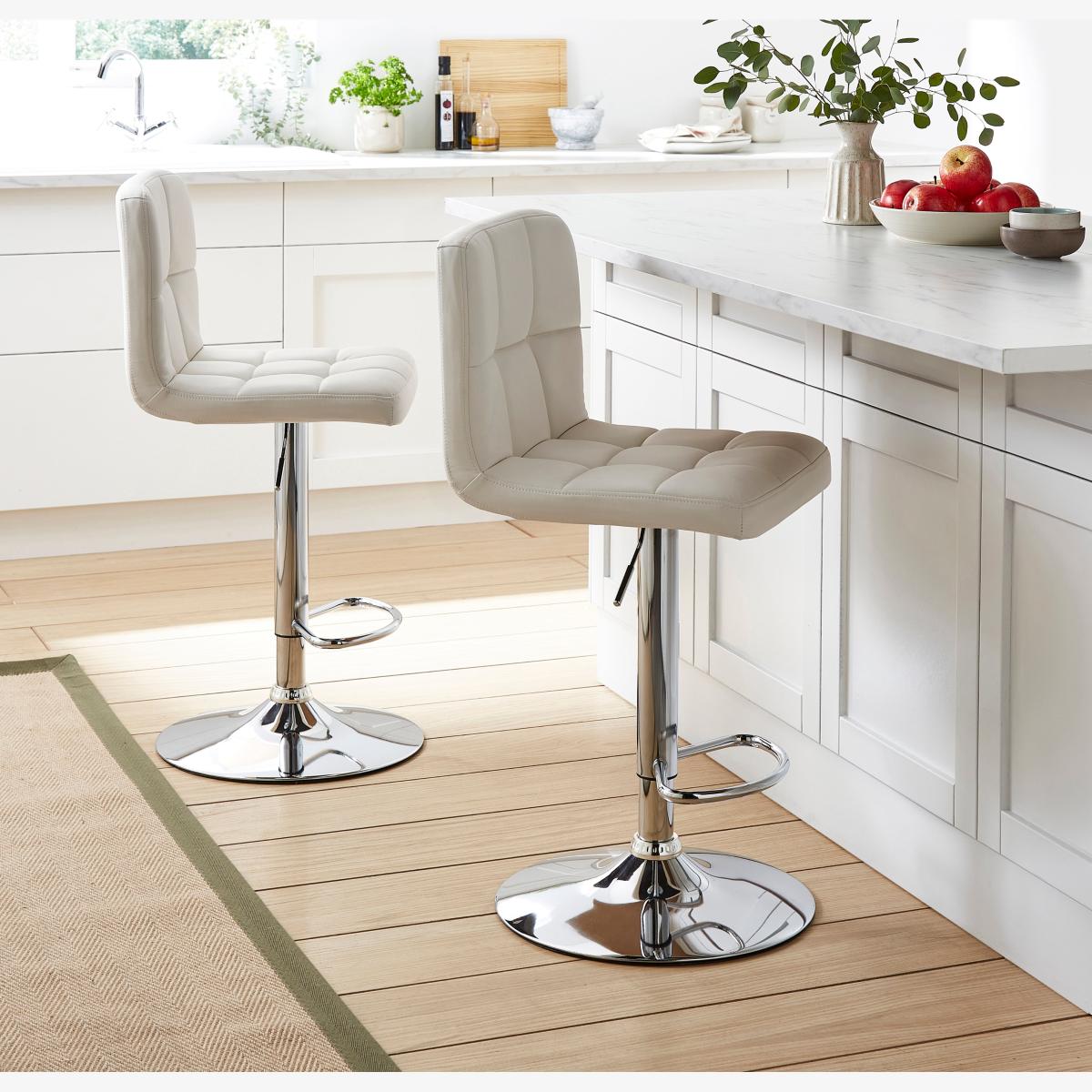 Dunelm Exclusive - Designed and Developed by Dunelm This elegant bar stool is perfect for enhancing the ambience of your kitchen. Crafted with a convenient gas lift mechanism for effortless height adjustment and a full 360-degree swivel seat, it combines style with functionality. The bar stool boasts a modern chrome-plated base and is available in a variety of colors to suit your taste.
