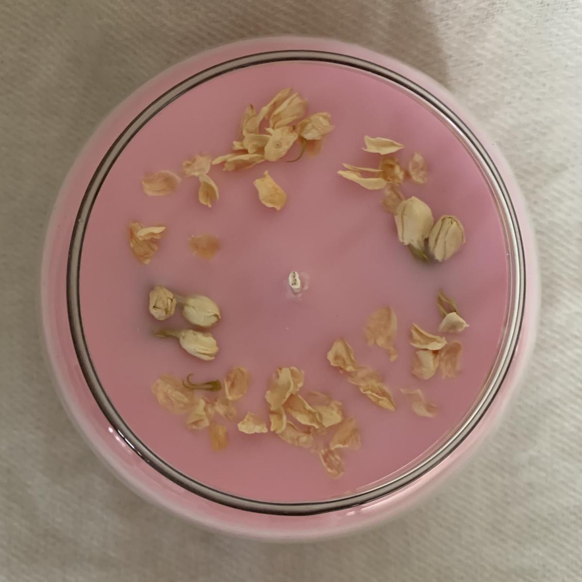 Jasmine is associated with deep affection, happiness and elegance. Its scent is especially well known for its relaxing properties, perfect for drifting off to sleep, which is why some gardeners plant jasmine outside the bedroom window to allow its fragrance to drift in on the night air. Using only the best quality, eco-friendly organic wax and sustainable cotton wick, our blush pink coloured, handpoured bowl candle is infused with a rich jasmine fragrance oil. We have carefully dried jasmine flower buds and petals to decorate the candle, and its large glass container also not only looks good, but is perfect for re-use as a vase or jar in your home. The candle is carefully wrapped in non-bleached tissue and comes in its own presentation Kraft gift box with a handy care guide - the perfect present ready to go!
