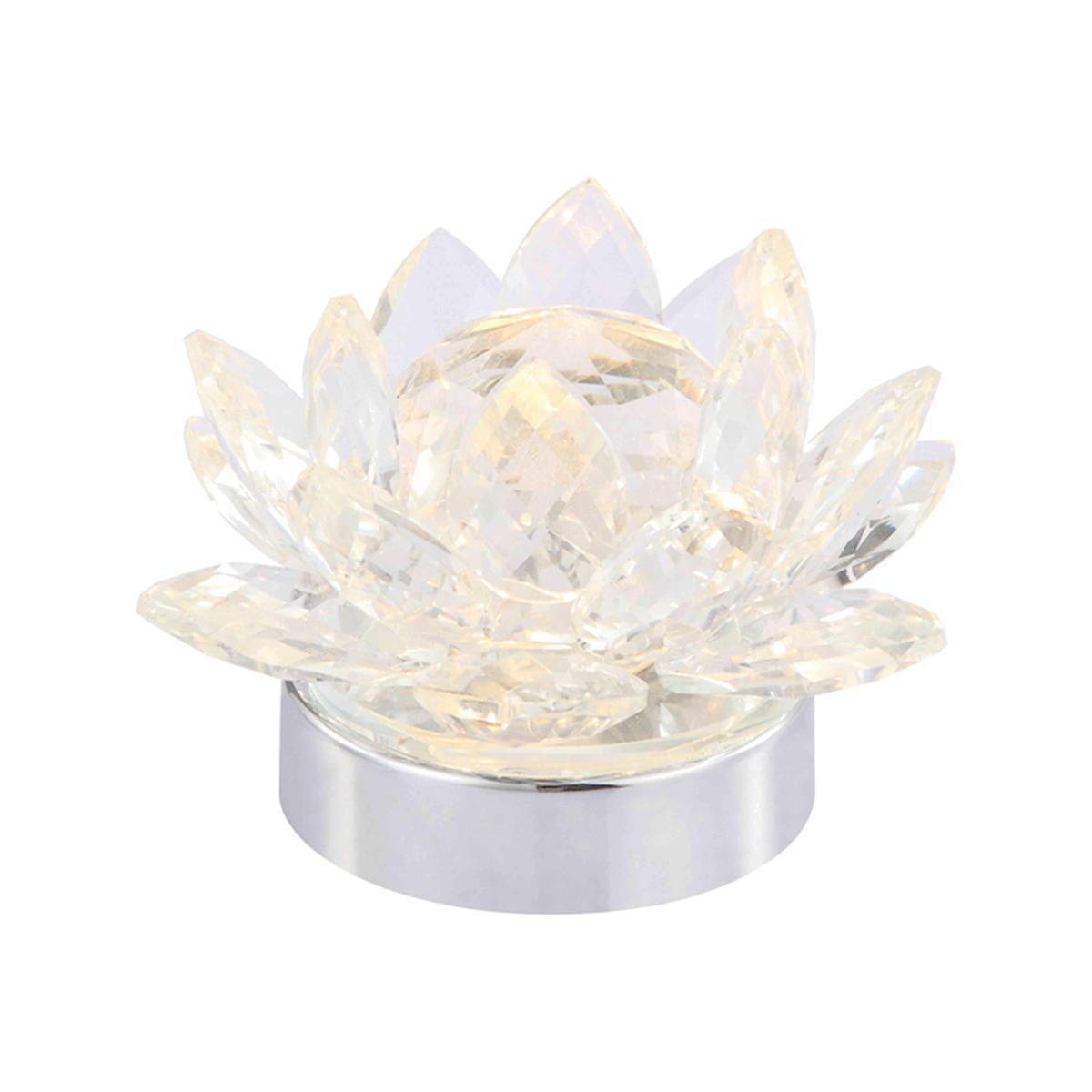 Small and perfectly formed, the Jasmine table lamp glows soft and warm. Beautifully rendered faceted glass petals rise from a sleek chrome base. A striking piece for any room. Why you'll love it. Petite accent lamp takes the form of a lotus flower. Delicate yet distinctive style. Faceted glass petals atop a polished chrome base. Casts a soft and warm white light. A striking concept, beautifully crafted. What you need to know. Polished chrome and glass construction. Clear cable with handy in-line switch. Supplied with an integrated 4W LED bulb. Dimensions. Width: 13 cm (5 inches). Depth: 13 cm (5 inches). Height: 9 cm (3. 5 inches).