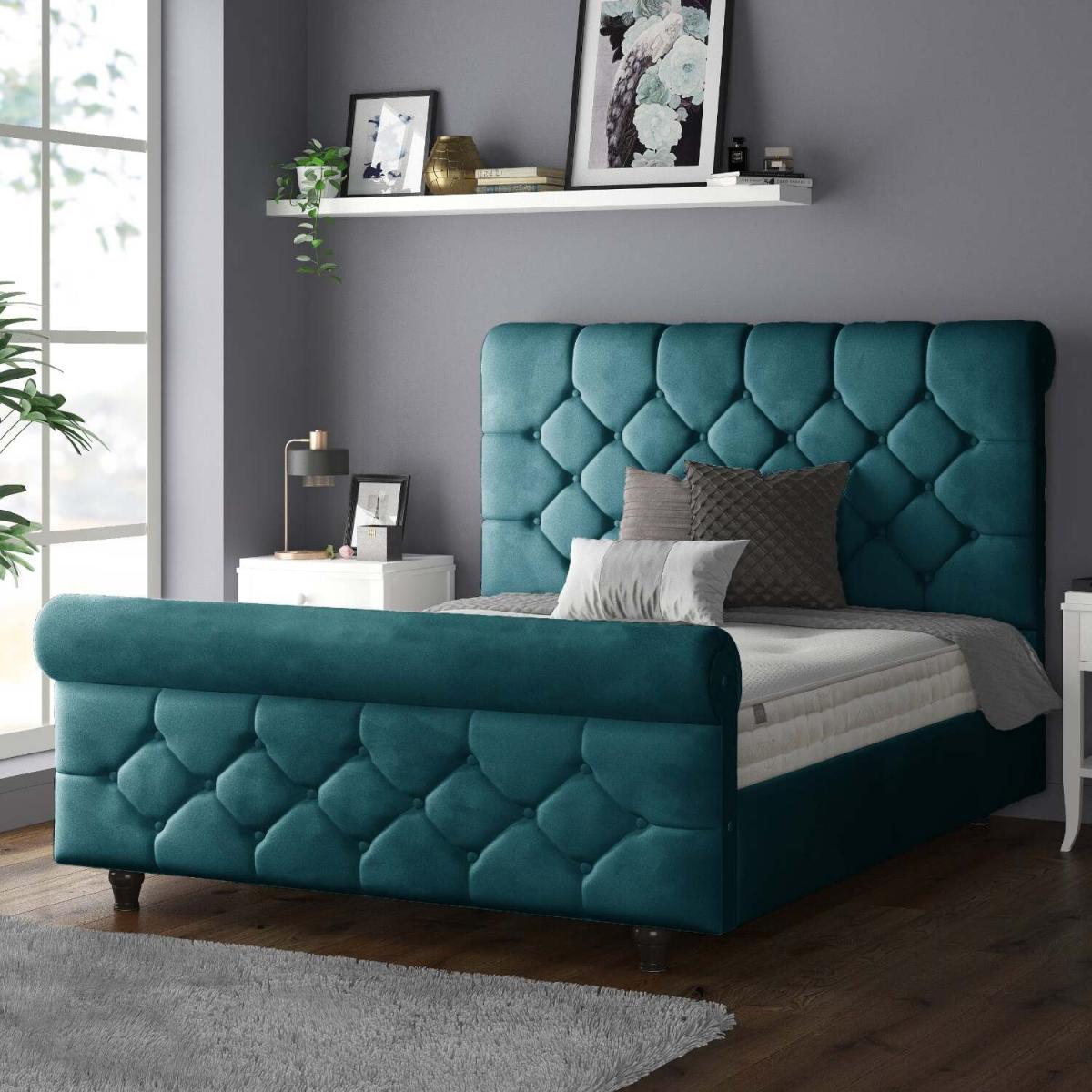 I’m a fan of this mallard-green velvet sleigh bed for its rich, modern take on classic Chesterfield lines. The deep teal colour works well in both contemporary and traditional schemes: pair it with brass-finish lamps and warm timber side tables for a cosier feel, or keep things crisp with white linens and marble accents for a Scandi-inspired look. For styling, layer up textures with a neutral wool throw and a mix of velvet and linen cushions in soft greys or muted pinks. A low-pile rug will ground the bed without hiding its wooden legs, and simple bedside tables will let the headboard remain the room’s focal point.