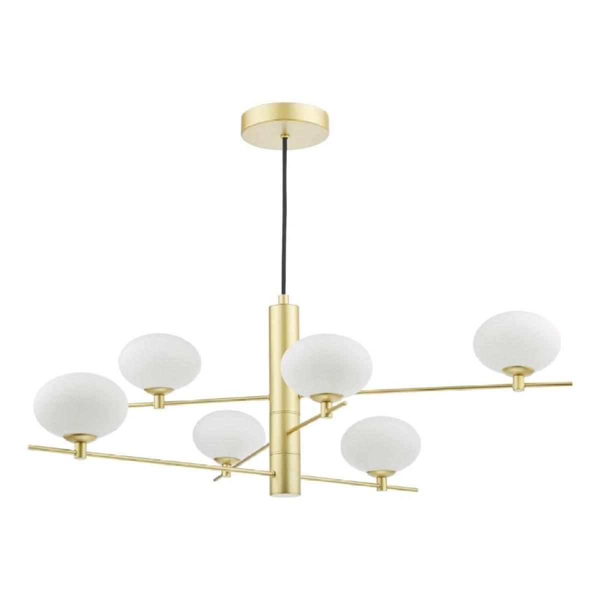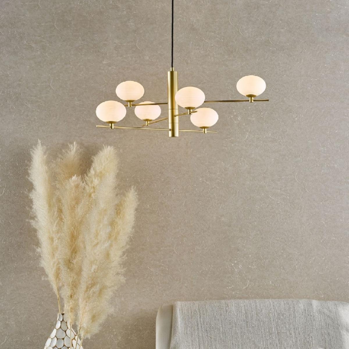 Jasper 6-light, mid-century-style pendant light with satin gold finish and opal glass shades. Inspired by mid-century design, this contemporary pendant light exudes sophistication and charm. With fine arms that delicately hold opal swirl glass perches, the Jasper pendant creates a captivating visual display that enhances any room. The satin gold finish adds a touch of luxury, while the opal glass shades softly diffuse the light, creating a warm and inviting ambiance. Whether suspended above a dining area, hallway or living room, the Jasper pendant light brings a sense of refinement and style to any space. Jasper 6-light, mid-century-style pendant light with satin gold finish and opal glass shades. Inspired by mid-century design, this contemporary pendant light exudes sophistication and charm. With fine arms that delicately hold opal swirl glass perches, the Jasper pendant creates a captivating visual display that enhances any room. The satin gold finish adds a touch of luxury, while the opal glass shades softly diffuse the light, creating a warm and inviting ambiance. Whether suspended above a dining area, hallway or living room, the Jasper pendant light brings a sense of refinement and style to any space.