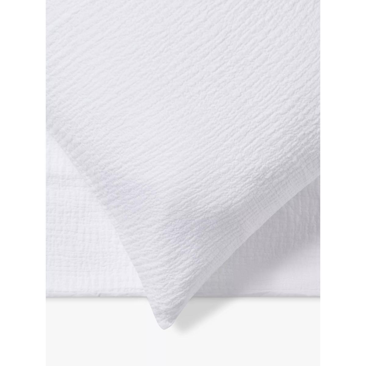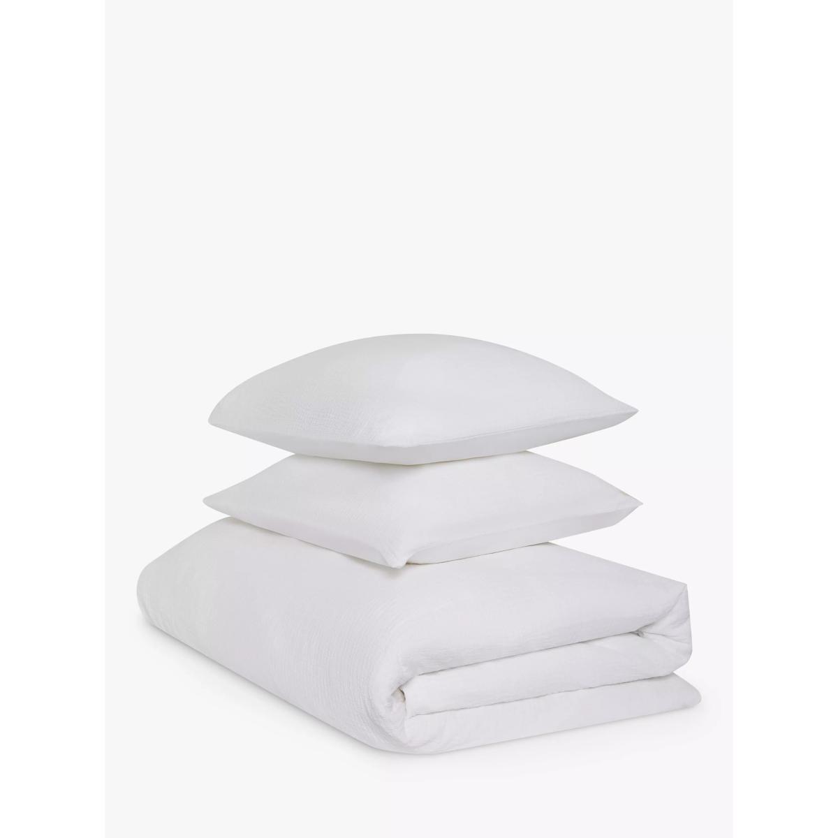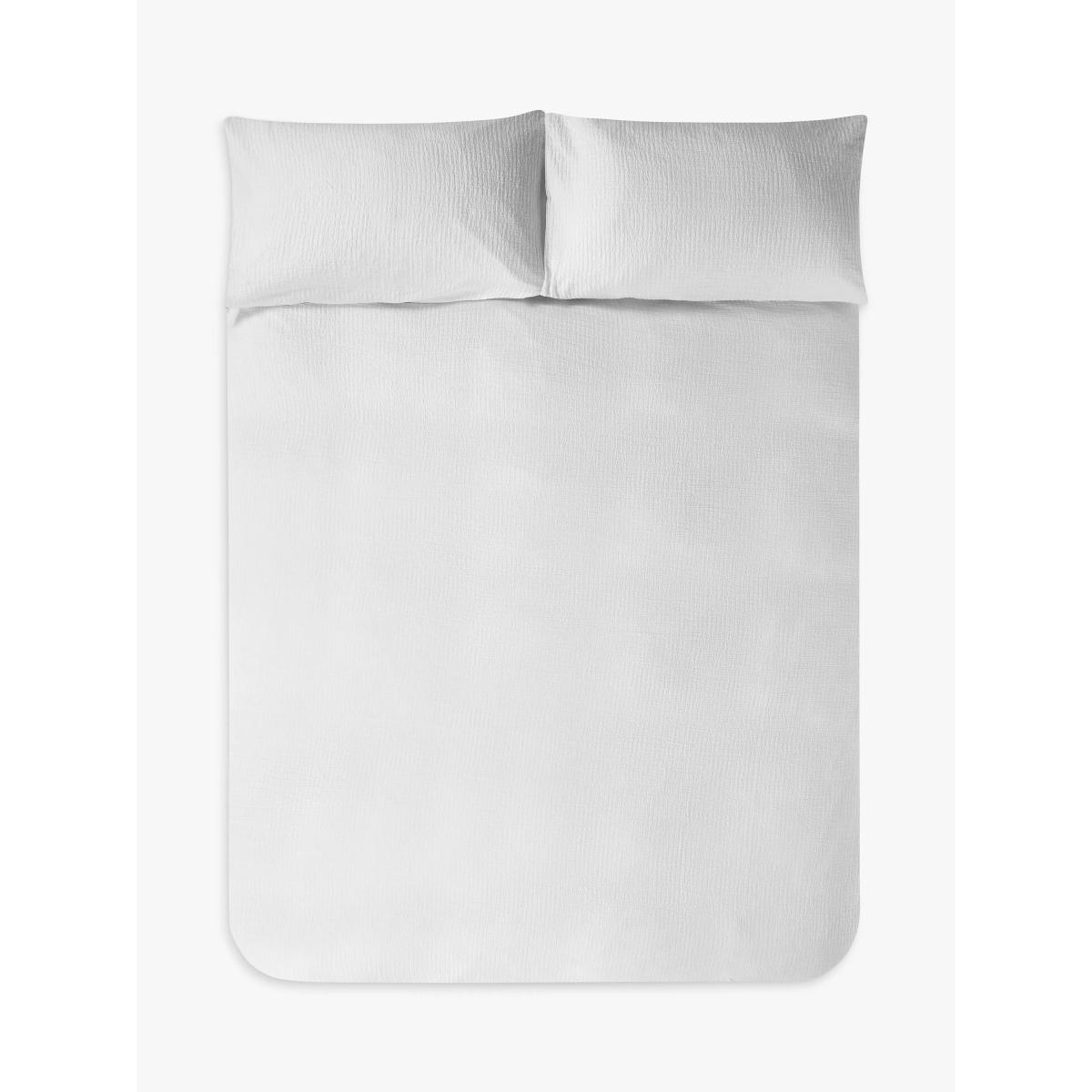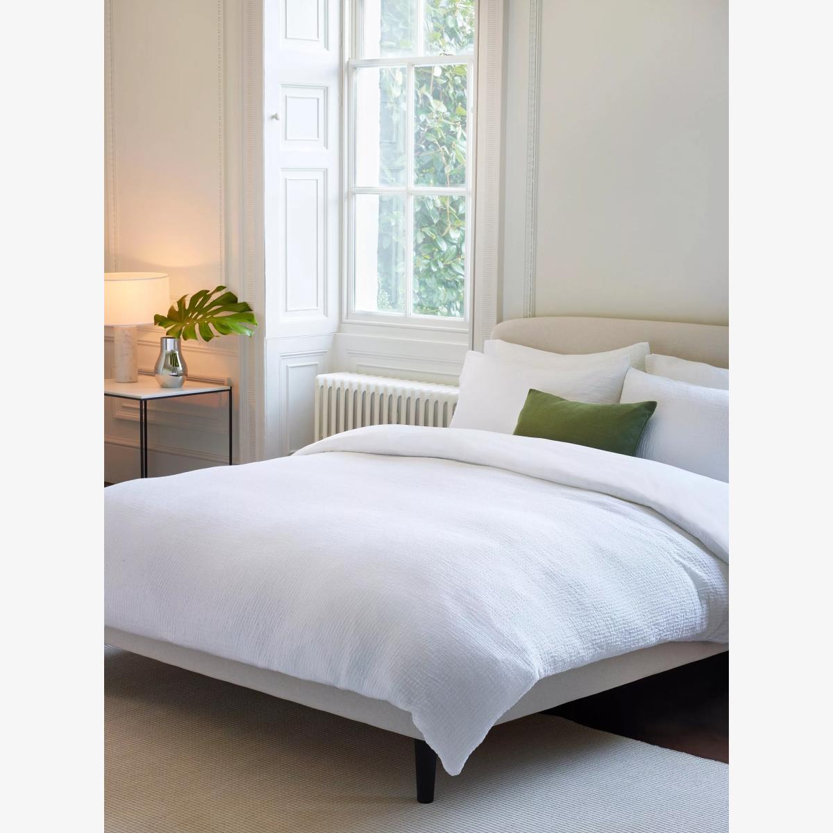 The double weave range uses 100-per-cent combed cotton, created using the finest yarns. These durable fabrics feel beautifully soft and are breathable and naturally hypoallergenic, making them suitable for use all year round. Created on a dobby loom, this woven fabric is the result of lifting the warp threads to create small geometric patterns and interesting texture. Wonderfully soft, the Double Weave range has been developed to exude the very essence of tranquillity. A unique, crinkled texture looks effortlessly sumptuous and is easy to care for, while the percale reverse feels soft against your skin. The single size contains 1x pillowcase, all other sizescontain 2x pillowcases. Standard pillowcase, L75 x W50cm Single duvet cover, L200 x W135cm Double duvet cover, L200 x W200cm King duvet cover, L220 x W225cm Super king duvet cover, L220 x W260cm