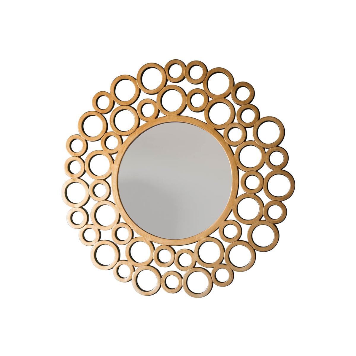 I love this big round mirror with its distinctive gold frame. It works particularly well in contemporary and glam interiors, adding a touch of luxe while also making spaces feel more open and inviting. This piece is a versatile statement that can sit above a console, in a hallway, or even in a bedroom as a focal point. For styling tips, consider pairing it with softer textures and neutral tones to let the gold really pop, or combine it with other metallic accessories for a cohesive look. Its round shape and intricate border make it a clever way to bring both elegance and visual interest to any room.