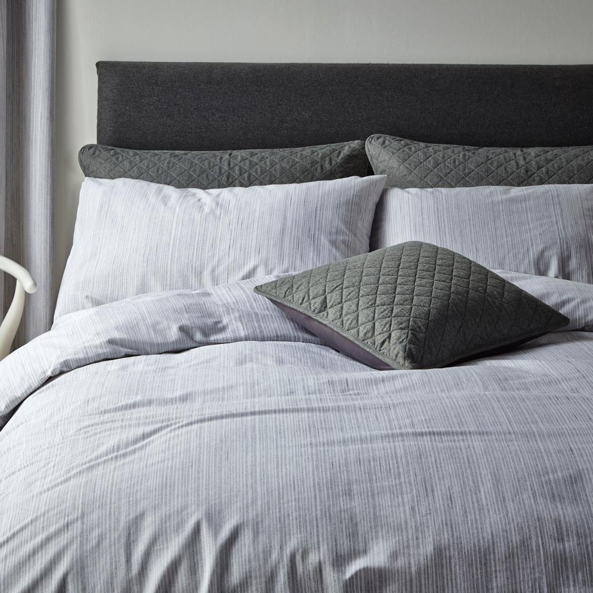 Crafted from woven polycotton, this duvet cover and matching pillowcase set features a light grey lined pattern and is available in a range of sizes.