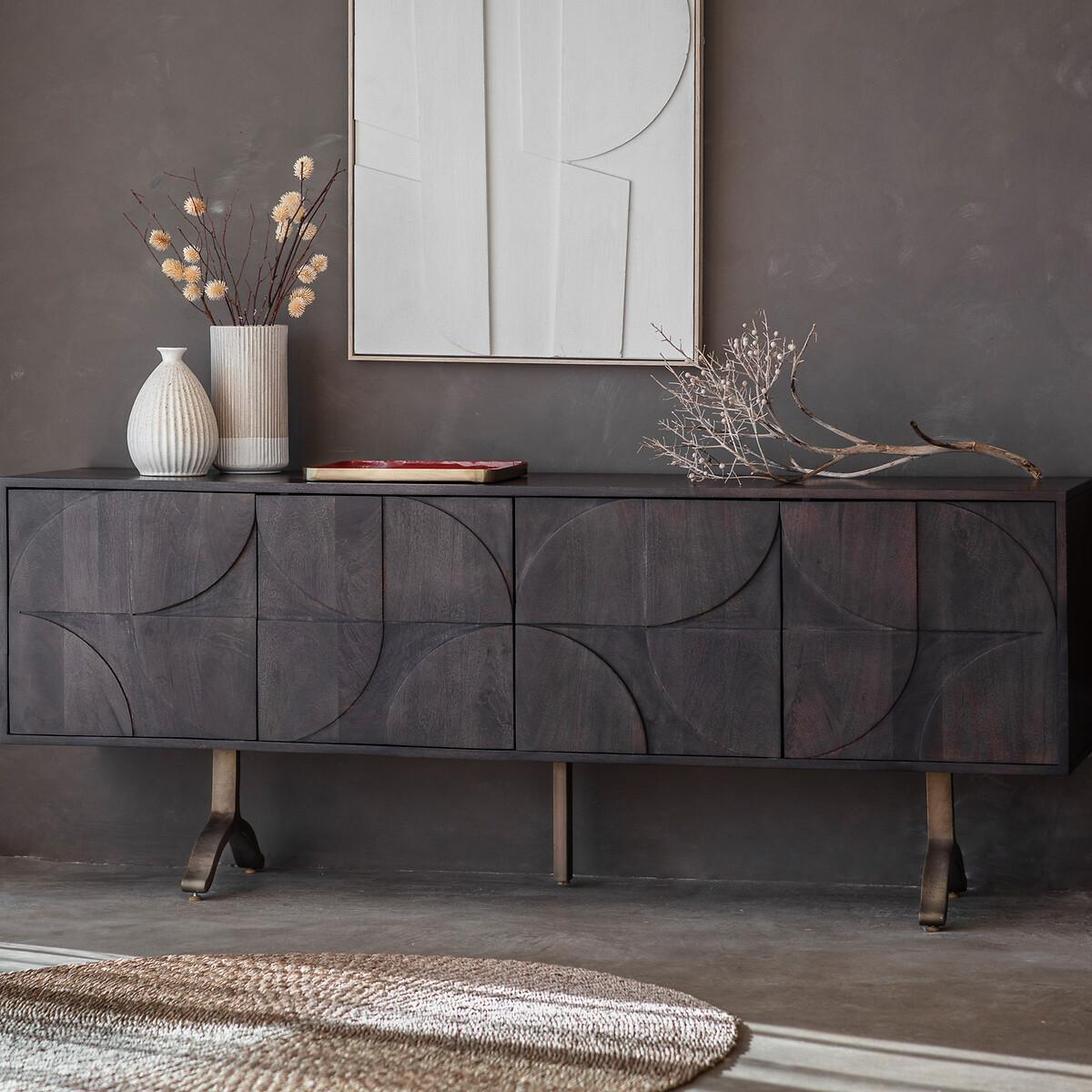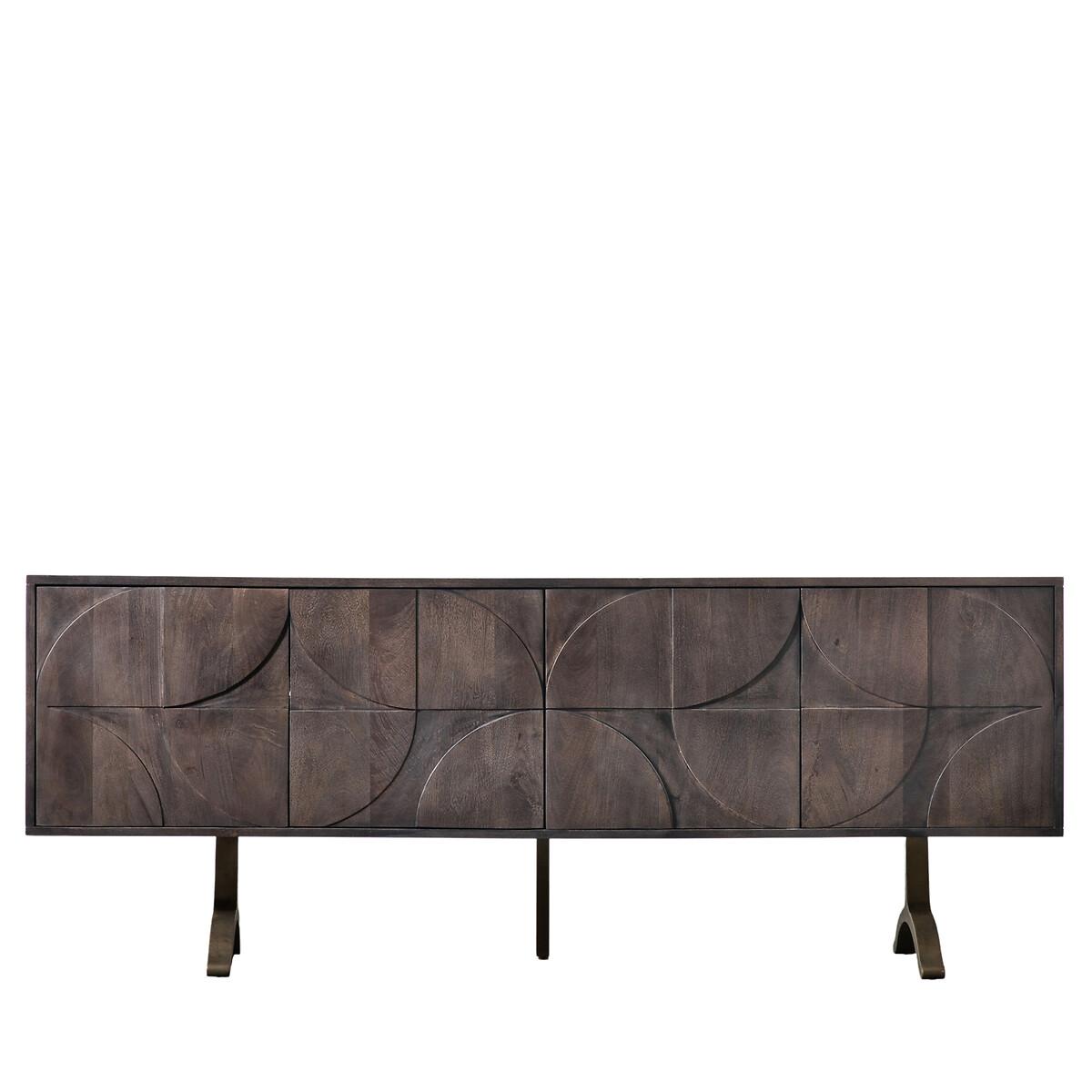 Unusual, eye-catching sideboard crafted from solid mango wood. A stained finish highlights the natural grain of the wood and adds a slightly charcoal grey tone. The doors feature a geometric relief pattern with a Bauhaus influence, with the unusual shape of the legs adding the finishing design detail. The doors have push-catch opening. Inside the sideboard are two cupboards, each with an adjustable shelf and a cable hole for added practicality. Product details. Geometric carved cupboard frontage4 doors 2 shelves (fixed) Assembly required (legs/feet only) Composition - Mago Wood MS / Iron. Product Dimensions - 40 cm x 180 cm x 70 cm, Weight - 56.8 KGInternal cupboard size - 44 x 35 x 40.5 cm Distance between shelves - 20 cm Package Dimensions - 190 cm x 58 cm x 50 cm, Weight - 65.4 kg. This product will be dispatched by one of our trusted suppliers. You’ll be contacted by their selected courier about your delivery. Please note: this product cannot be delivered to all Offshore Islands, Northern Ireland or Republic of Ireland.