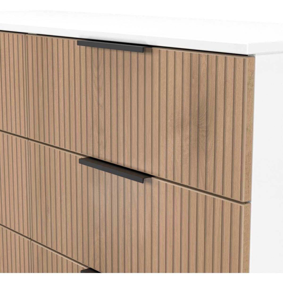 This double width 6 drawer chest of drawers is practical and stylish. Perfect for any home as a free standing storage unit. A strinking new range with a eye catching Slat Effect patten on the fronts or the doors and drawers, as well as sleek black metal handles. Modern and striking this range will stand out in any modern home. All our furniture is made in the United Kingdom, to the highest quality using responsibly sourced materials. It is delivered direct to your location of choice by one of our two man delivery teams, and comes fully assembled (although items with legs will have those legs removed during transit to avoid damage).