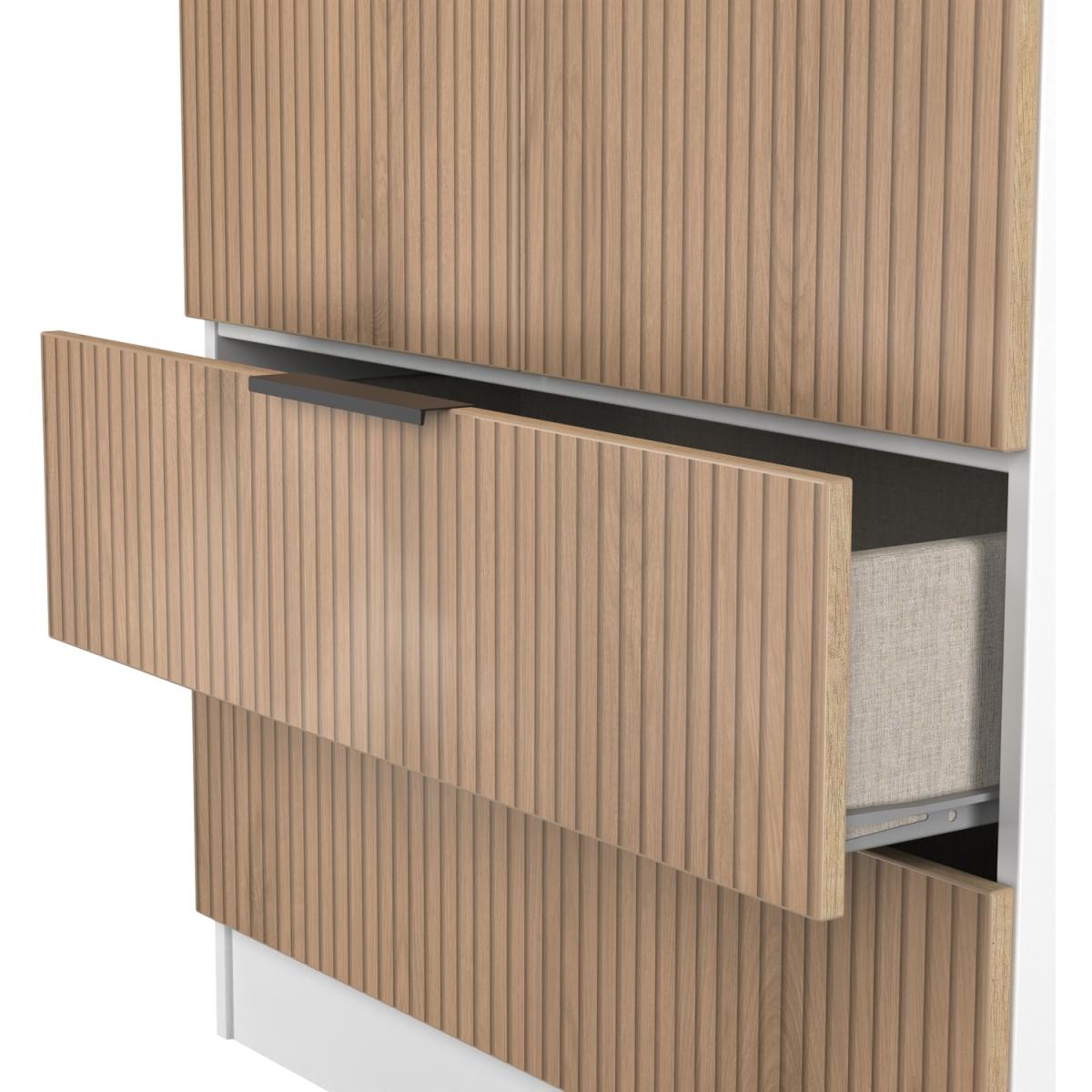 This tall double door wardrobe is perfect for any bedroom. Features the added practicality of 2 full width drawers. A strinking new range with a eye catching Slat Effect patten on the fronts or the doors and drawers, as well as sleek black metal handles. Modern and striking this range will stand out in any modern home. All our furniture is made in the United Kingdom, to the highest quality using responsibly sourced materials. It is delivered direct to your location of choice by one of our two man delivery teams, and comes fully assembled (although items with legs will have those legs removed during transit to avoid damage).