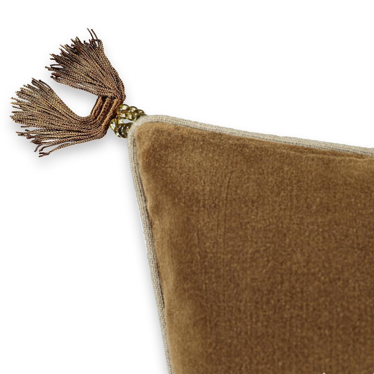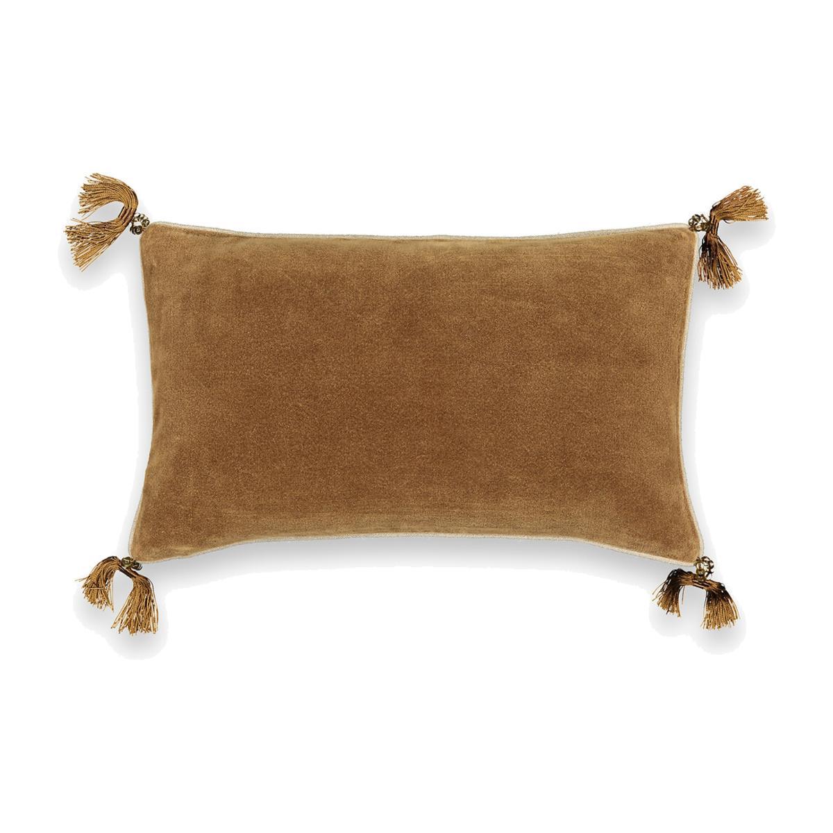 Javéa... a cotton velvet cushion cover in mineral colours. Precious details: 4 tassels composed of tone-on-tone pearls and cotton thread.