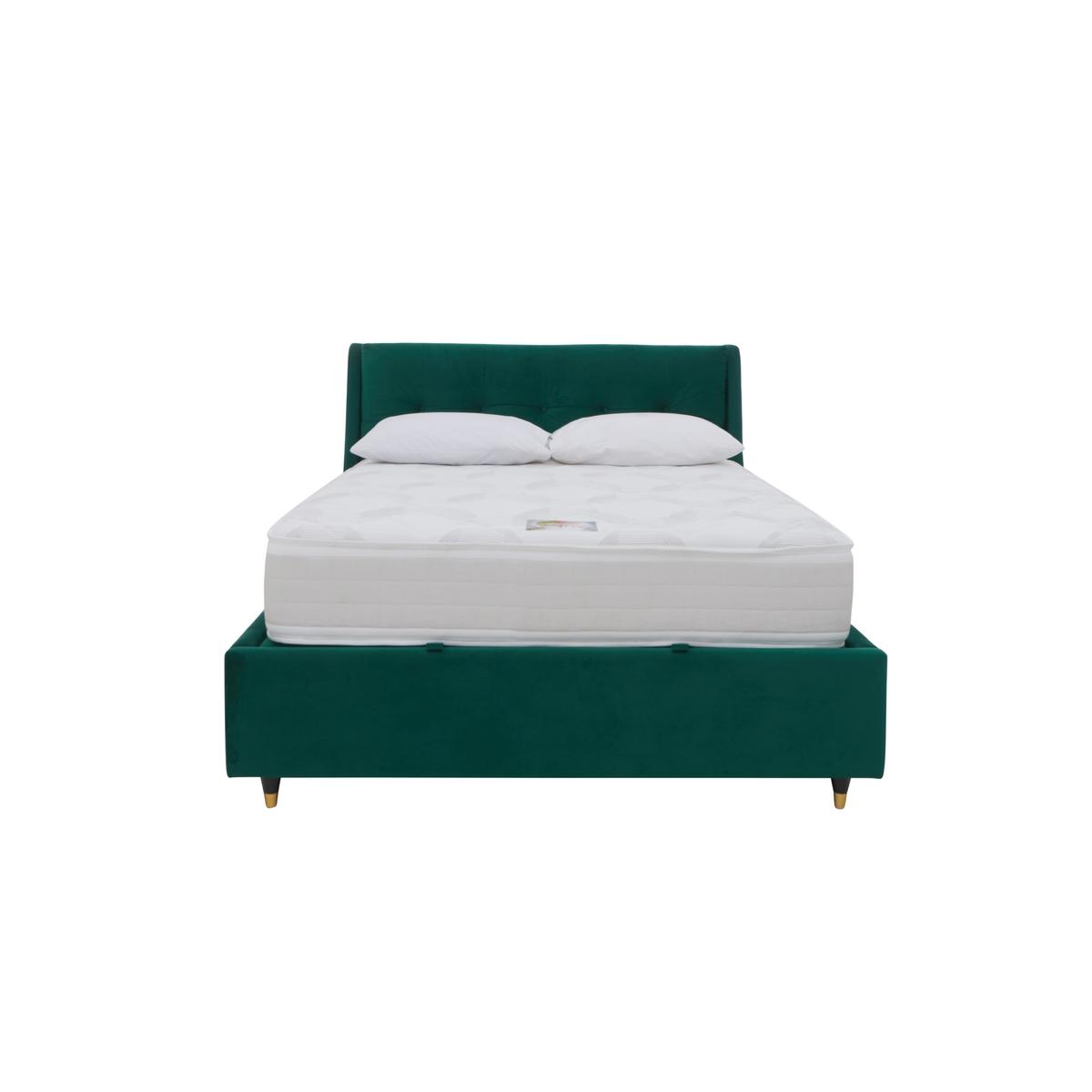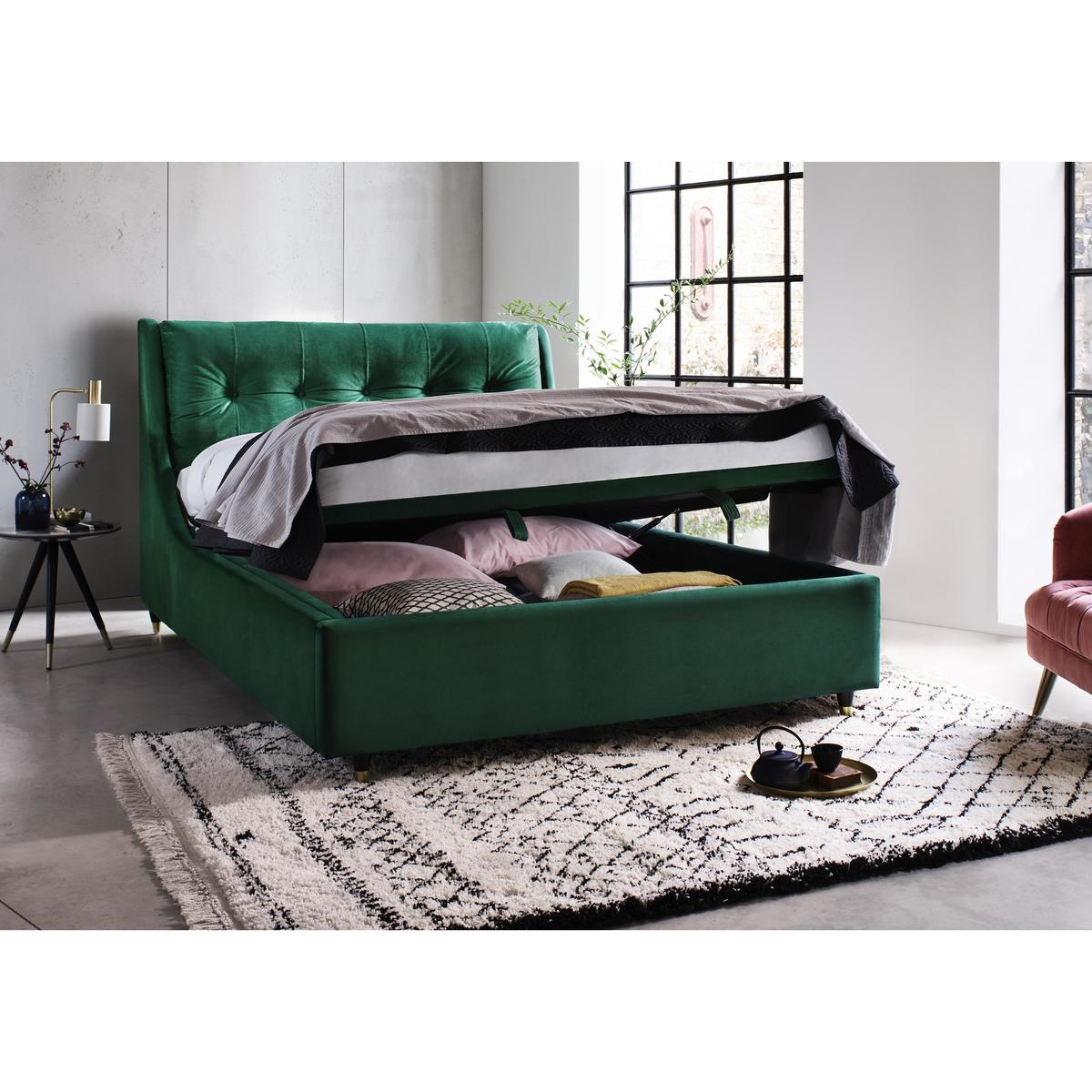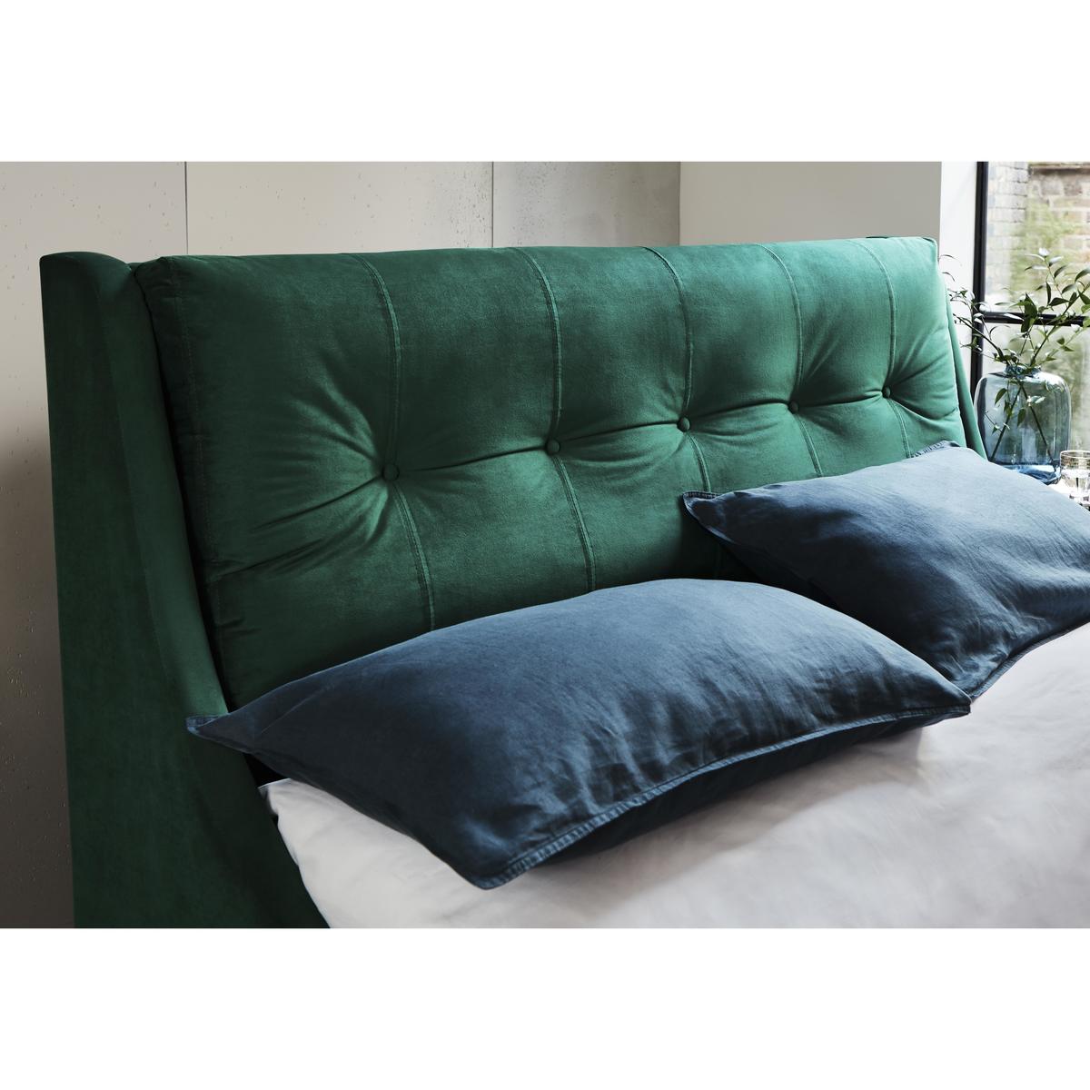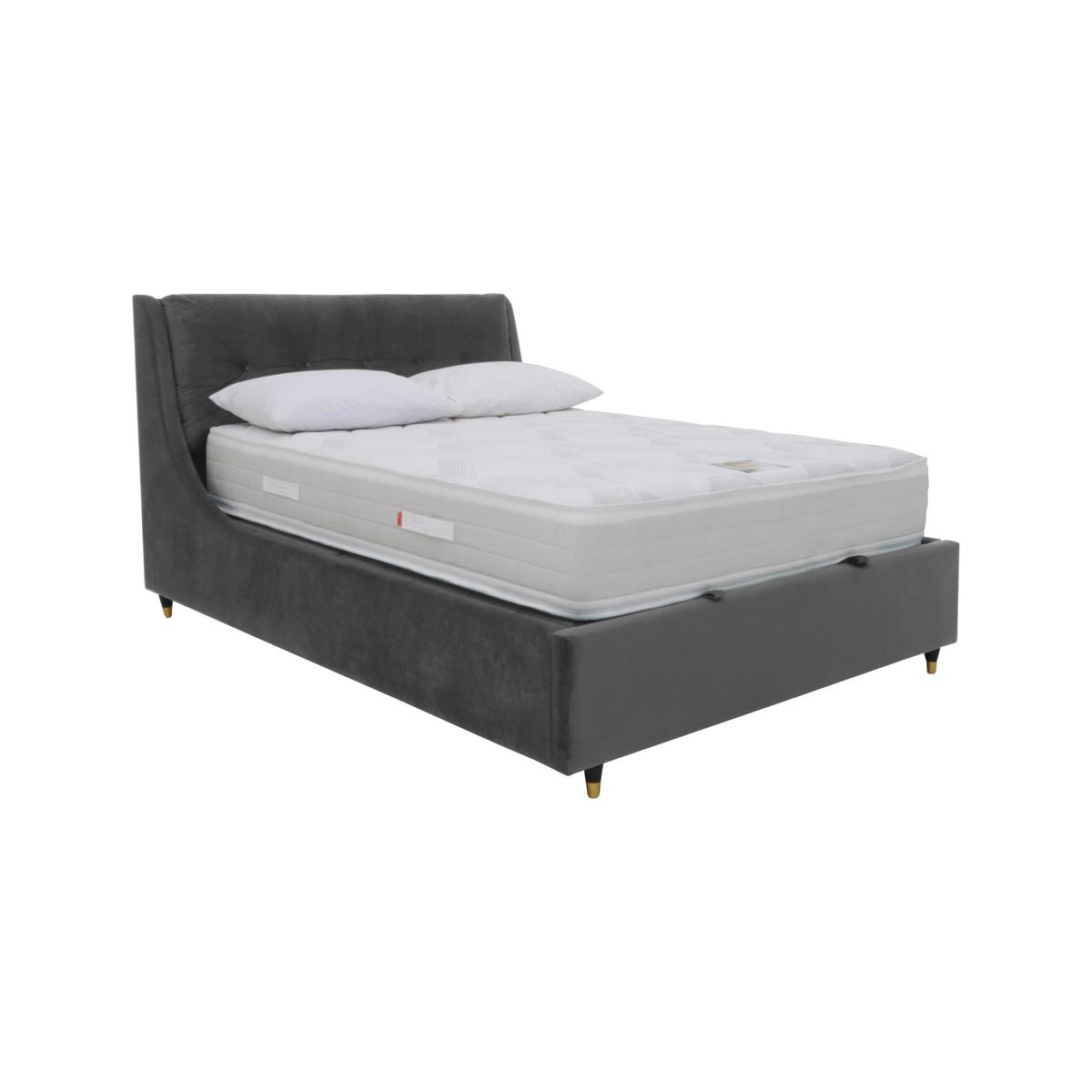 Style and comfort go hand in hand in the striking Javier ottoman bed frame. With its distinctive headboard featuring a cushioned pillow, so comfortable and supportive, this bed frame is the ideal place from which to watch a movie or enjoy a cup of tea. You’ll also appreciate the huge underbed storage space, beautiful upholstery, cool retro-inspired details – and the amazing value price. Only at Furniture Village. Contemporary ottoman bed frame. Usefully large underbed storage compartment. Great value and only at Furniture Village. More comfortable and arguably more stylish than the average bed frame, the one of a kind handcrafted Javier bed frame has a distinctive contemporary look that you’ll love – and at a very appealing price. Just take a look at the pillow back headboard, a unique design feature and one which has a very simple ulterior motive – your total comfort. The cushioned headboard, embellished with a simple row of buttoning, fits neatly and securely between the beautifully curved sides of the bed frame, and makes it easy to sit back and relax as you watch TV or read a book. Wood legs with gold-effect metal caps are a stylishly retro finishing touch. The gas-assisted lift mechanism is effortless to use, and as this bed frame is supported by three sturdy metal bars just above floor level – which gives it a stylish floating appearance – you’ll enjoy an exceptionally deep storage space with almost no storage weight limit. The Javier ottoman bed frame is offered in three beautiful upholstery fabrics and is available in double, king and super king bed sizes. Please note. The flattening and shading of heavy wear areas on pile fabrics like chenille and velvet is unavoidable. Pile fabrics may be vacuumed lightly using the curtain attachment, and brushed regularly in the direction of the pile with a soft brush. Please keep hands clear of the mechanism when opening and closing this ottoman bed frame. Mattress sold separately.