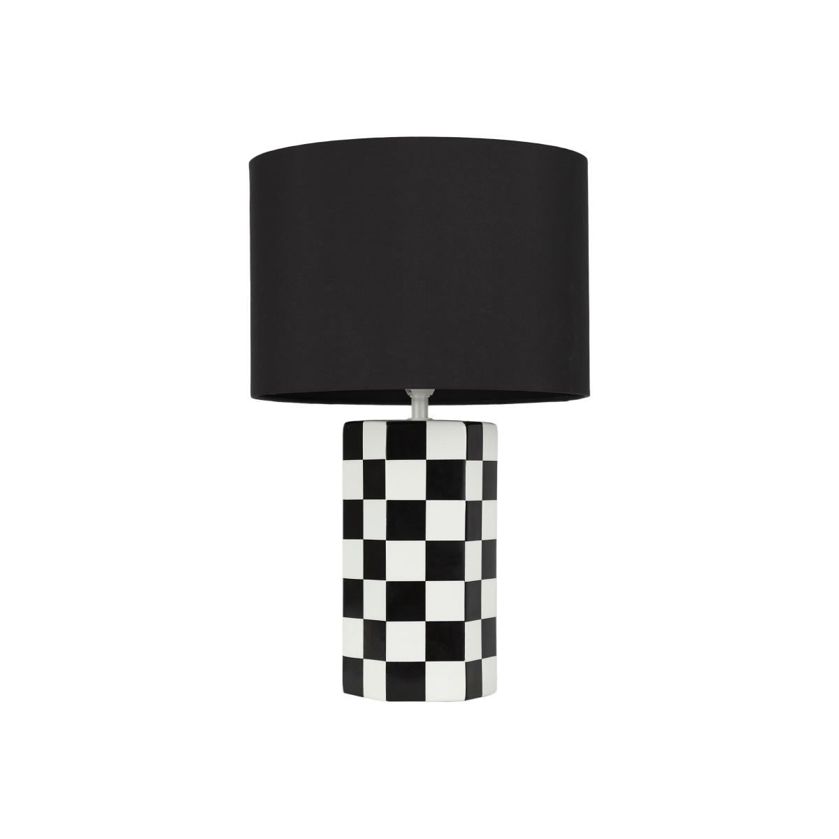 Fun, funky and guaranteed to make a statement, this Jaxon Checkered Table Lamp is the perfect choice for those looking to add a unique and fashionable lighting solution to their home. Featuring a striking black and white check design with a matching black shade, this fantastic lamp is a great choice for your bedroom, hallway or living room.